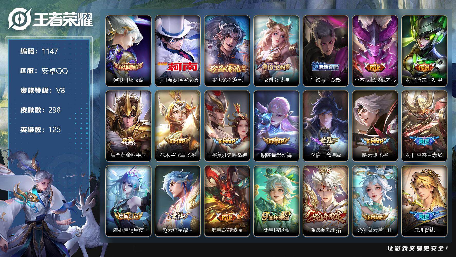 [11131982]【商品标题】:安卓Q-V8-最强王者段位-125英雄-298皮肤-1典藏-0珍品无双-0无双-2珍品传说-15传说-81史诗