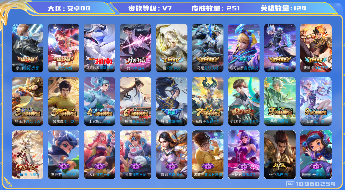 [10960254]【商品标题】:安卓Q-V7-最强王者段位-124英雄-251皮肤-2典藏-0珍品无双-0无双-2珍品传说-7传说-72史诗