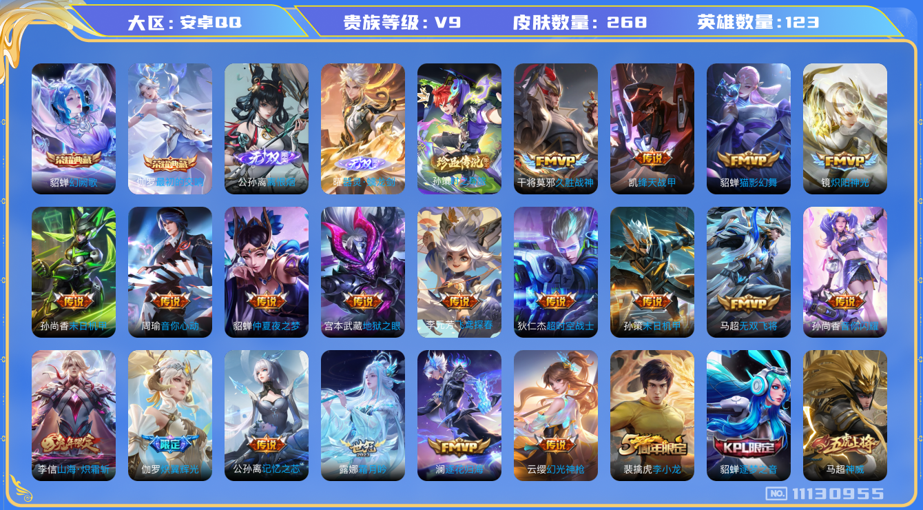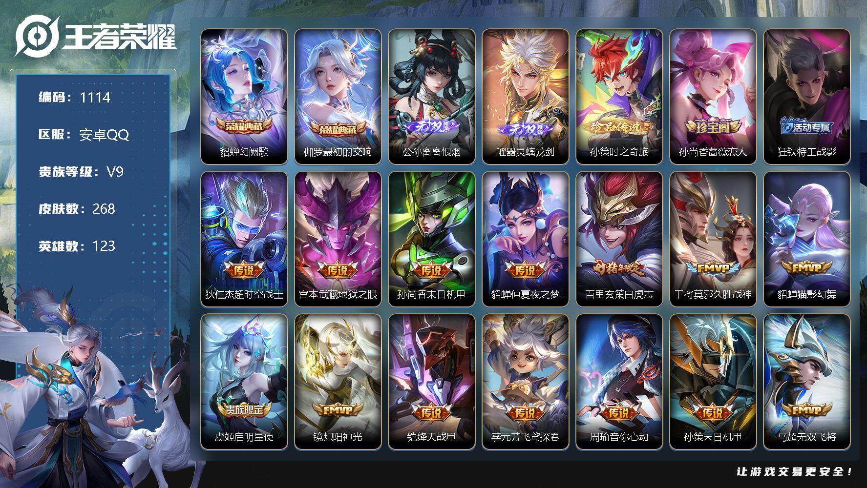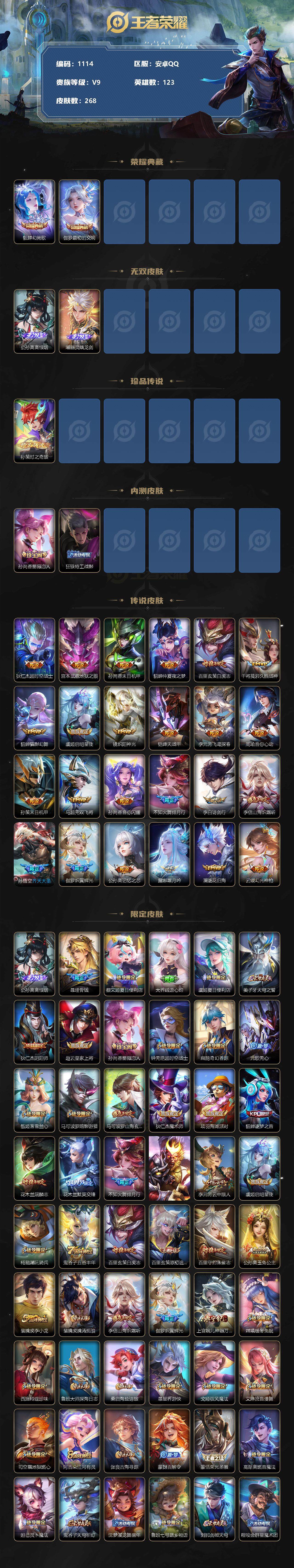 [11130955]【商品标题】:安卓Q-V6-永恒钻石I段位-123英雄-268皮肤-2典藏-0珍品无双-2无双-1珍品传说-24传说-82史诗