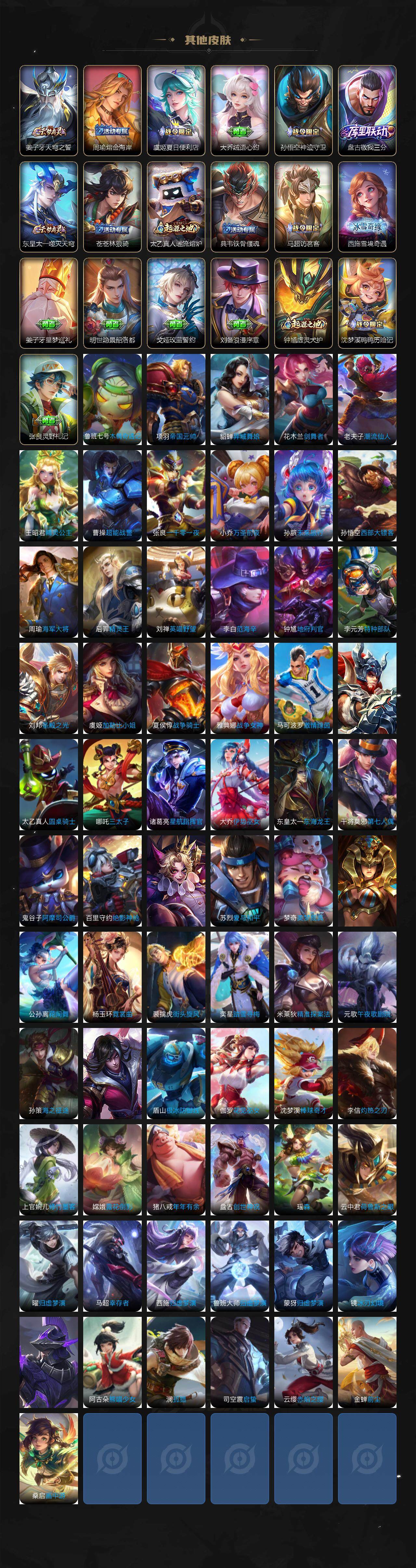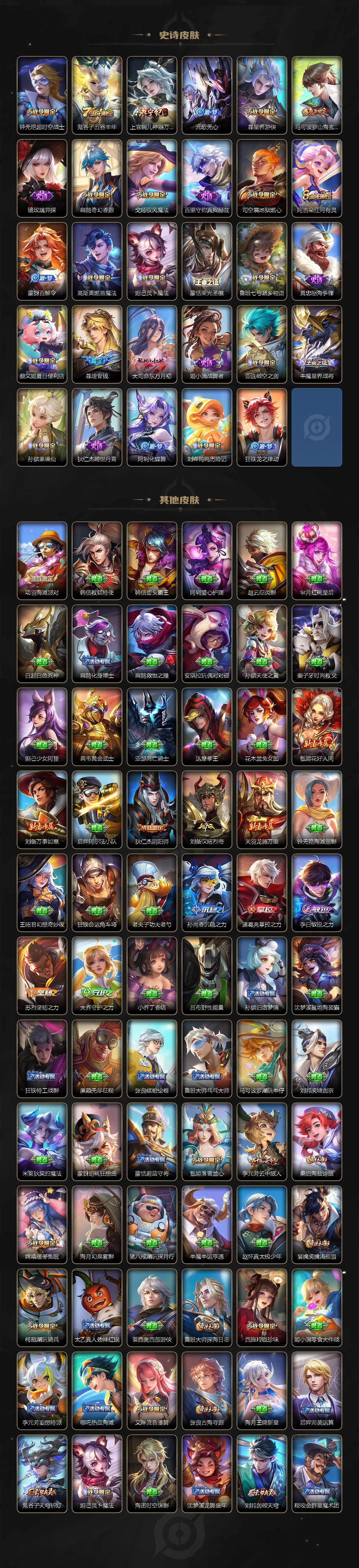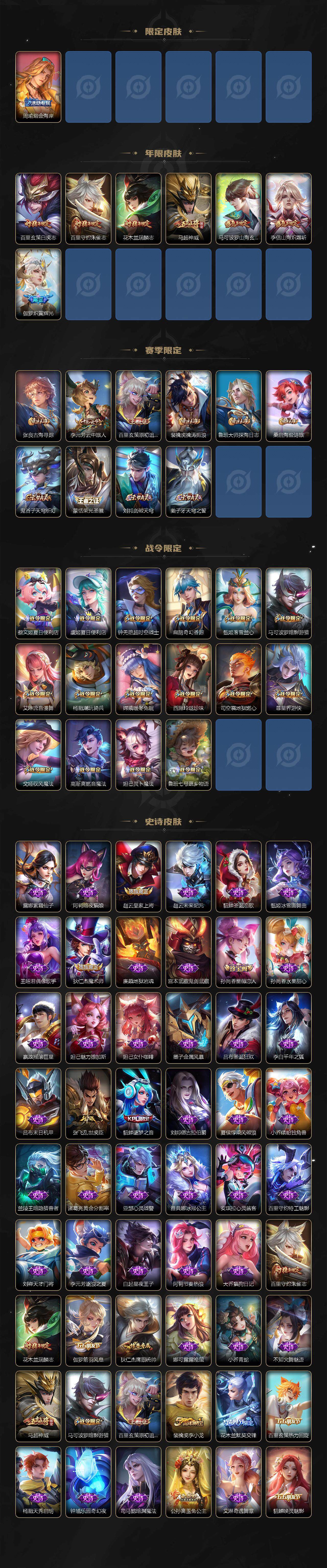 【限定皮肤】:公孙离离恨烟,暃埋骨钱,蔡文姬夏日便利店,大乔绒语心约,虞姬夏日便利店,姜子牙天穹之誓,狄仁杰阴阳师,赵云皇家上将,孙尚香蔷薇恋人,钟无艳超时空战士,扁鹊奇幻香踪,元歌无心,甄姬落雪兰心,马可波罗暗影游猎,马可波罗山海玄木吟,狄仁杰魔术师,项羽海滩派对,貂蝉逐梦之音,花木兰瑞麟志,花木兰默契交锋,不知火舞绯月行,孙悟空齐天大圣,李元芳云中旅人,虞姬启明星使,杨戬潮玩骑兵,鬼谷子五谷丰年,百里玄策白虎志,百里玄策原初追逐者,百里守约朱雀志,公孙离玉兔公主,裴擒虎李小龙,裴擒虎擒涛扼浪,李信山海炽霜斩,伽罗炽翼辉光,上官婉儿神器万象笔,嫦娥暖冬兔眠,西施玲珑珍味,鲁班大师探海日志,桑启海盐诗旅,暃星界游侠,戈娅驭风魔法,艾琳流音漫舞,司空震地狱燃心,阿古朵江河有灵,张良古海寻踪,蒙犽百解令,蒙恬荣光圣徽,高渐离燃音魔法,妲己灵卜魔法,鬼谷子天穹祈灯,沈梦溪龙舞盛年,鲁班七号蔬乡物语,刘邦剑破天穹,程咬金群星魔术团,周瑜熔金海岸