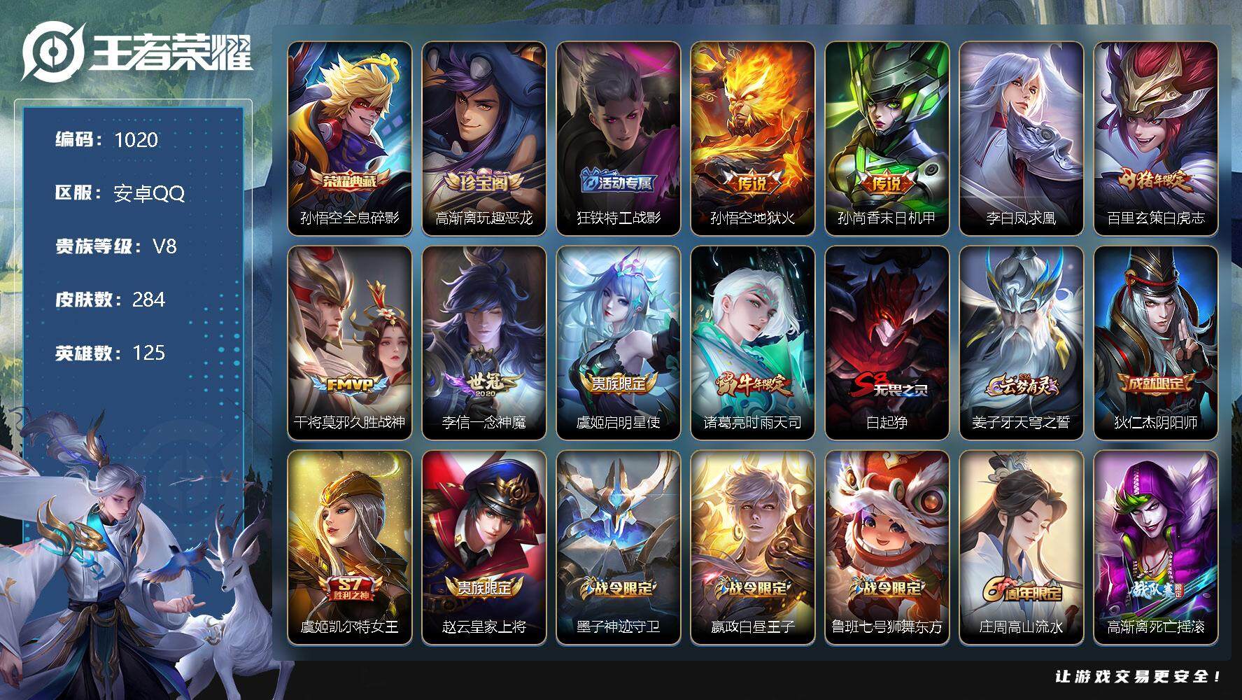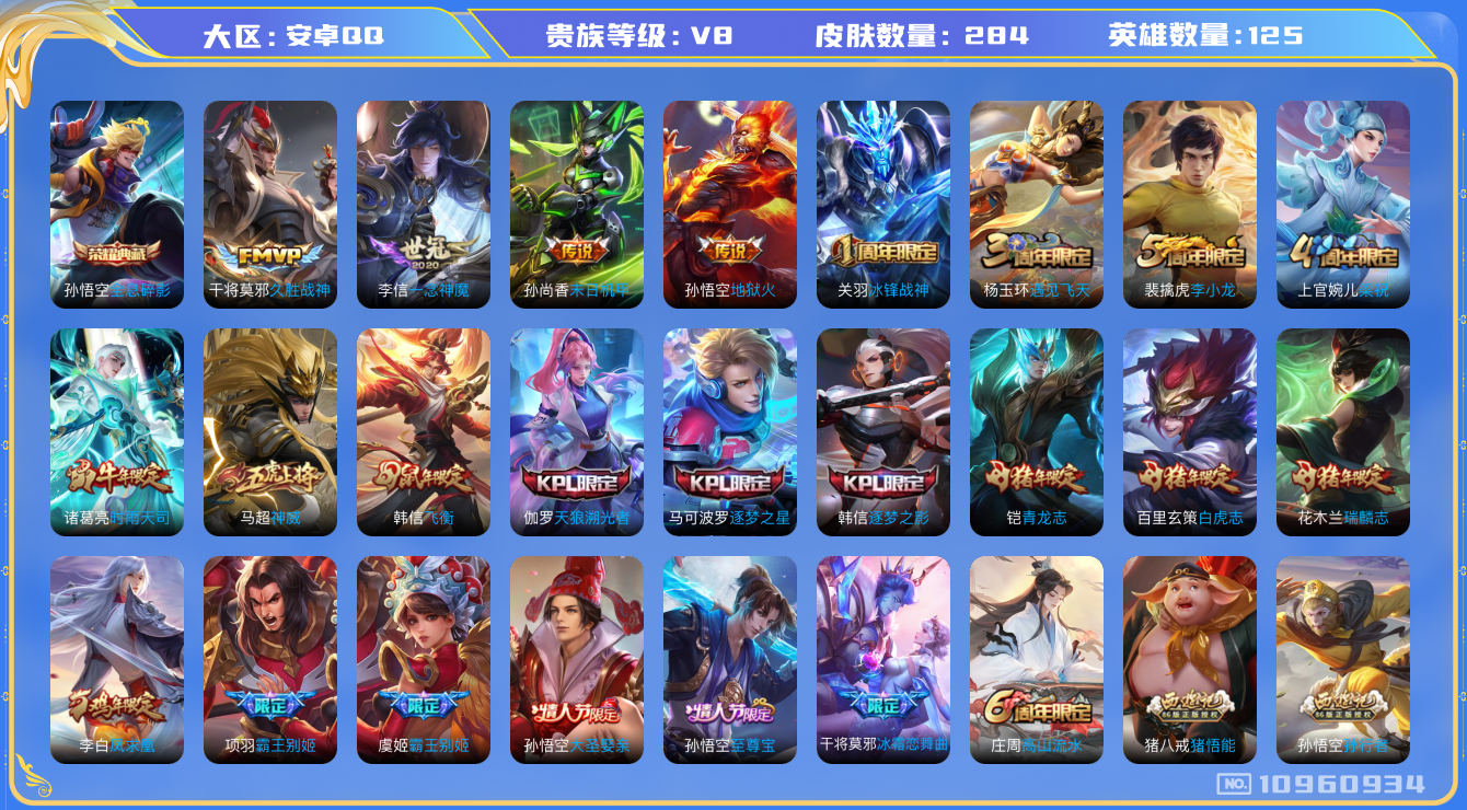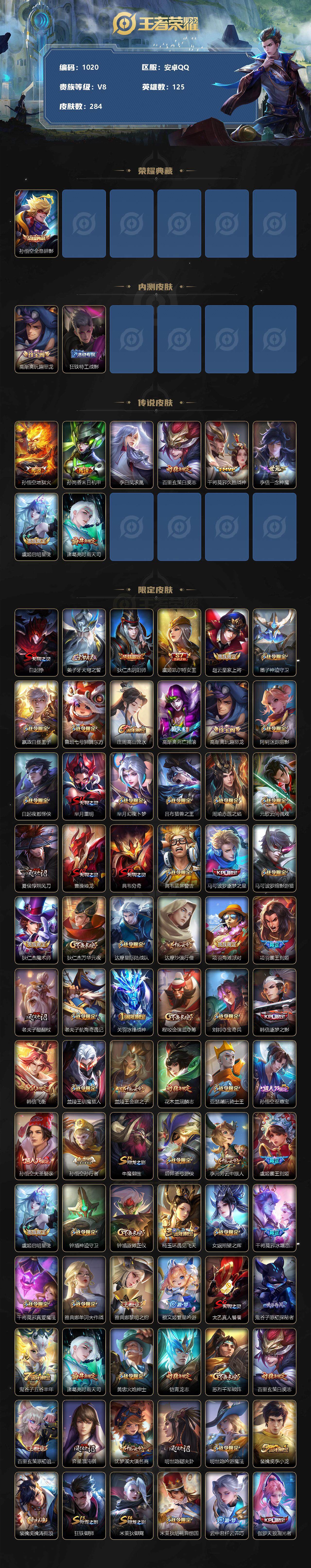 [10960934]【商品标题】:安卓Q-V8-至尊星耀IV段位-125英雄-284皮肤-1典藏-0珍品无双-0无双-0珍品传说-8传说-76史诗