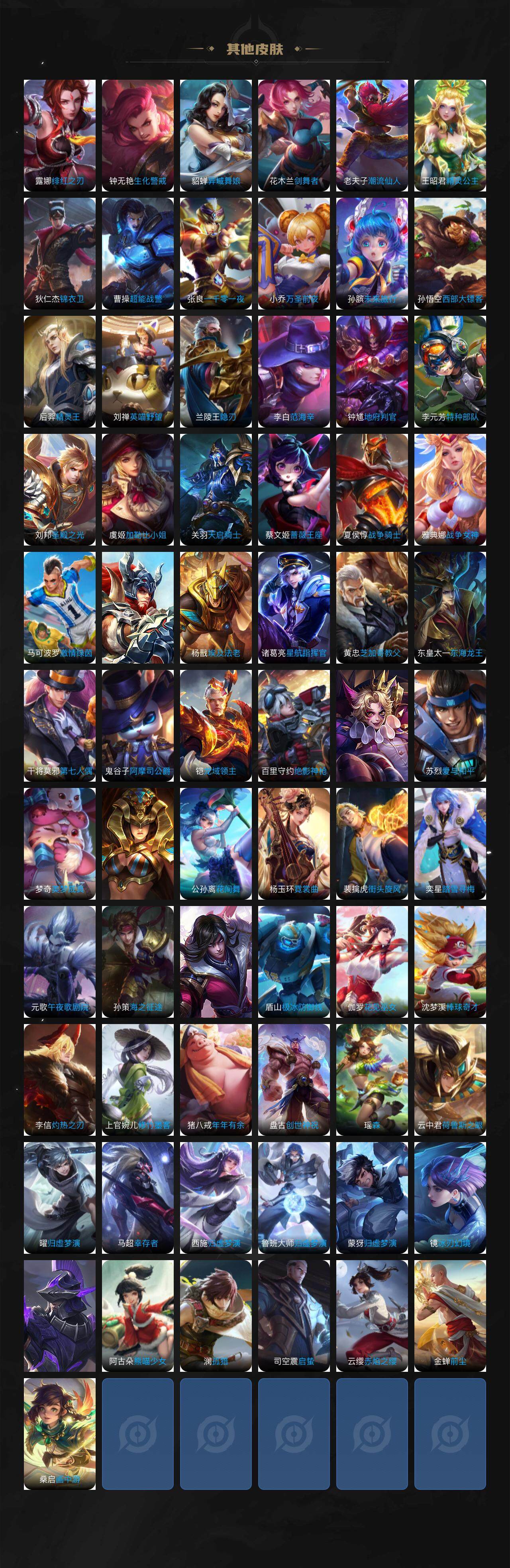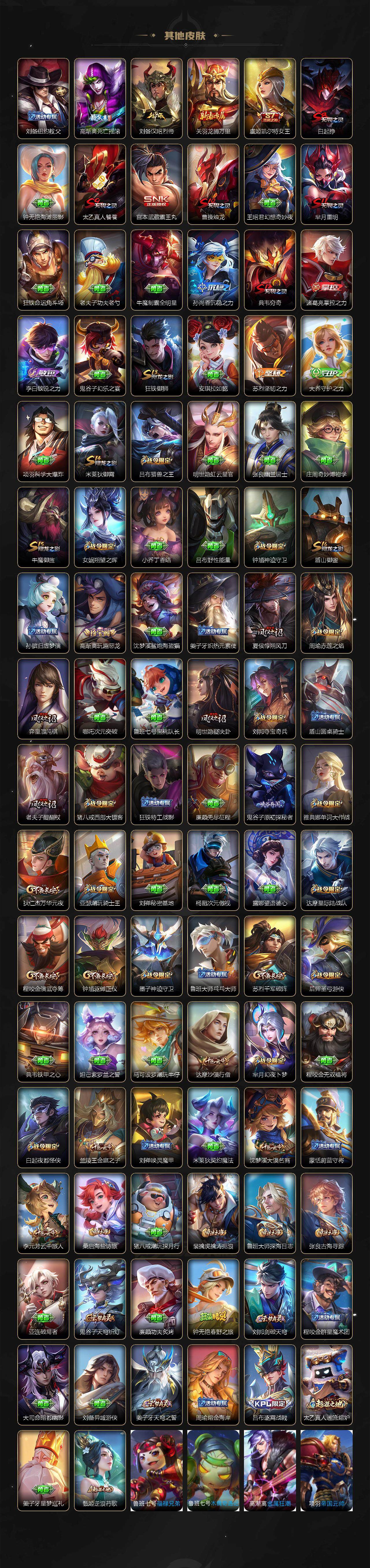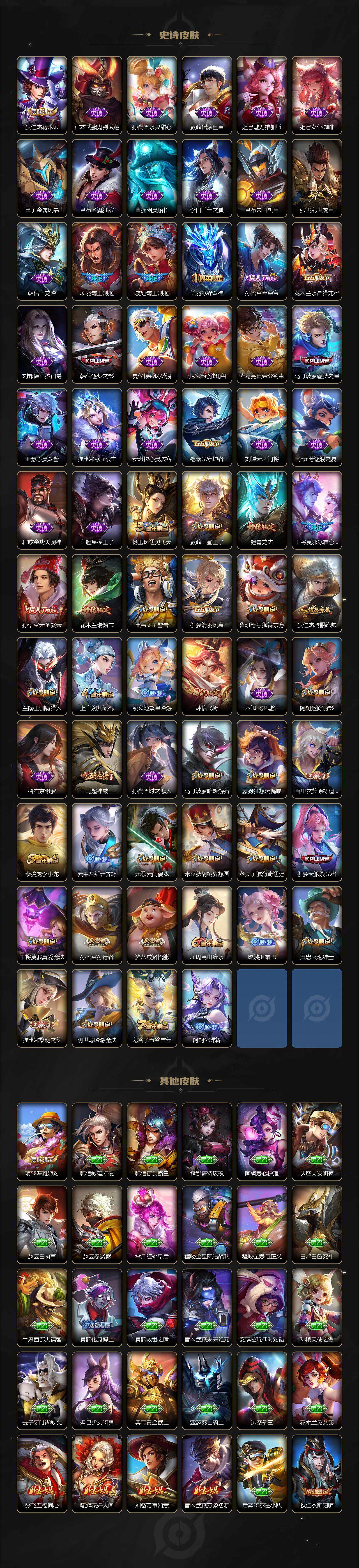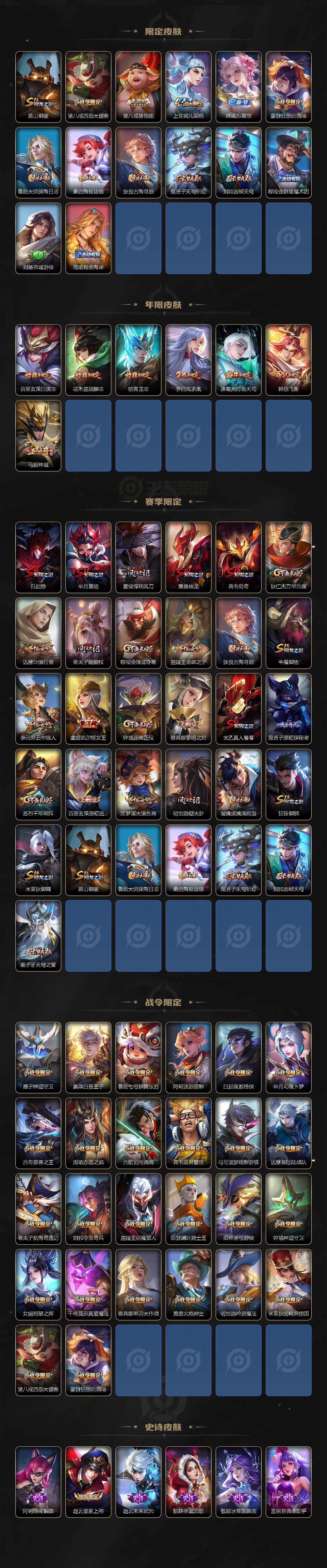 【限定皮肤】:白起狰,姜子牙天穹之誓,狄仁杰阴阳师,虞姬凯尔特女王,赵云皇家上将,墨子神迹守卫,嬴政白昼王子,鲁班七号狮舞东方,庄周高山流水,高渐离死亡摇滚,高渐离玩趣恶龙,阿轲迷踪丽影,白起夜都怪侠,芈月重明,芈月幻夜卜梦,吕布猎兽之王,周瑜赤莲之焰,元歌云间偶戏,夏侯惇朔风刀,曹操烛龙,典韦穷奇,典韦蓝屏警告,马可波罗逐梦之星,马可波罗暗影游猎,狄仁杰魔术师,狄仁杰万华元夜,达摩星际陆战队,达摩沙漠行僧,项羽海滩派对,项羽霸王别姬,老夫子醍醐杖,老夫子航海奇遇记,关羽冰锋战神,程咬金演武夺筹,刘邦夺宝奇兵,韩信逐梦之影,韩信飞衡,兰陵王驯魔猎人,兰陵王金庭之子,花木兰瑞麟志,亚瑟潮玩骑士王,孙悟空至尊宝,孙悟空大圣娶亲,孙悟空孙行者,牛魔御旌,后羿圣弓游侠,李元芳云中旅人,虞姬霸王别姬,虞姬启明星使,钟馗神迹守卫,钟馗驱傩正仪,杨玉环遇见飞天,女娲朔望之晖,干将莫邪冰霜恋舞曲,干将莫邪真爱魔法,雅典娜单词大作战,雅典娜黎明之约,蔡文姬繁星吟游,太乙真人饕餮,鬼谷子原初探秘者,鬼谷子五谷丰年,诸葛亮时雨天司,黄忠火炮绅士,铠青龙志,苏烈千军破阵,百里玄策白虎志,百里玄策原初追逐者,弈星混沌棋,沈梦溪大漠名商,明世隐疑决卦,明世隐吟游魔法,裴擒虎李小龙,裴擒虎擒涛扼浪,狂铁御狮,米莱狄御霄,米莱狄胡桃异想国,云中君纤云弄巧,伽罗天狼溯光者,盾山御銮,猪八戒西部大镖客,猪八戒猪悟能,上官婉儿梁祝,嫦娥拒霜思,蒙犽狂想玩偶喵,鲁班大师探海日志,桑启海盐诗旅,张良古海寻踪,鬼谷子天穹祈灯,刘邦剑破天穹,程咬金群星魔术团,刘备异域游侠,周瑜熔金海岸