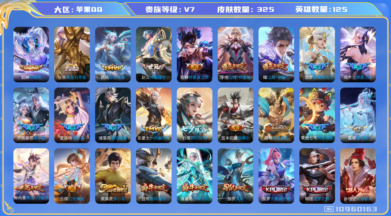 [10960163]【商品标题】:苹果Q-V7-最强王者段位-125英雄-325皮肤-1典藏-0珍品无双-0无双-0珍品传说-32传说-99史诗