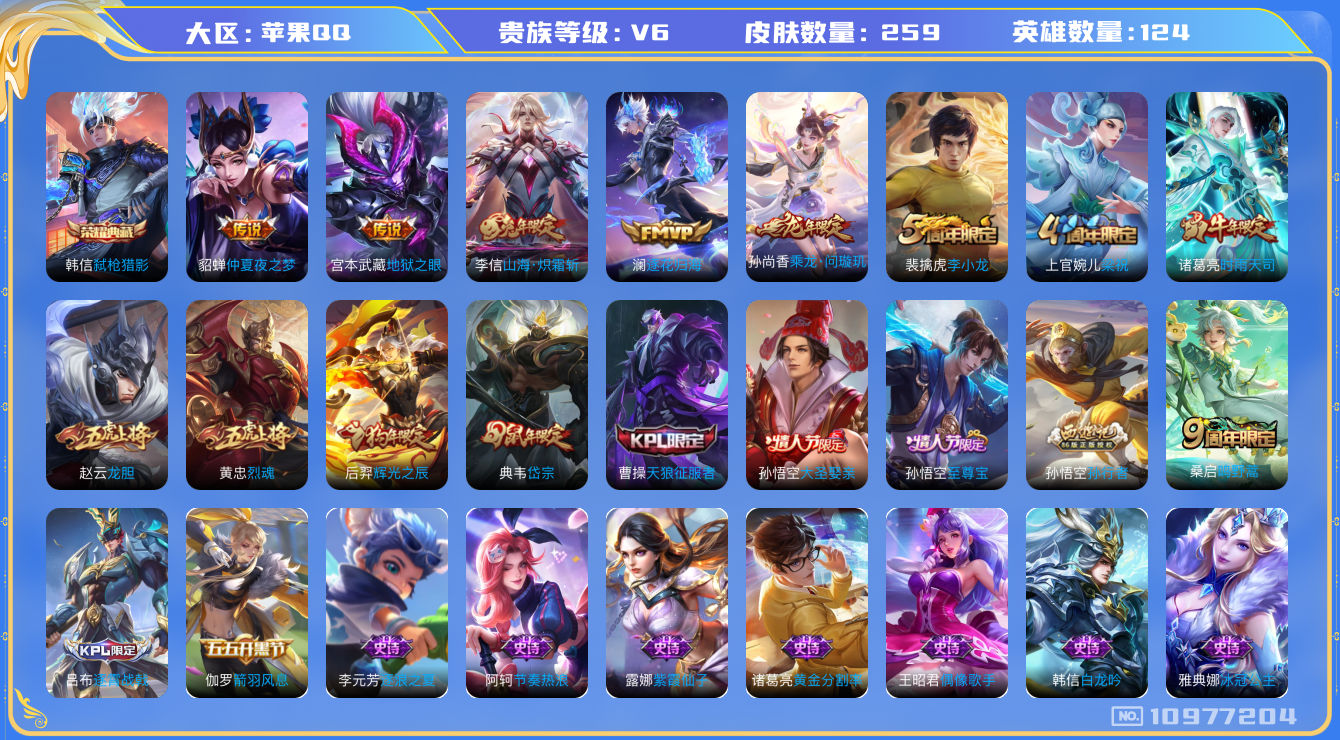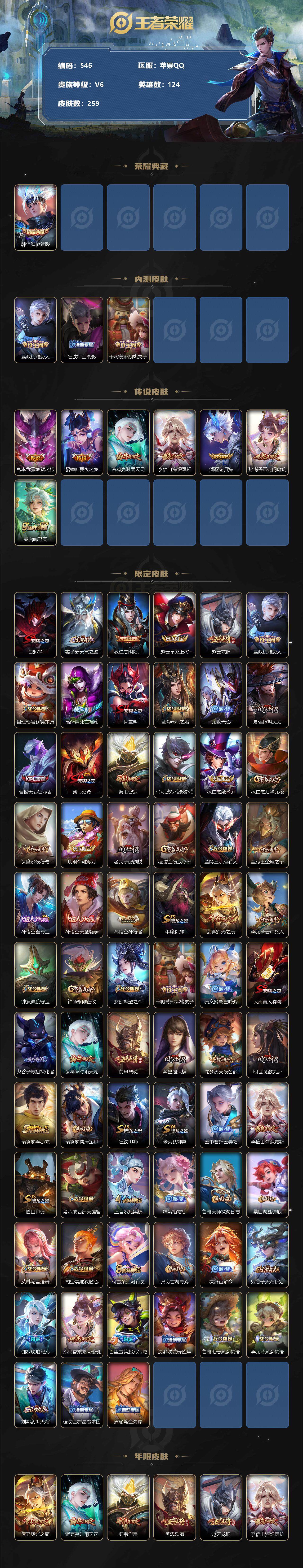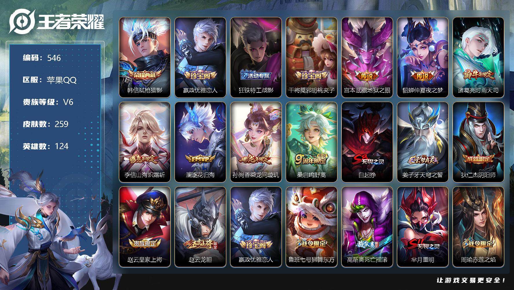 [10977204]【商品标题】:苹果Q-V6-至尊星耀IV段位-124英雄-259皮肤-1典藏-0珍品无双-0无双-0珍品传说-7传说-58史诗