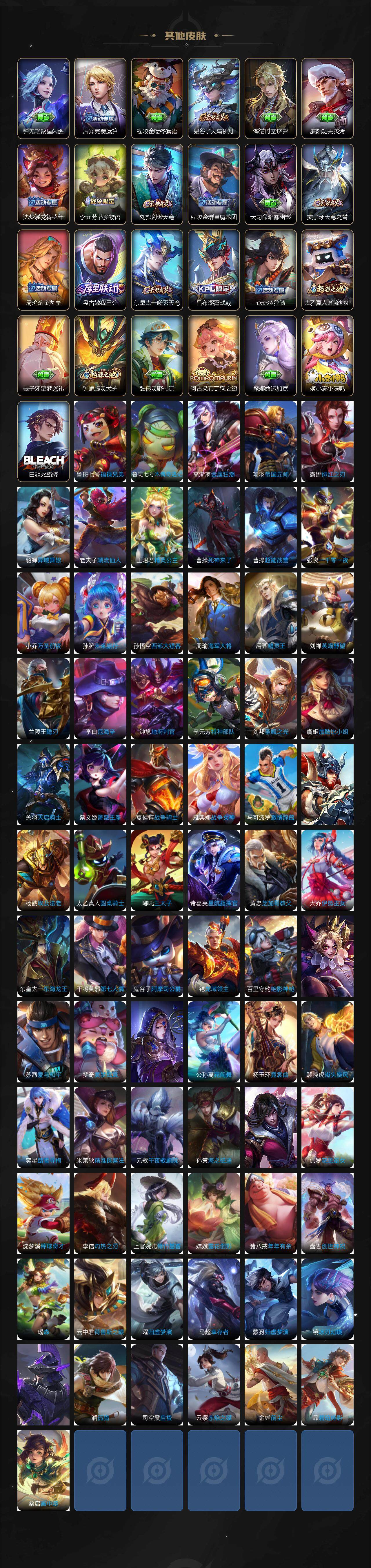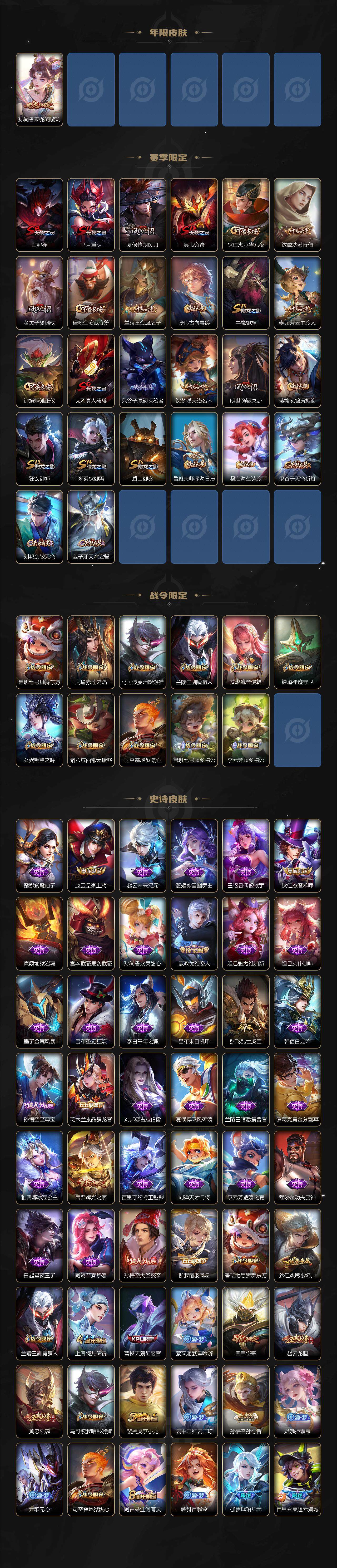 【限定皮肤】:白起狰,姜子牙天穹之誓,狄仁杰阴阳师,赵云皇家上将,赵云龙胆,嬴政优雅恋人,鲁班七号狮舞东方,高渐离死亡摇滚,芈月重明,周瑜赤莲之焰,元歌无心,夏侯惇朔风刀,曹操天狼征服者,典韦穷奇,典韦岱宗,马可波罗暗影游猎,狄仁杰魔术师,狄仁杰万华元夜,达摩沙漠行僧,项羽海滩派对,老夫子醍醐杖,程咬金演武夺筹,兰陵王驯魔猎人,兰陵王金庭之子,孙悟空至尊宝,孙悟空大圣娶亲,孙悟空孙行者,牛魔御旌,后羿辉光之辰,李元芳云中旅人,钟馗神迹守卫,钟馗驱傩正仪,女娲朔望之晖,干将莫邪胡桃夹子,蔡文姬繁星吟游,太乙真人饕餮,鬼谷子原初探秘者,诸葛亮时雨天司,黄忠烈魂,弈星混沌棋,沈梦溪大漠名商,明世隐疑决卦,裴擒虎李小龙,裴擒虎擒涛扼浪,狂铁御狮,米莱狄御霄,云中君纤云弄巧,李信山海炽霜斩,盾山御銮,猪八戒西部大镖客,上官婉儿梁祝,嫦娥拒霜思,鲁班大师探海日志,桑启海盐诗旅,艾琳流音漫舞,司空震地狱燃心,阿古朵江河有灵,张良古海寻踪,蒙犽百解令,鬼谷子天穹祈灯,伽罗琥珀纪元,孙尚香乘龙问璇玑,百里玄策超元猎域,沈梦溪龙舞盛年,鲁班七号蔬乡物语,李元芳蔬乡物语,刘邦剑破天穹,程咬金群星魔术团,周瑜熔金海岸