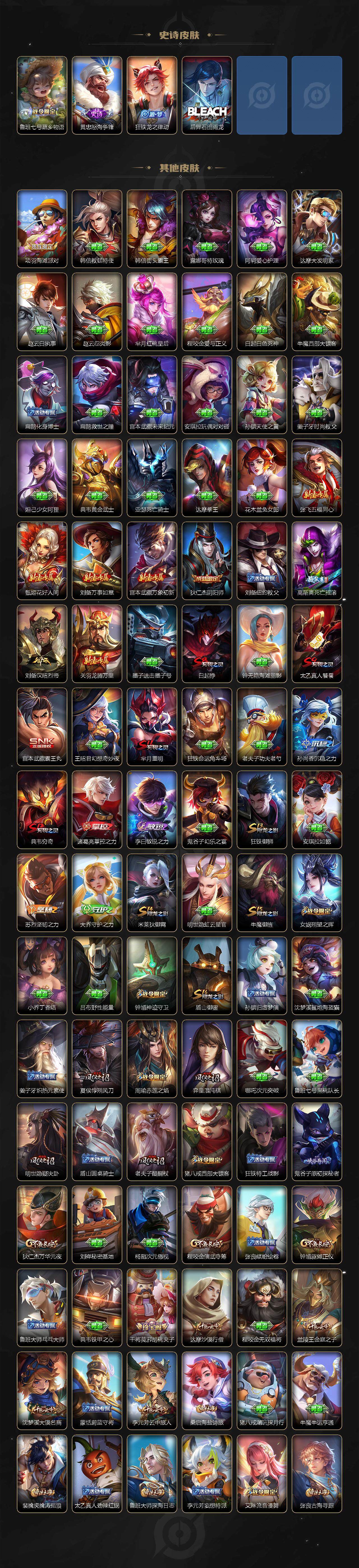 - PX_2093960-贵族8/皮肤252/典藏1/传说15/史诗79/英雄124/幻阙歌/曜器灵螭龙剑/马可波罗怪盗基德/嫦娥器灵落星盏/特工战影/云鹰飞将/启明星使/淬星耀世/无双飞将/诗剑行/山海炽霜斩/无限倾心男/浮生妄/妄想实况/鹤归松栖女/时之奇旅大乔/霜月吟/乘龙铭钟鼎/桑启鸣野蒿/澜愿照九州拓/蔡文姬夏日便利店/虞姬夏日便利店/姜子牙天穹之誓/杨戬破阵退雄兵/狄仁杰阴阳师/赵云皇家上
