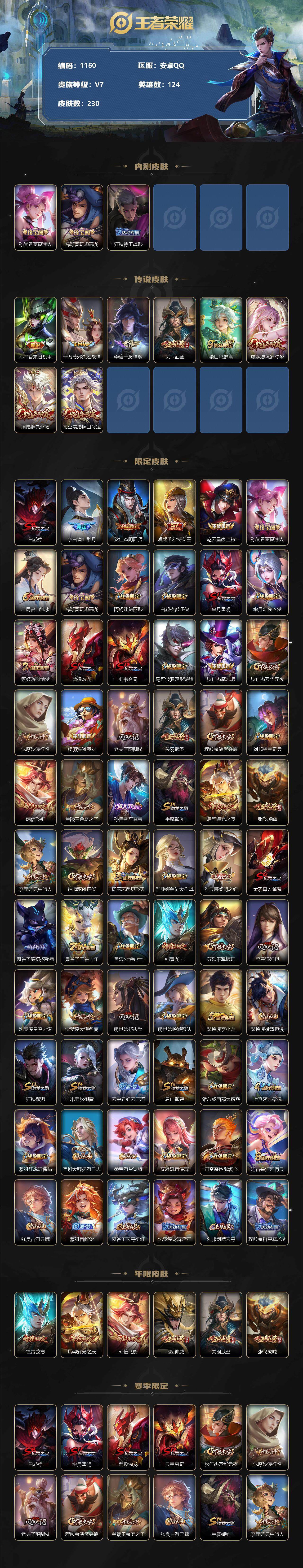 - PX_2095935-实名: 可修改 贵族等级: V5 英雄数: 124 皮肤数: 163 传说皮: 乘龙·问璇玑 限定皮: 李小龙,梁祝,御风骁将,引擎之心,飞衡,大圣娶亲,五谷丰年,山海·玄木吟,鸣野蒿,逐霄战戟
