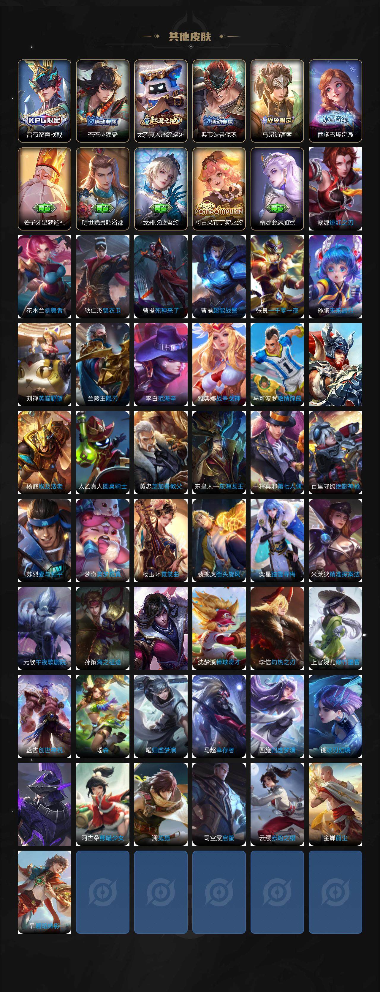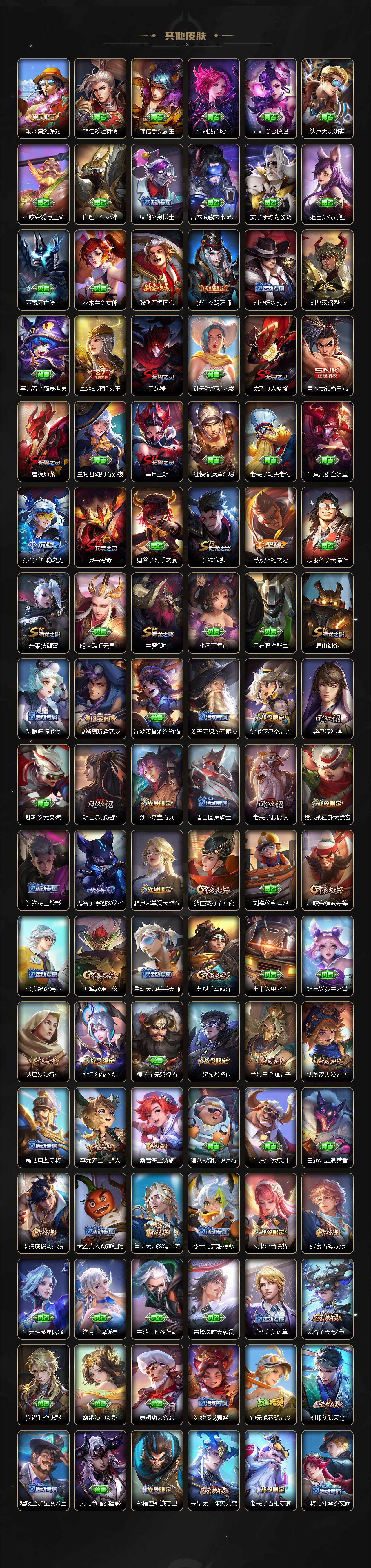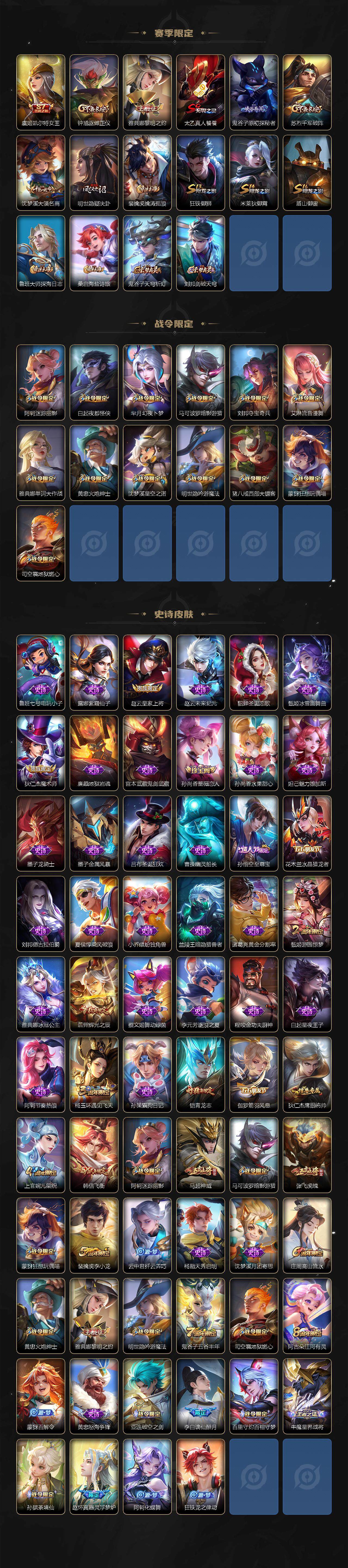 【限定皮肤】:白起狰,李白谪仙醉月,狄仁杰阴阳师,虞姬凯尔特女王,赵云皇家上将,孙尚香蔷薇恋人,庄周高山流水,高渐离玩趣恶龙,阿轲迷踪丽影,白起夜都怪侠,芈月重明,芈月幻夜卜梦,甄姬游园惊梦,曹操烛龙,典韦穷奇,马可波罗暗影游猎,狄仁杰魔术师,狄仁杰万华元夜,达摩沙漠行僧,项羽海滩派对,老夫子醍醐杖,关羽武圣,程咬金演武夺筹,刘邦夺宝奇兵,韩信飞衡,兰陵王金庭之子,孙悟空至尊宝,牛魔御旌,后羿辉光之辰,张飞虎魄,李元芳云中旅人,钟馗驱傩正仪,杨玉环遇见飞天,雅典娜单词大作战,雅典娜黎明之约,太乙真人饕餮,鬼谷子原初探秘者,鬼谷子五谷丰年,黄忠火炮绅士,铠青龙志,苏烈千军破阵,弈星混沌棋,沈梦溪星空之诺,沈梦溪大漠名商,明世隐疑决卦,明世隐吟游魔法,裴擒虎李小龙,裴擒虎擒涛扼浪,狂铁御狮,米莱狄御霄,云中君纤云弄巧,盾山御銮,猪八戒西部大镖客,上官婉儿梁祝,蒙犽狂想玩偶喵,鲁班大师探海日志,桑启海盐诗旅,艾琳流音漫舞,司空震地狱燃心,阿古朵江河有灵,张良古海寻踪,蒙犽百解令,鬼谷子天穹祈灯,沈梦溪龙舞盛年,刘邦剑破天穹,程咬金群星魔术团