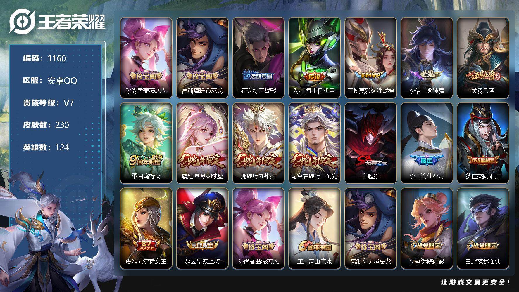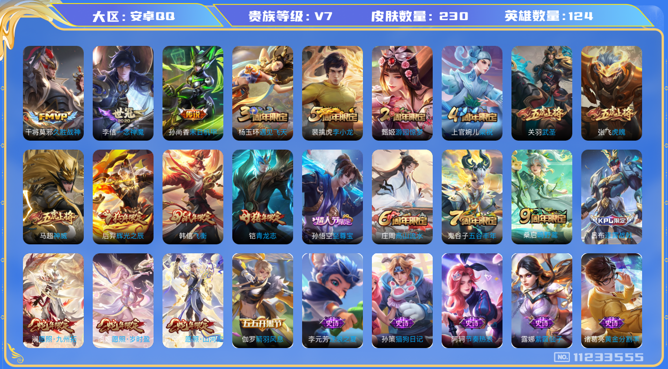 [11233555]【商品标题】:安卓Q-V7-至尊星耀III段位-124英雄-230皮肤-0典藏-0珍品无双-0无双-0珍品传说-8传说-64史诗