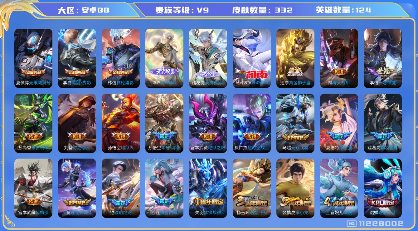 [11228002]【商品标题】:安卓Q-V9-至尊星耀IV段位-124英雄-332皮肤-3典藏-0珍品无双-2无双-1珍品传说-24传说-86史诗