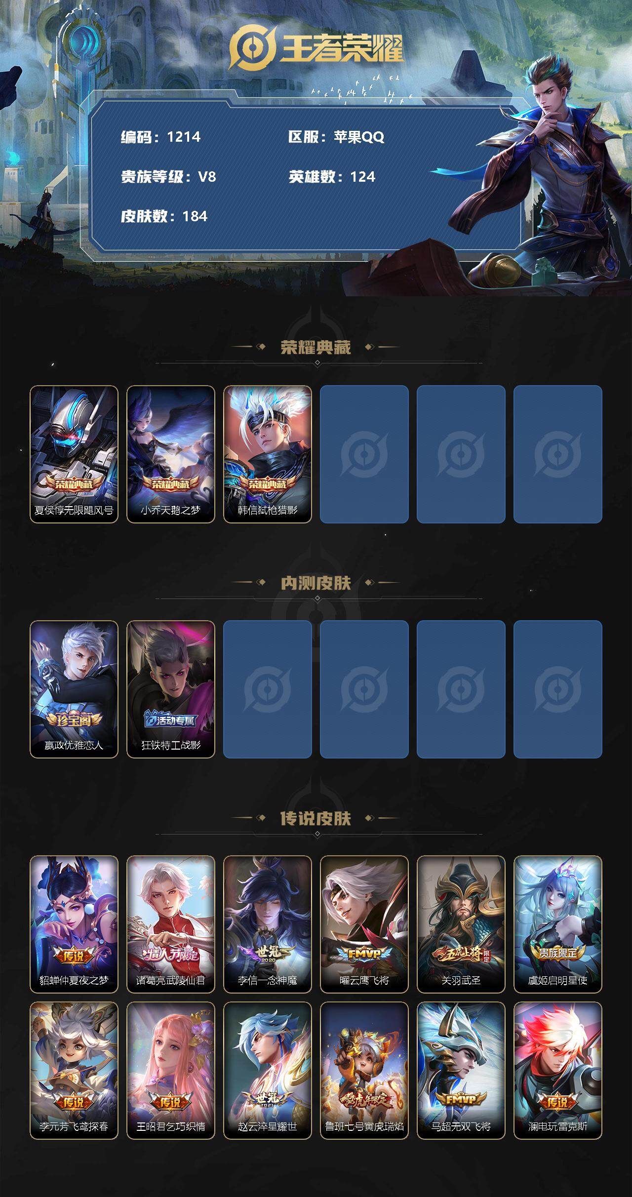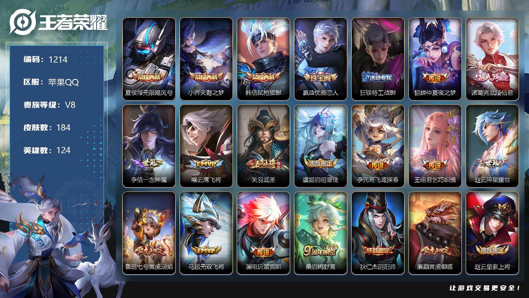 [11228532]【商品标题】:苹果Q-V0-尊贵铂金I段位-124英雄-184皮肤-3典藏-0珍品无双-0无双-0珍品传说-13传说-66史诗