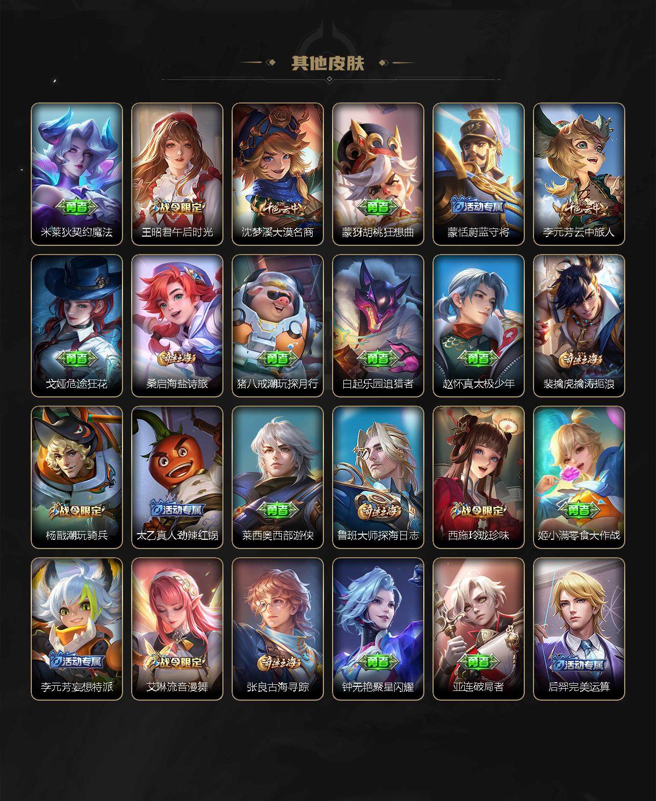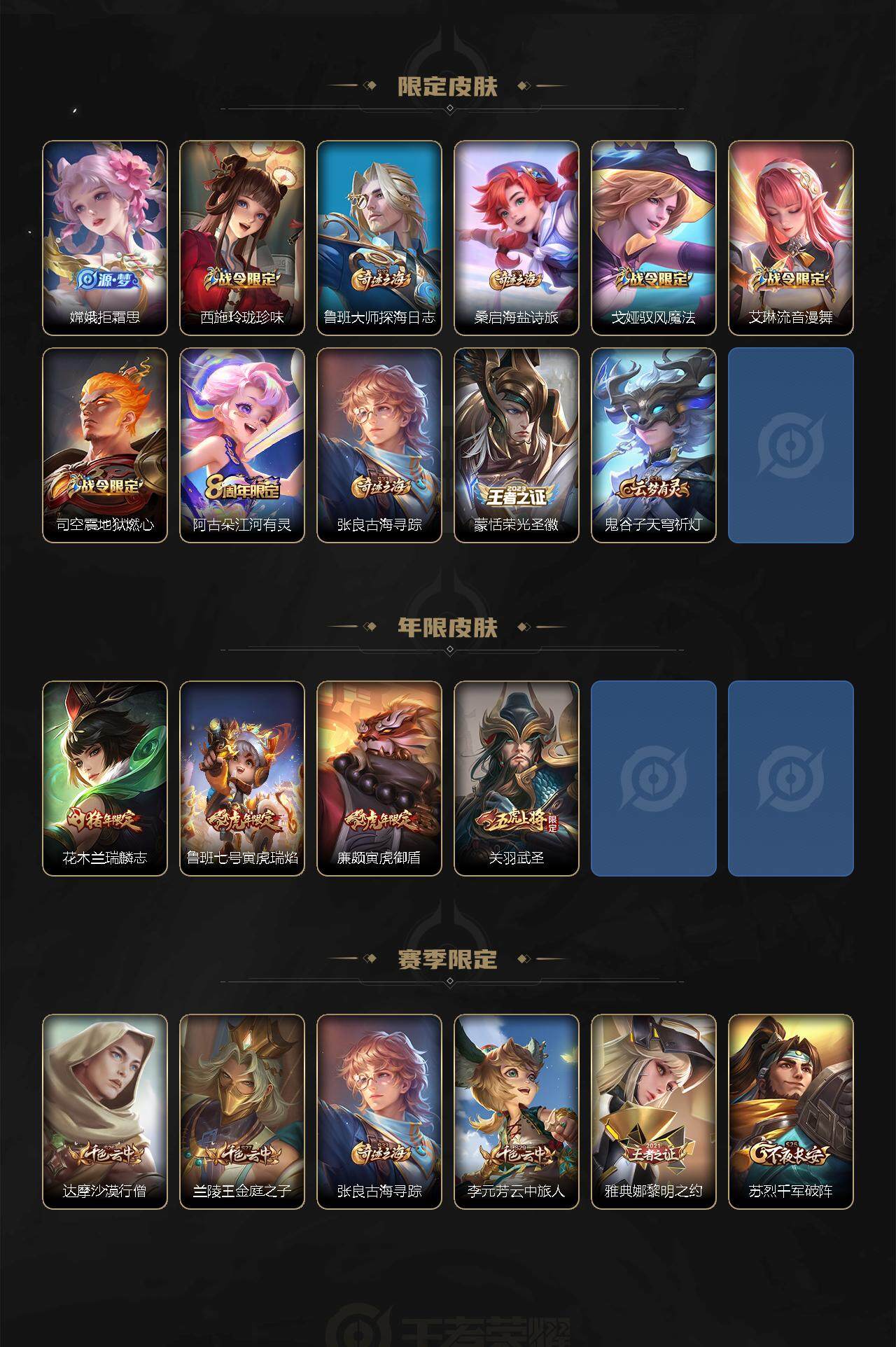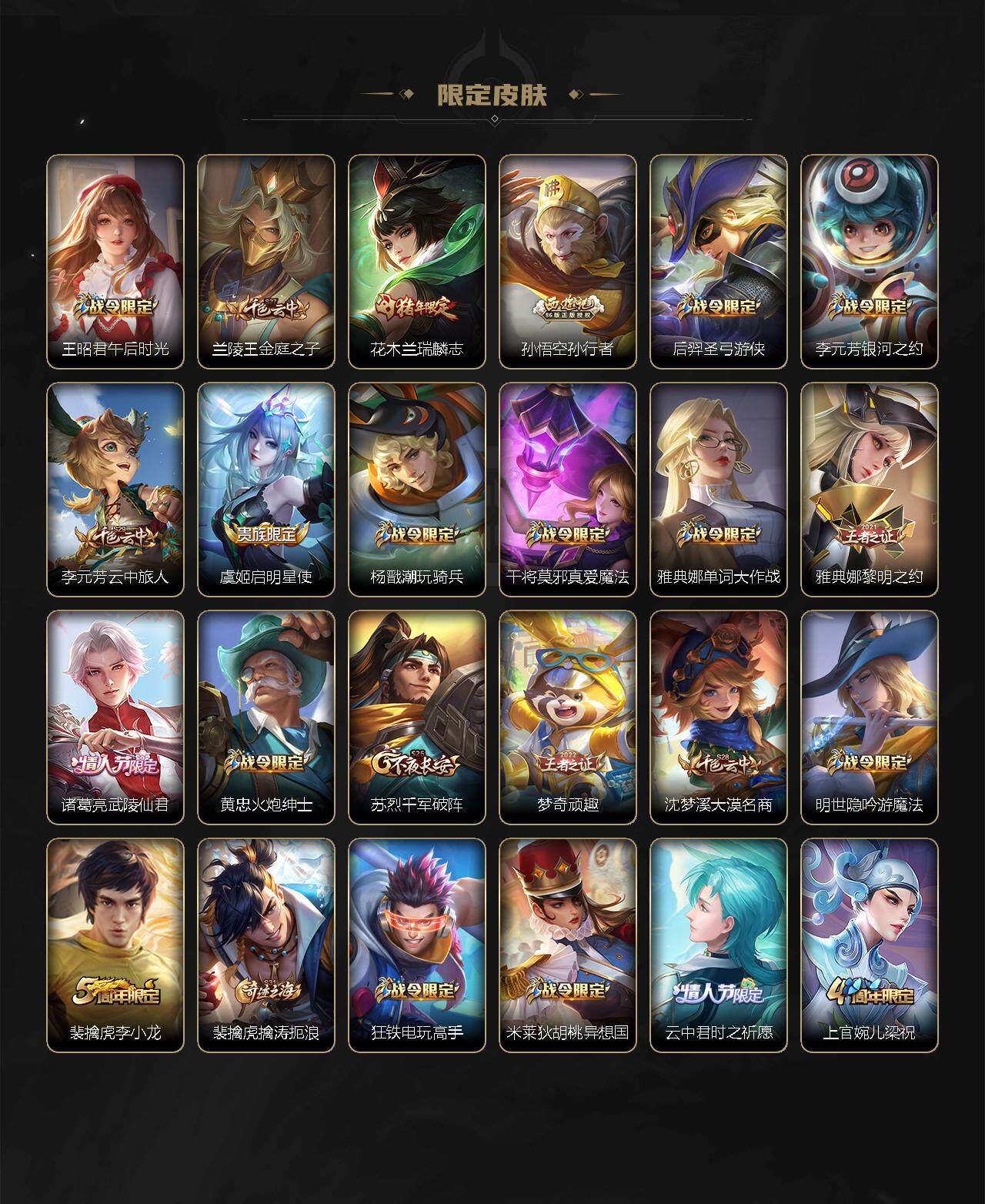 【限定皮肤】:狄仁杰阴阳师,廉颇寅虎御盾,赵云皇家上将,嬴政优雅恋人,鲁班七号寅虎瑞焰,庄周高山流水,高渐离死亡摇滚,扁鹊奇幻香踪,白起夜都怪侠,芈月幻夜卜梦,元歌云间偶戏,元歌无心,狄仁杰魔术师,达摩沙漠行僧,项羽海滩派对,老夫子航海奇遇记,关羽武圣,韩信傲雪梅枪,王昭君午后时光,兰陵王金庭之子,花木兰瑞麟志,孙悟空孙行者,后羿圣弓游侠,李元芳银河之约,李元芳云中旅人,虞姬启明星使,杨戬潮玩骑兵,干将莫邪真爱魔法,雅典娜单词大作战,雅典娜黎明之约,诸葛亮武陵仙君,黄忠火炮绅士,苏烈千军破阵,梦奇顽趣,沈梦溪大漠名商,明世隐吟游魔法,裴擒虎李小龙,裴擒虎擒涛扼浪,狂铁电玩高手,米莱狄胡桃异想国,云中君时之祈愿,上官婉儿梁祝,嫦娥拒霜思,西施玲珑珍味,鲁班大师探海日志,桑启海盐诗旅,戈娅驭风魔法,艾琳流音漫舞,司空震地狱燃心,阿古朵江河有灵,张良古海寻踪,蒙恬荣光圣徽,鬼谷子天穹祈灯