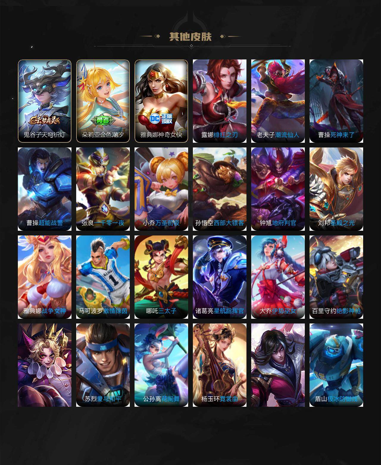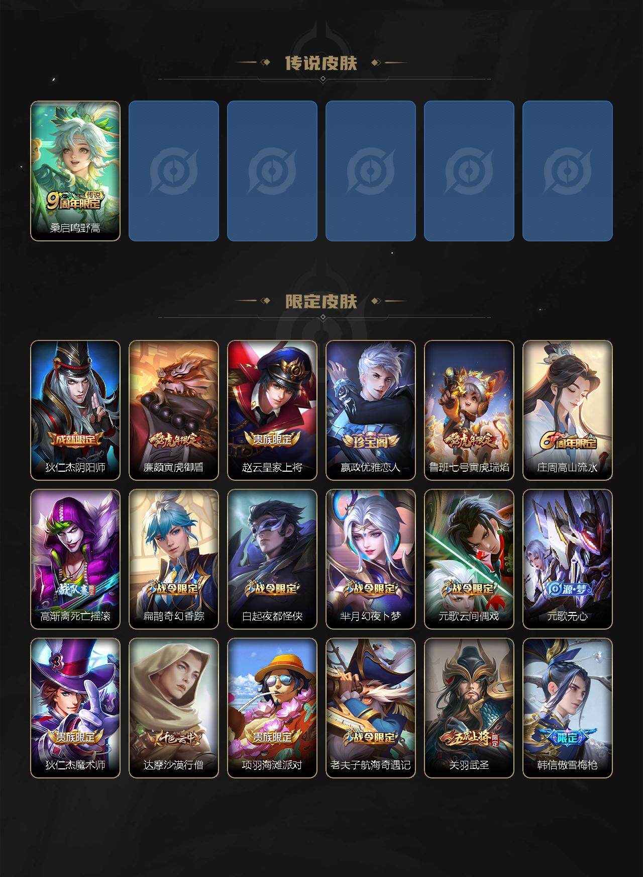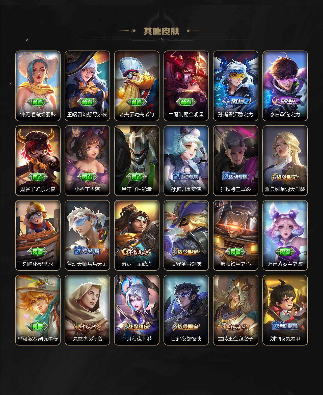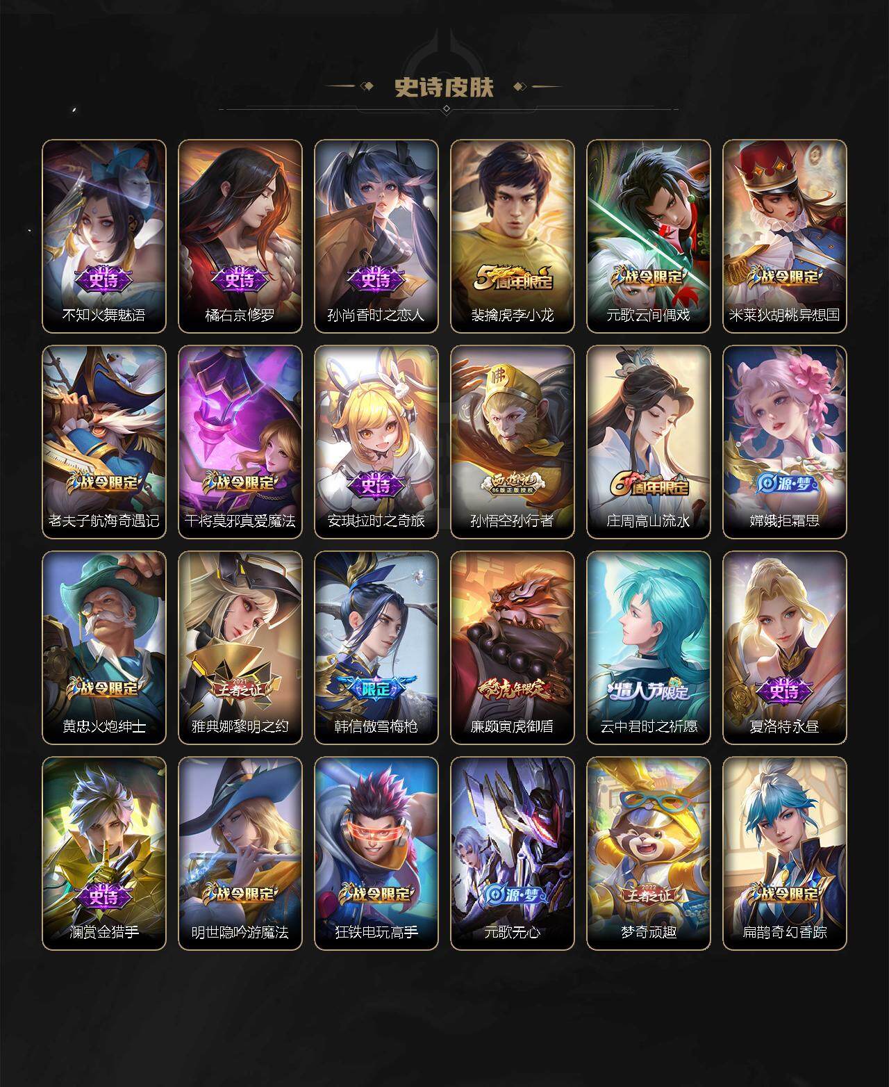 【限定皮肤】:狄仁杰阴阳师,廉颇寅虎御盾,赵云皇家上将,嬴政优雅恋人,鲁班七号寅虎瑞焰,庄周高山流水,高渐离死亡摇滚,扁鹊奇幻香踪,白起夜都怪侠,芈月幻夜卜梦,元歌云间偶戏,元歌无心,狄仁杰魔术师,达摩沙漠行僧,项羽海滩派对,老夫子航海奇遇记,关羽武圣,韩信傲雪梅枪,王昭君午后时光,兰陵王金庭之子,花木兰瑞麟志,孙悟空孙行者,后羿圣弓游侠,李元芳银河之约,李元芳云中旅人,虞姬启明星使,杨戬潮玩骑兵,干将莫邪真爱魔法,雅典娜单词大作战,雅典娜黎明之约,诸葛亮武陵仙君,黄忠火炮绅士,苏烈千军破阵,梦奇顽趣,沈梦溪大漠名商,明世隐吟游魔法,裴擒虎李小龙,裴擒虎擒涛扼浪,狂铁电玩高手,米莱狄胡桃异想国,云中君时之祈愿,上官婉儿梁祝,嫦娥拒霜思,西施玲珑珍味,鲁班大师探海日志,桑启海盐诗旅,戈娅驭风魔法,艾琳流音漫舞,司空震地狱燃心,阿古朵江河有灵,张良古海寻踪,蒙恬荣光圣徽,鬼谷子天穹祈灯