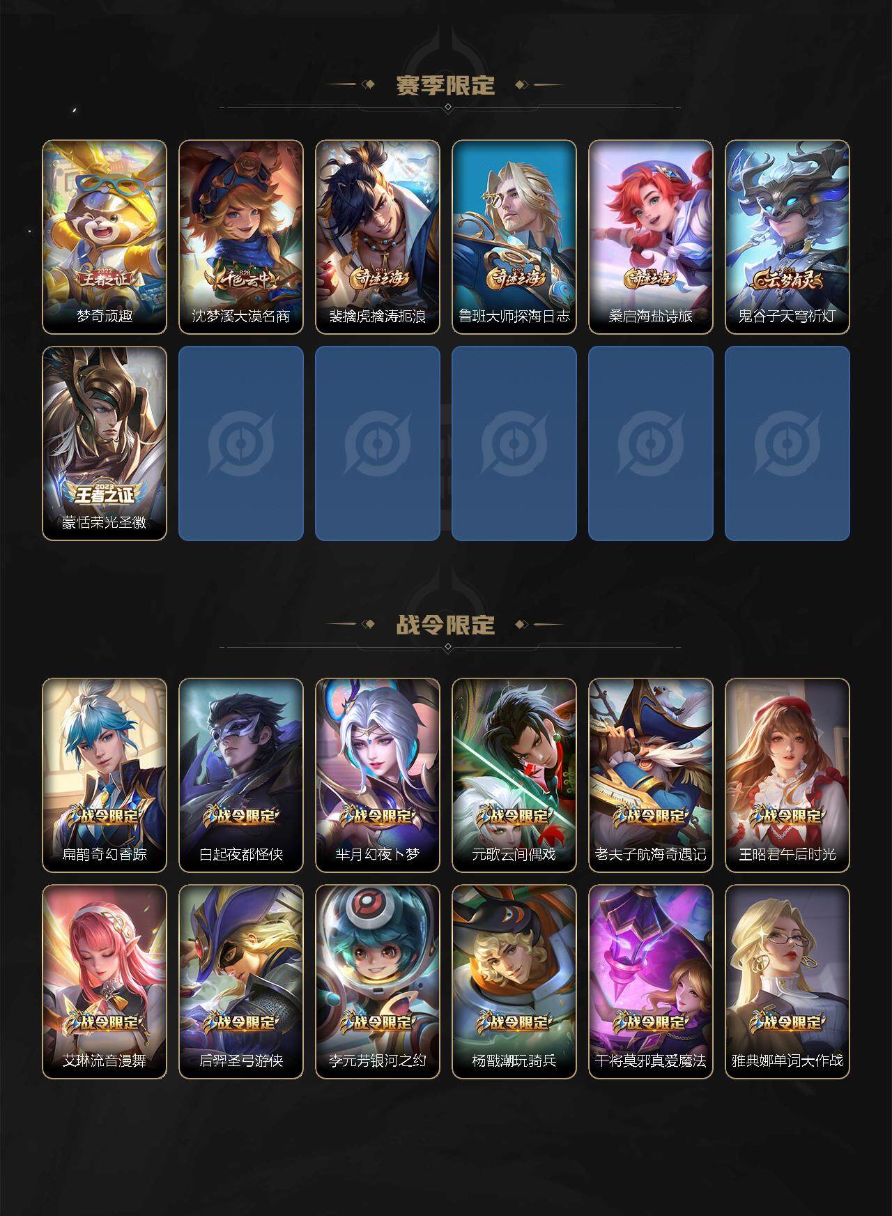 【赛季限定】:达摩沙漠行僧,兰陵王金庭之子,张良古海寻踪,李元芳云中旅人,雅典娜黎明之约,苏烈千军破阵,梦奇顽趣,沈梦溪大漠名商,裴擒虎擒涛扼浪,鲁班大师探海日志,桑启海盐诗旅,鬼谷子天穹祈灯,蒙恬荣光圣徽