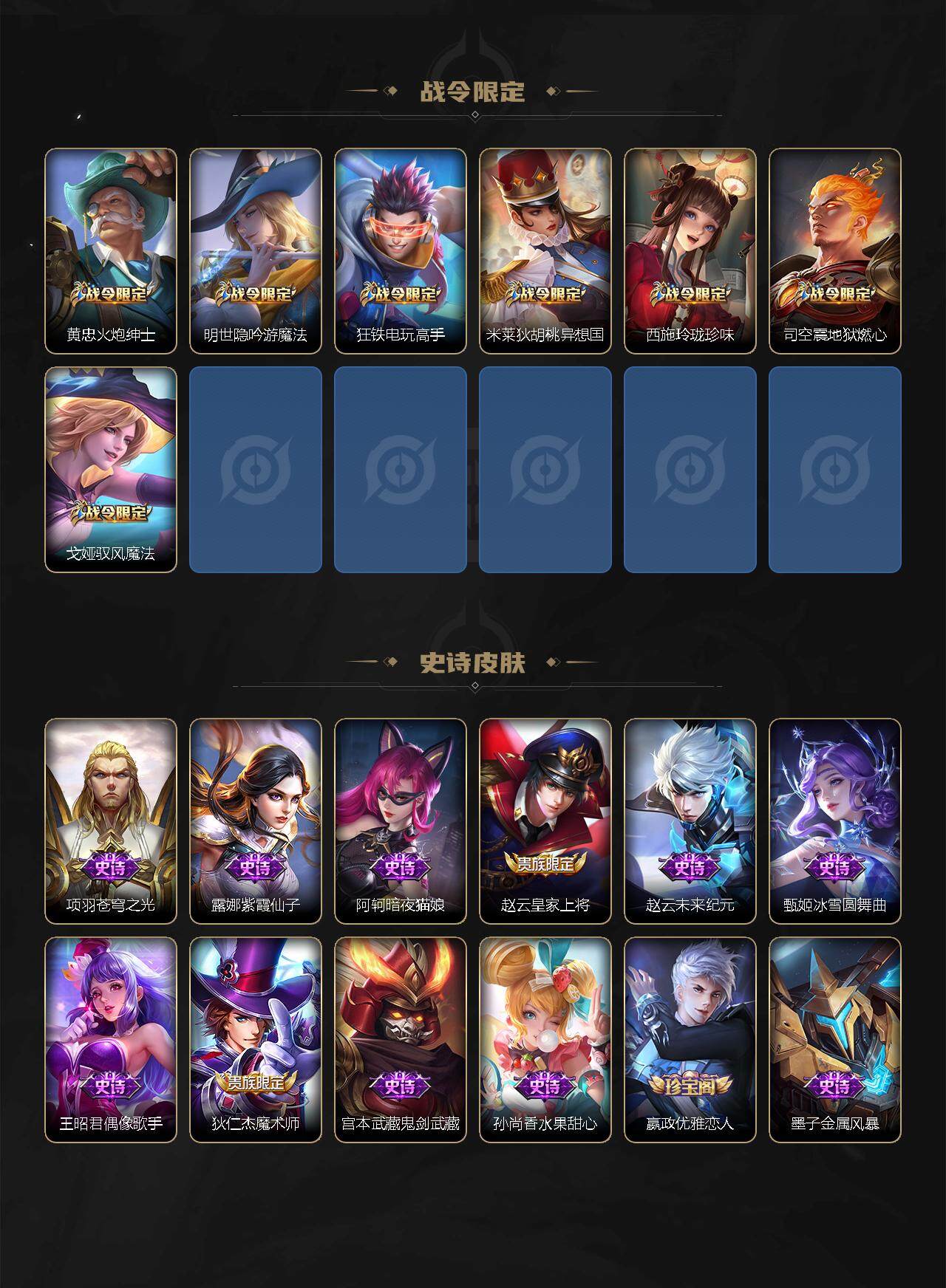 【战令限定】:扁鹊奇幻香踪,白起夜都怪侠,芈月幻夜卜梦,元歌云间偶戏,老夫子航海奇遇记,王昭君午后时光,艾琳流音漫舞,后羿圣弓游侠,李元芳银河之约,杨戬潮玩骑兵,干将莫邪真爱魔法,雅典娜单词大作战,黄忠火炮绅士,明世隐吟游魔法,狂铁电玩高手,米莱狄胡桃异想国,西施玲珑珍味,司空震地狱燃心,戈娅驭风魔法