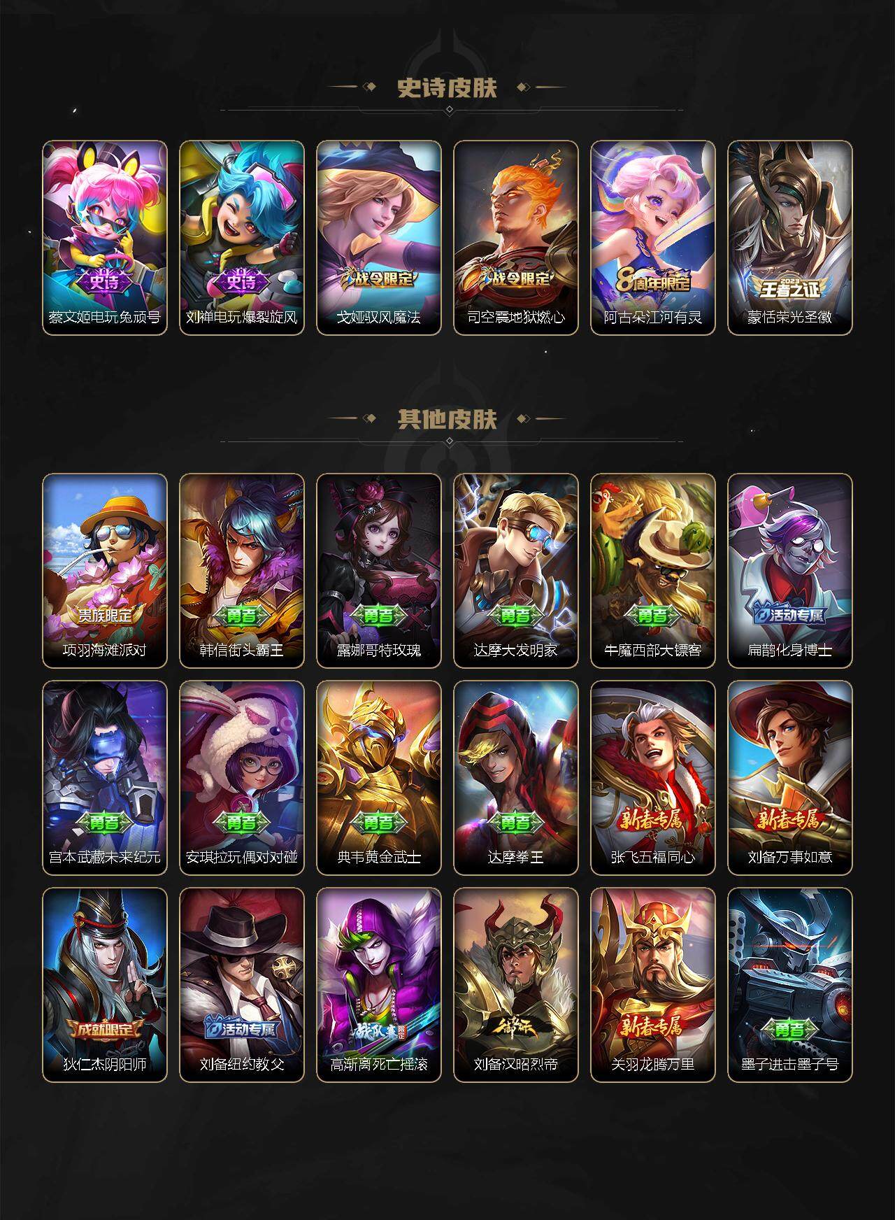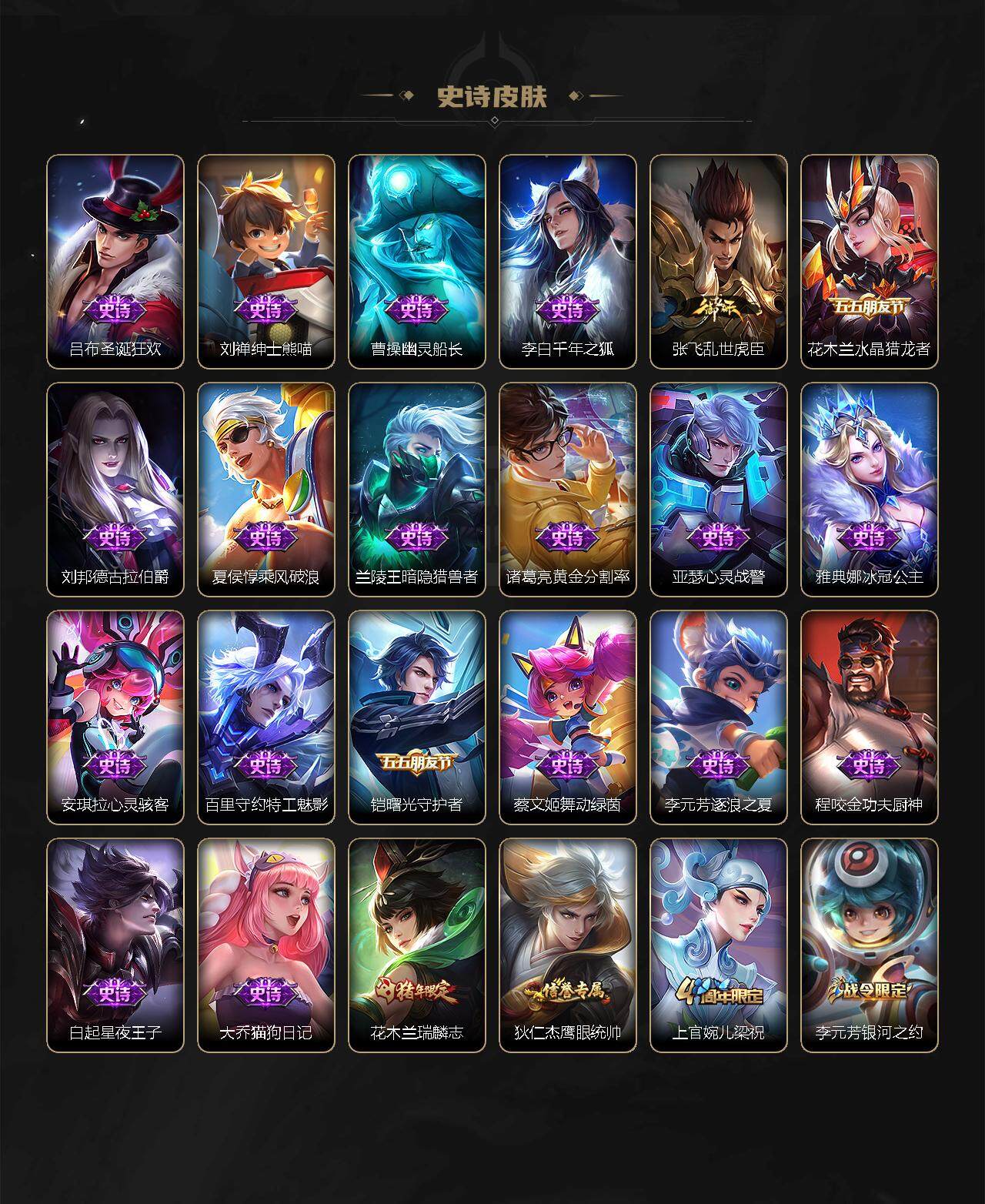 【史诗皮肤】:项羽苍穹之光,露娜紫霞仙子,阿轲暗夜猫娘,赵云皇家上将,赵云未来纪元,甄姬冰雪圆舞曲,王昭君偶像歌手,狄仁杰魔术师,宫本武藏鬼剑武藏,孙尚香水果甜心,嬴政优雅恋人,墨子金属风暴,