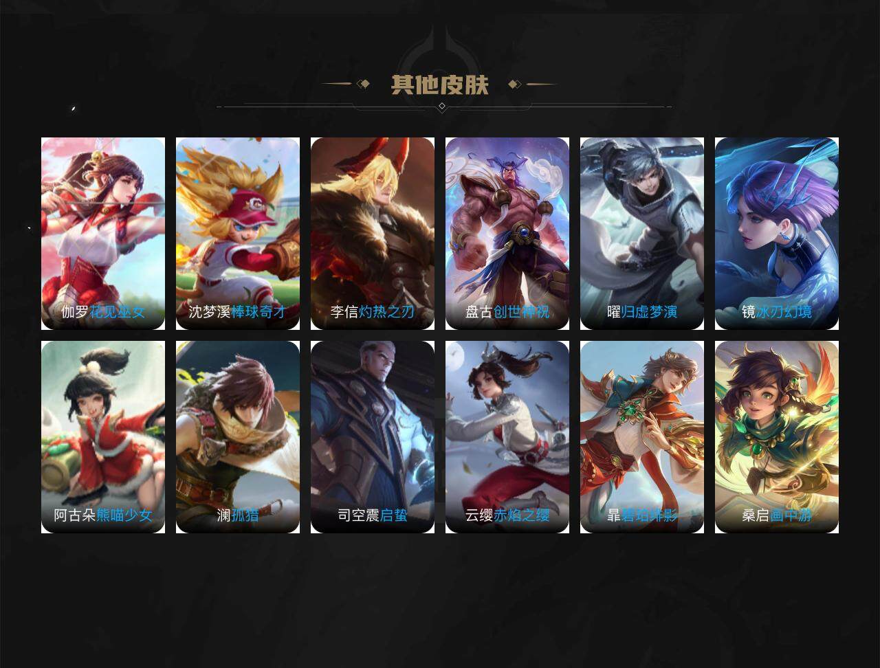 裴擒虎李小龙,上官婉儿梁祝,关羽武圣,花木兰瑞麟志,雅典娜神奇女侠,廉颇寅虎·御盾,孙悟空孙行者,韩信傲雪梅枪,鲁班七号寅虎·瑞焰,云中君时之祈愿,桑启鸣野蒿