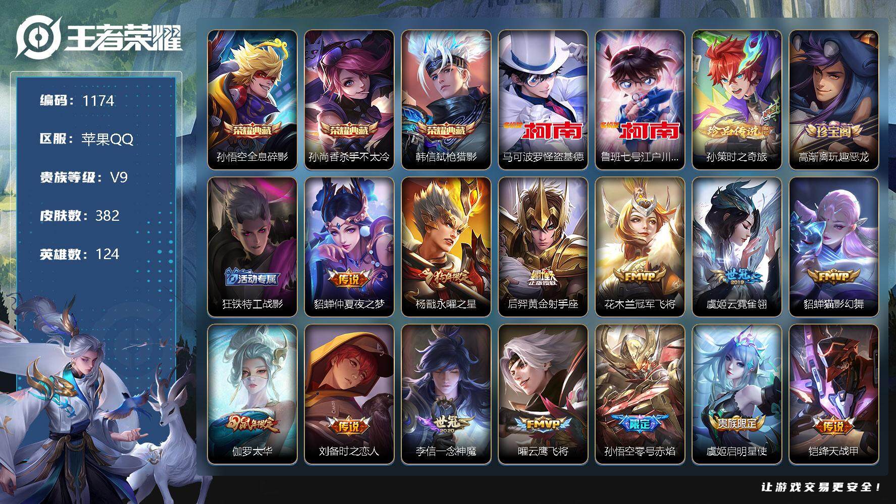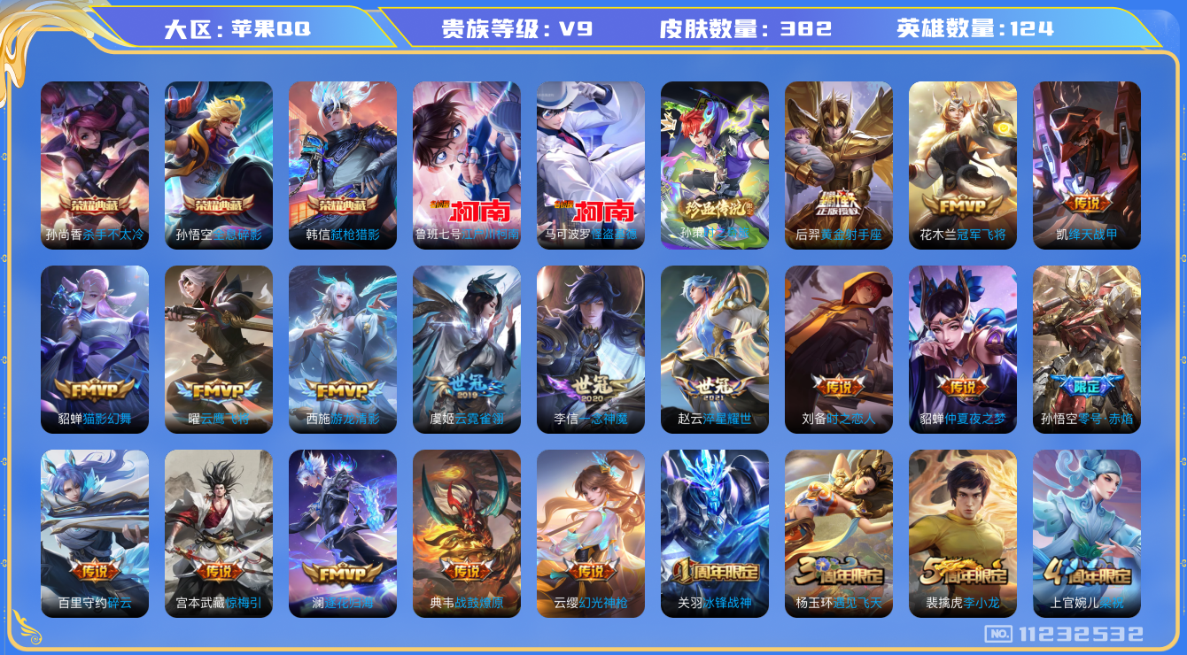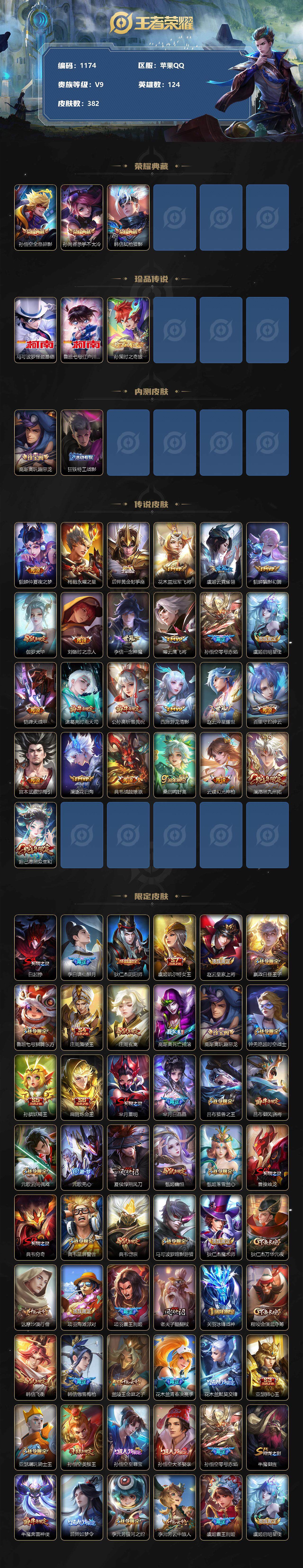 [11232532]【商品标题】:苹果Q-V9-永恒钻石IV段位-124英雄-382皮肤-3典藏-0珍品无双-0无双-3珍品传说-25传说-111史诗