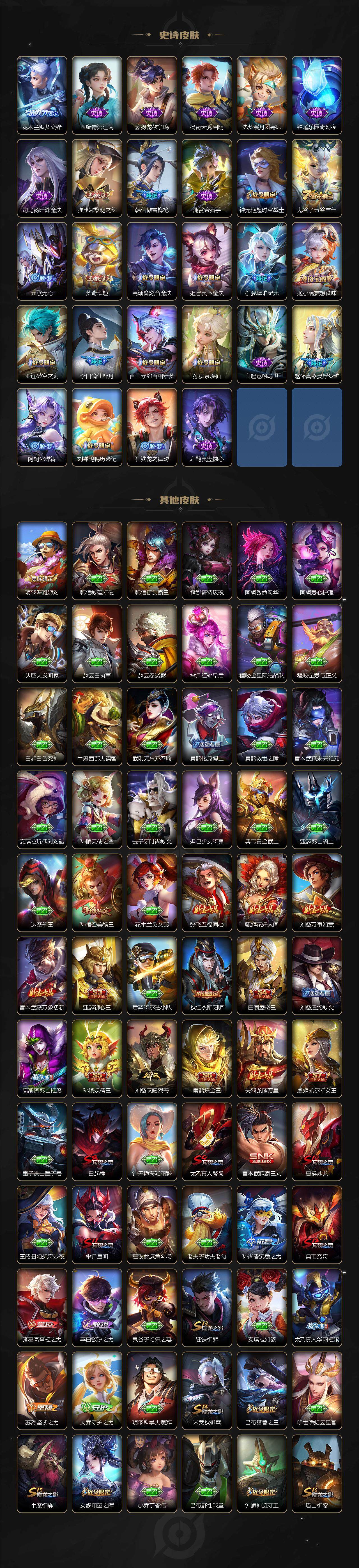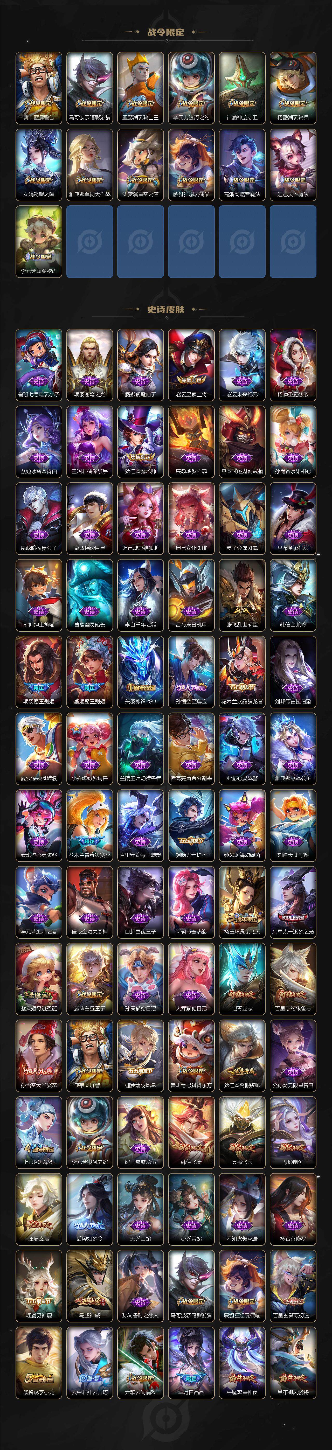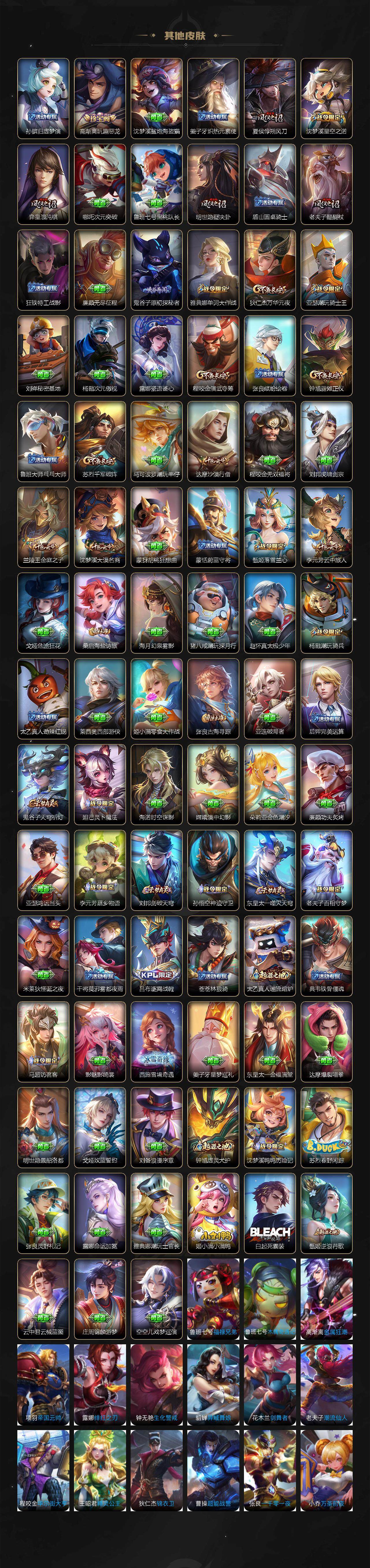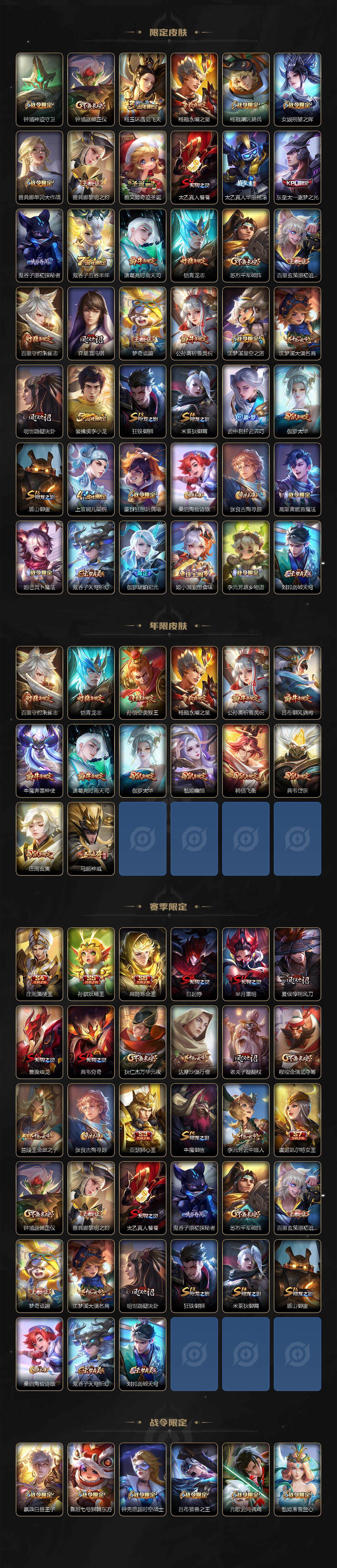 【限定皮肤】:白起狰,李白谪仙醉月,狄仁杰阴阳师,虞姬凯尔特女王,赵云皇家上将,嬴政白昼王子,鲁班七号狮舞东方,庄周蜃楼王,庄周玄嵩,高渐离死亡摇滚,高渐离玩趣恶龙,钟无艳超时空战士,孙膑妖精王,扁鹊炼金王,芈月重明,芈月白晶晶,吕布猎兽之王,吕布御风骁将,元歌云间偶戏,元歌无心,夏侯惇朔风刀,甄姬幽恒,甄姬落雪兰心,曹操烛龙,典韦穷奇,典韦蓝屏警告,典韦岱宗,马可波罗暗影游猎,狄仁杰魔术师,狄仁杰万华元夜,达摩沙漠行僧,项羽海滩派对,项羽霸王别姬,老夫子醍醐杖,关羽冰锋战神,程咬金演武夺筹,韩信飞衡,韩信傲雪梅枪,兰陵王金庭之子,花木兰青春决赛季,花木兰默契交锋,亚瑟狮心王,亚瑟潮玩骑士王,孙悟空美猴王,孙悟空至尊宝,孙悟空大圣娶亲,孙悟空零号赤焰,牛魔御旌,牛魔奔雷神使,后羿如梦令,李元芳银河之约,李元芳云中旅人,虞姬霸王别姬,虞姬启明星使,钟馗神迹守卫,钟馗驱傩正仪,杨玉环遇见飞天,杨戬永曜之星,杨戬潮玩骑兵,女娲朔望之晖,雅典娜单词大作战,雅典娜黎明之约,蔡文姬奇迹圣诞,太乙真人饕餮,太乙真人华丽摇滚,东皇太一逐梦之光,鬼谷子原初探秘者,鬼谷子五谷丰年,诸葛亮时雨天司,铠青龙志,苏烈千军破阵,百里玄策原初追逐者,百里守约朱雀志,弈星混沌棋,梦奇顽趣,公孙离祈雪灵祝,沈梦溪星空之诺,沈梦溪大漠名商,明世隐疑决卦,裴擒虎李小龙,狂铁御狮,米莱狄御霄,云中君纤云弄巧,伽罗太华,盾山御銮,上官婉儿梁祝,蒙犽狂想玩偶喵,桑启海盐诗旅,张良古海寻踪,高渐离燃音魔法,妲己灵卜魔法,鬼谷子天穹祈灯,伽罗琥珀纪元,