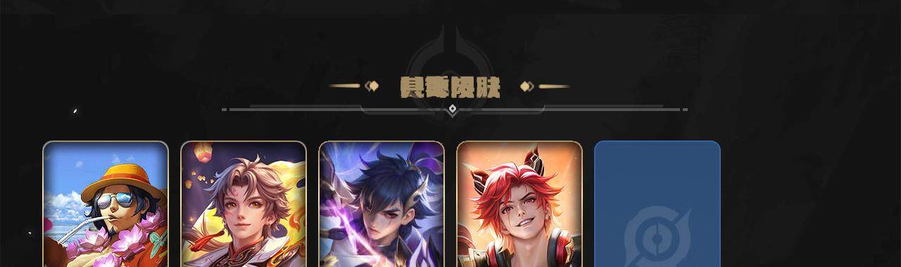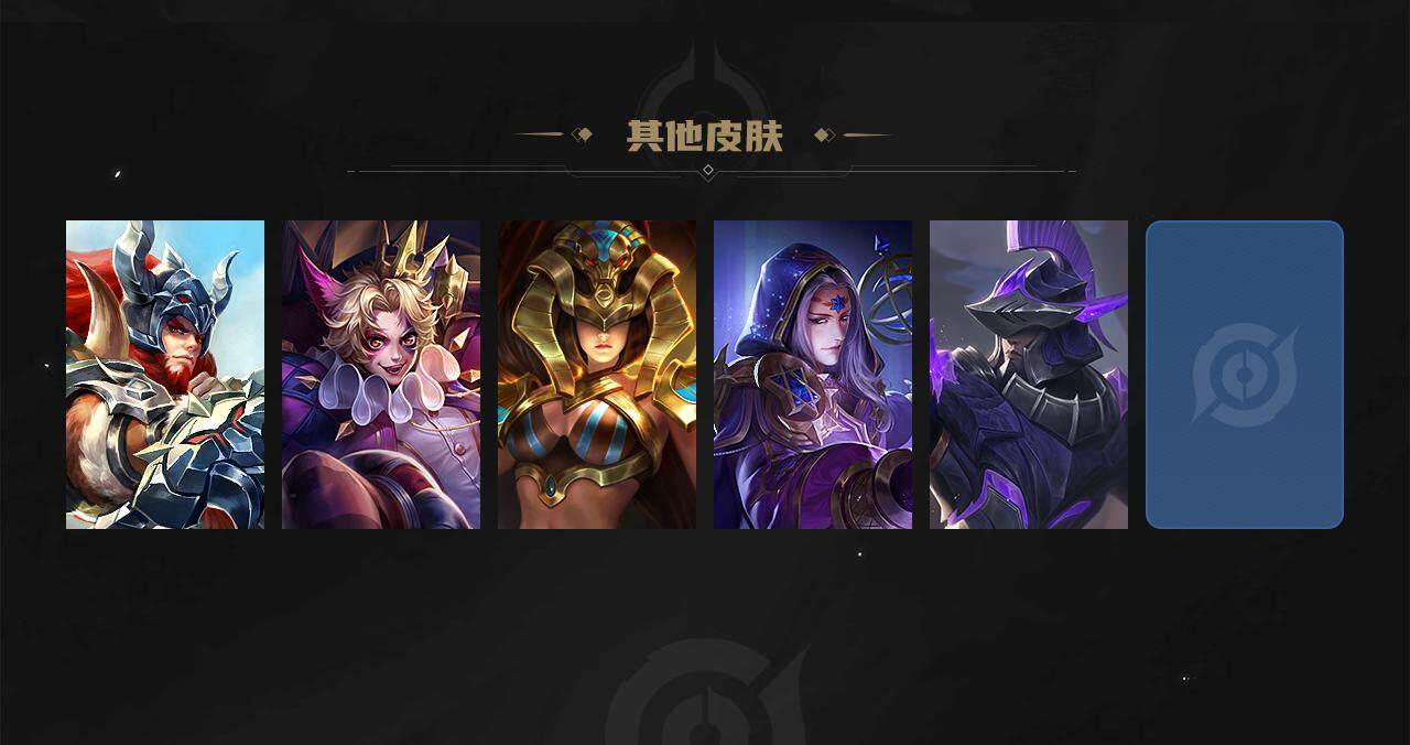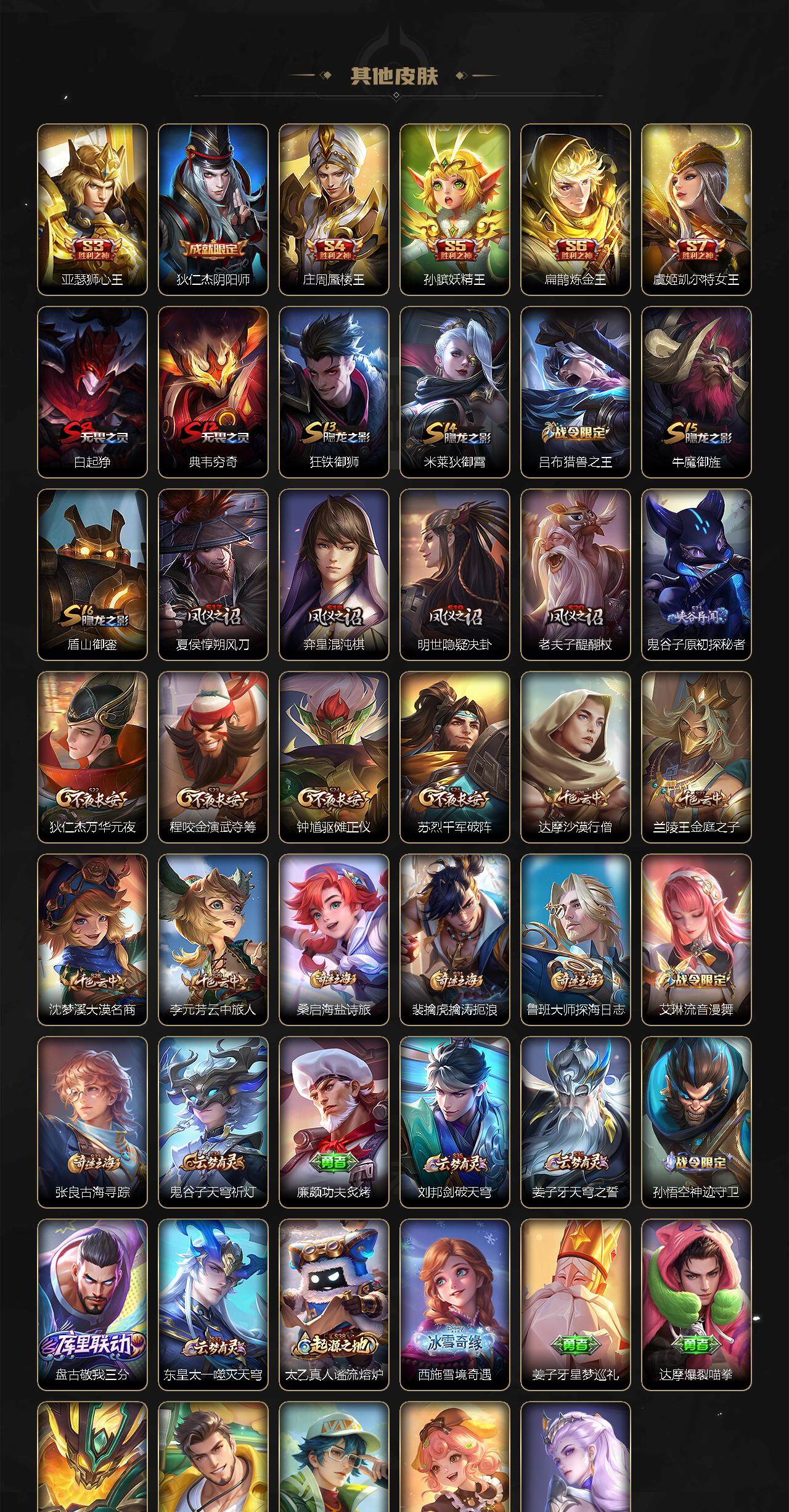 【限定皮肤】:白起狰,姜子牙天穹之誓,狄仁杰阴阳师,虞姬凯尔特女王,赵云皇家上将,赵云引擎之心,妲己时之彼端,嬴政优雅恋人,嬴政白昼王子,庄周蜃楼王,钟无艳王者之锤,孙膑妖精王,扁鹊炼金王,吕布猎兽之王,夏侯惇朔风刀,典韦穷奇,狄仁杰魔术师,狄仁杰万华元夜,达摩沙漠行僧,项羽海滩派对,老夫子圣诞老人,老夫子醍醐杖,关羽冰锋战神,貂蝉逐梦之音,程咬金演武夺筹,韩信逐梦之影,王昭君凤凰于飞,兰陵王金庭之子,亚瑟狮心王,孙悟空大圣娶亲,牛魔御旌,李元芳银河之约,李元芳云中旅人,虞姬启明星使,钟馗驱傩正仪,雅典娜黎明之约,鬼谷子原初探秘者,鬼谷子五谷丰年,苏烈千军破阵,百里玄策原初追逐者,弈星混沌棋,梦奇顽趣,沈梦溪大漠名商,明世隐疑决卦,裴擒虎李小龙,裴擒虎擒涛扼浪,狂铁御狮,米莱狄御霄,盾山御銮,鲁班大师探海日志,桑启海盐诗旅,艾琳流音漫舞,司空震地狱燃心,张良古海寻踪,蒙恬荣光圣徽,鬼谷子天穹祈灯,刘邦剑破天穹