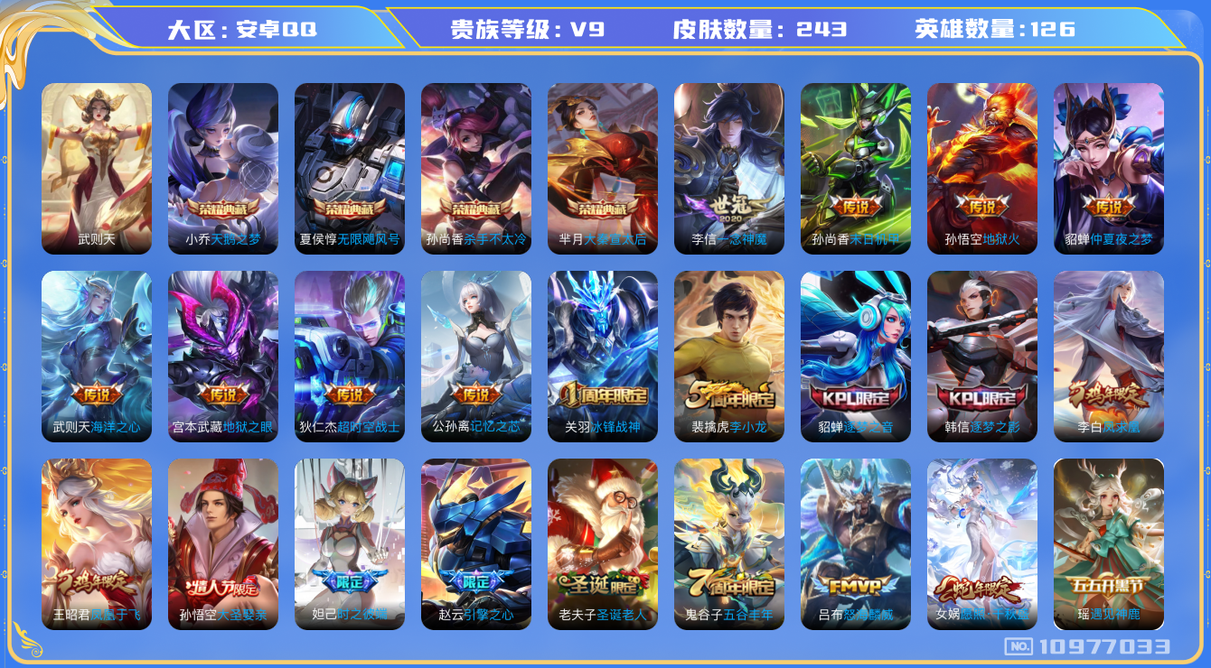 [10977033]【商品标题】:安卓Q-V9-至尊星耀III段位-126英雄-243皮肤-4典藏-0珍品无双-0无双-0珍品传说-12传说-59史诗