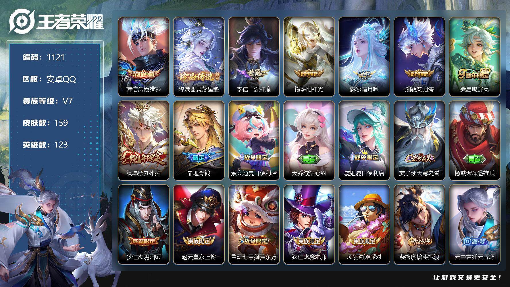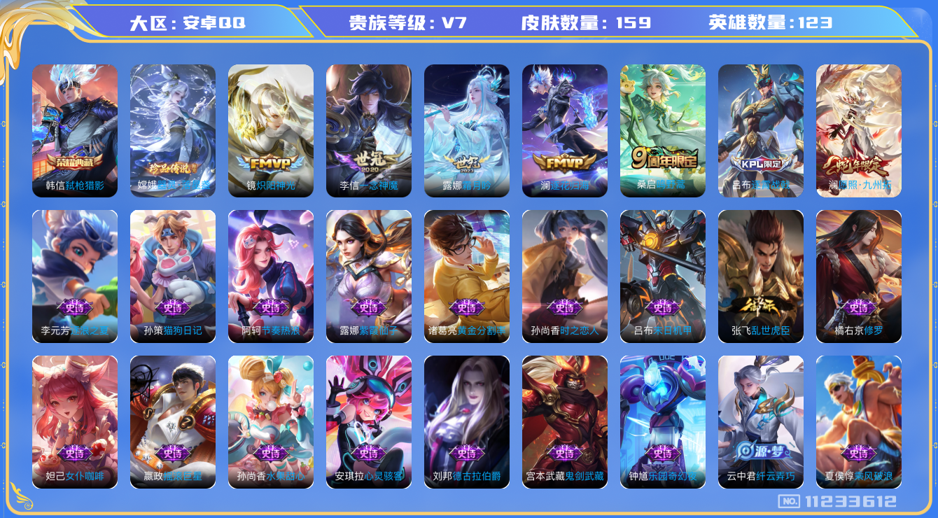 [11233612]【商品标题】:安卓Q-V5-最强王者段位-123英雄-159皮肤-1典藏-0珍品无双-0无双-1珍品传说-6传说-42史诗