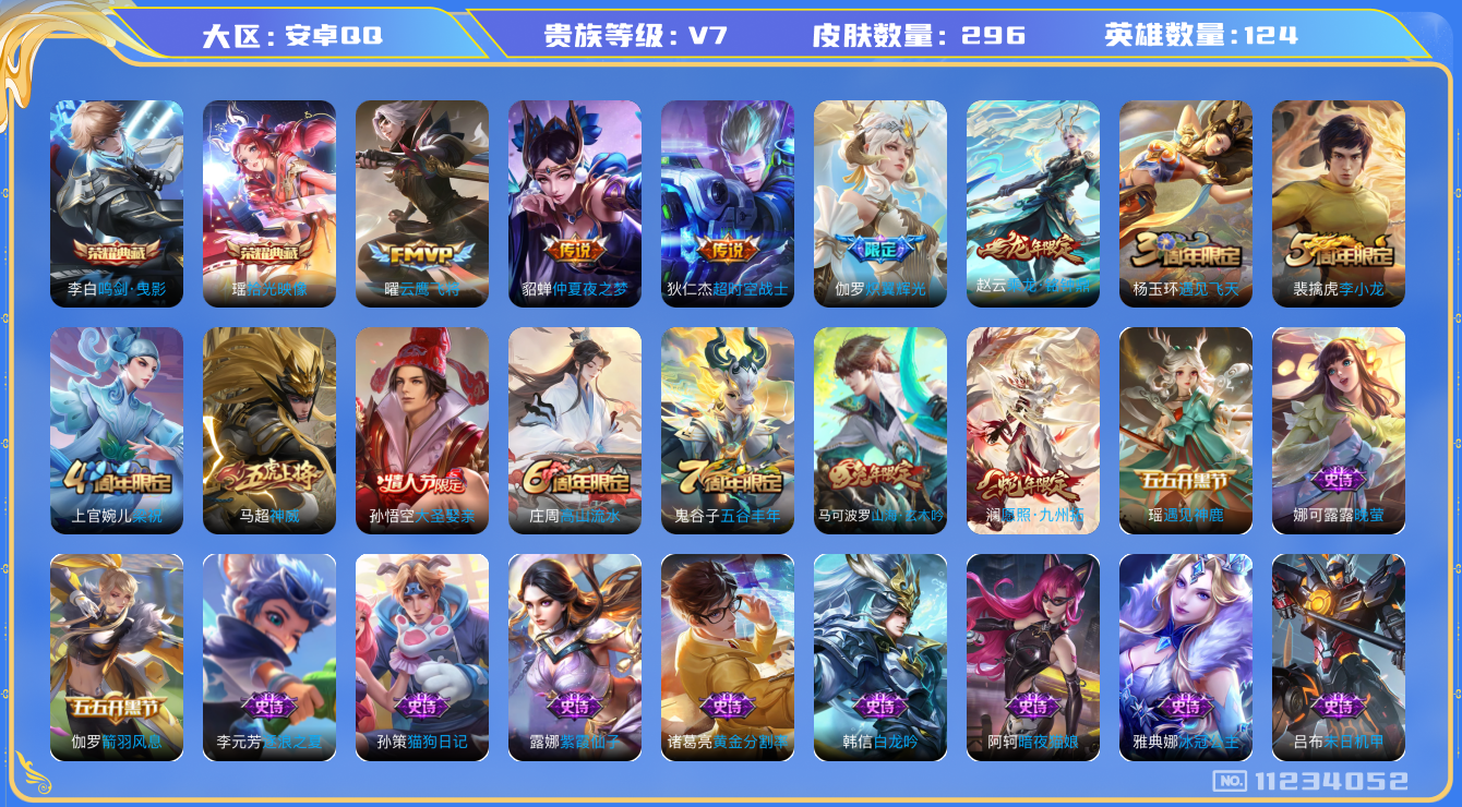 [11234052]【商品标题】:安卓Q-V7-永恒钻石III段位-124英雄-296皮肤-2典藏-0珍品无双-0无双-0珍品传说-6传说-76史诗