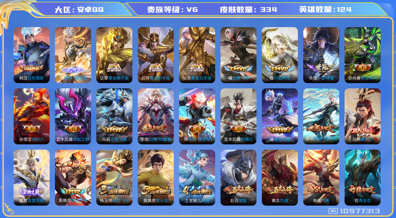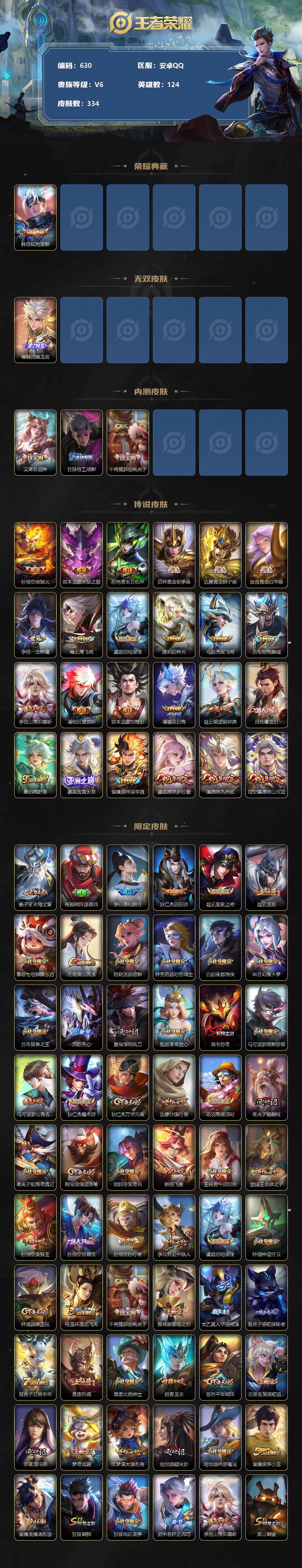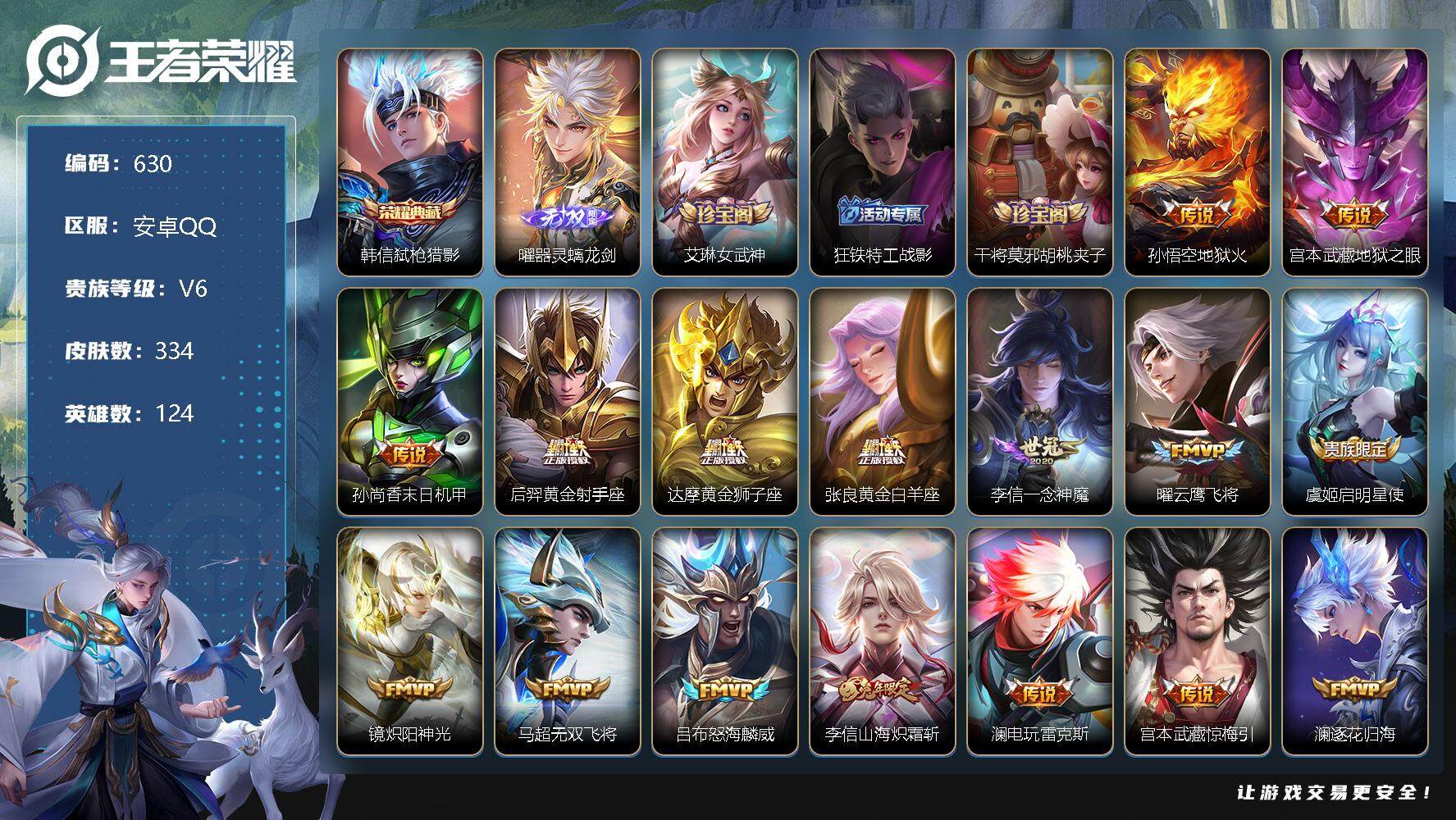 [10977313]【商品标题】:安卓Q-V6-最强王者段位-124英雄-334皮肤-1典藏-0珍品无双-1无双-0珍品传说-24传说-95史诗