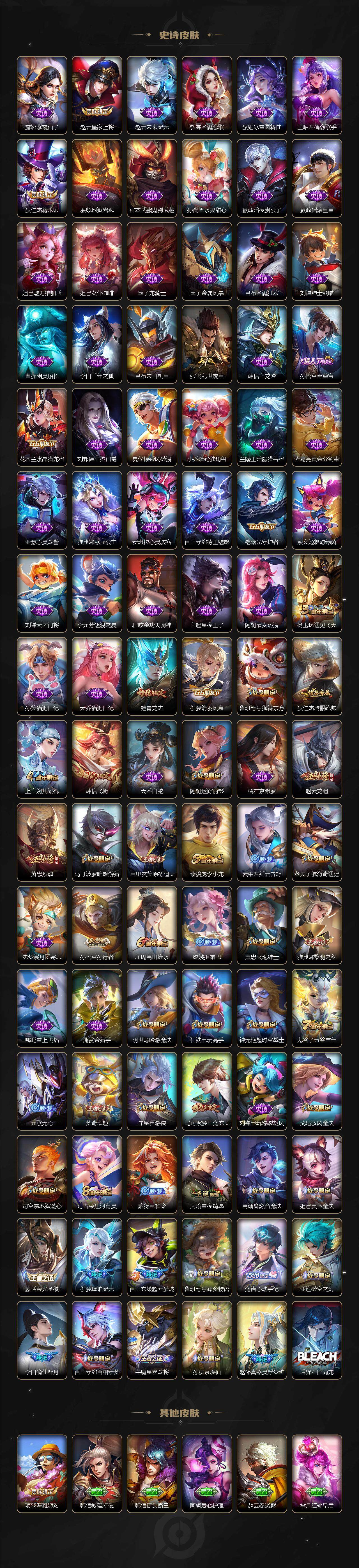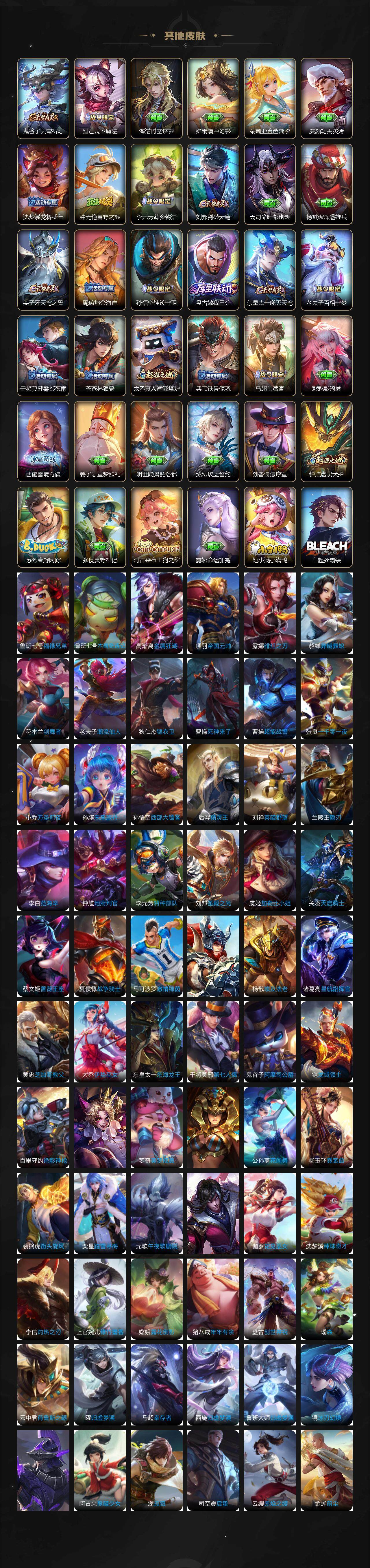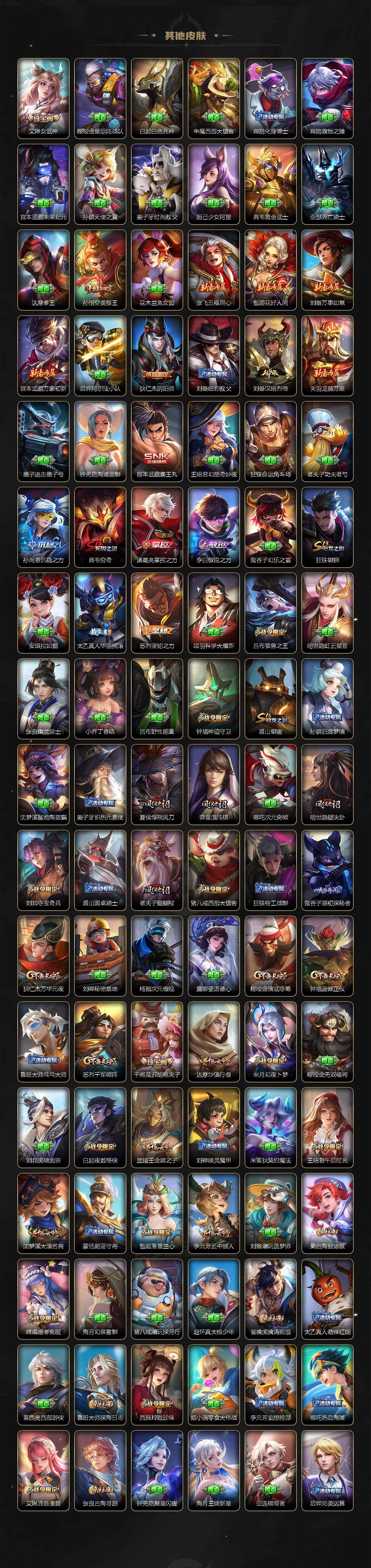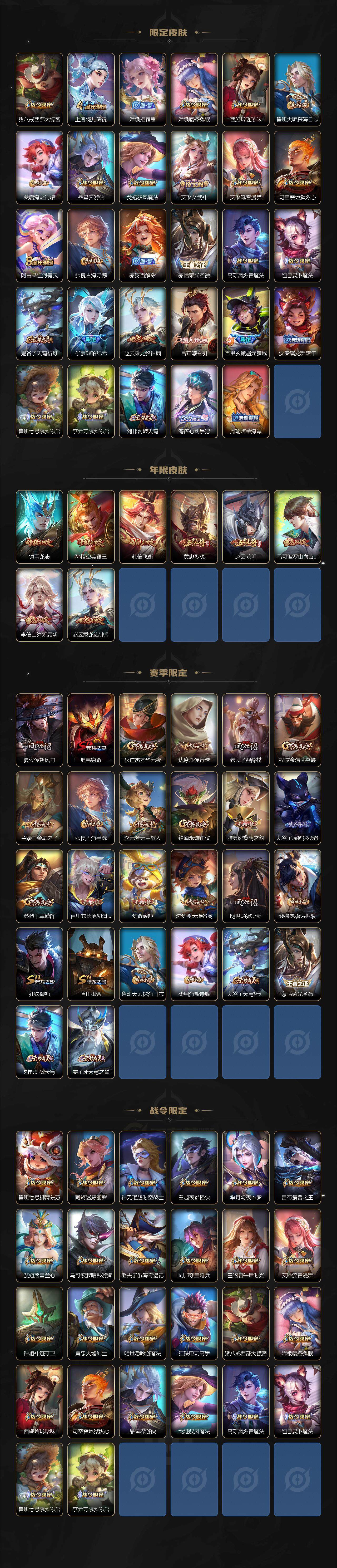 【限定皮肤】:姜子牙天穹之誓,杨戬破阵退雄兵,李白谪仙醉月,狄仁杰阴阳师,赵云皇家上将,赵云龙胆,鲁班七号狮舞东方,庄周高山流水,阿轲迷踪丽影,钟无艳超时空战士,白起夜都怪侠,芈月幻夜卜梦,吕布猎兽之王,元歌无心,夏侯惇朔风刀,甄姬落雪兰心,典韦穷奇,马可波罗暗影游猎,马可波罗山海玄木吟,狄仁杰魔术师,狄仁杰万华元夜,达摩沙漠行僧,项羽海滩派对,老夫子醍醐杖,老夫子航海奇遇记,程咬金演武夺筹,刘邦夺宝奇兵,韩信飞衡,王昭君午后时光,兰陵王金庭之子,孙悟空美猴王,孙悟空至尊宝,孙悟空孙行者,李元芳云中旅人,虞姬启明星使,钟馗神迹守卫,钟馗驱傩正仪,杨玉环遇见飞天,干将莫邪胡桃夹子,雅典娜黎明之约,太乙真人华丽摇滚,鬼谷子原初探秘者,鬼谷子五谷丰年,黄忠烈魂,黄忠火炮绅士,铠青龙志,苏烈千军破阵,百里玄策原初追逐者,弈星混沌棋,梦奇顽趣,沈梦溪大漠名商,明世隐疑决卦,明世隐吟游魔法,裴擒虎李小龙,裴擒虎擒涛扼浪,狂铁御狮,狂铁电玩高手,云中君纤云弄巧,李信山海炽霜斩,盾山御銮,猪八戒西部大镖客,上官婉儿梁祝,嫦娥拒霜思,嫦娥暖冬兔眠,西施玲珑珍味,鲁班大师探海日志,桑启海盐诗旅,暃星界游侠,戈娅驭风魔法,艾琳女武神,艾琳流音漫舞,司空震地狱燃心,阿古朵江河有灵,张良古海寻踪,蒙犽百解令,蒙恬荣光圣徽,高渐离燃音魔法,妲己灵卜魔法,鬼谷子天穹祈灯,伽罗琥珀纪元,赵云乘龙铭钟鼎,吕布曦玄引,百里玄策超元猎域,沈梦溪龙舞盛年,鲁班七号蔬乡物语,李元芳蔬乡物语,刘邦剑破天穹,海诺心动手记,周瑜熔金海岸