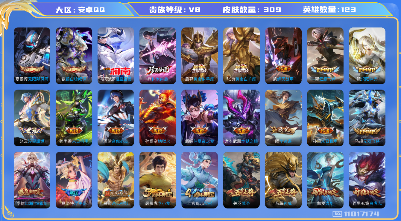[11017174]【商品标题】:安卓Q-V8-最强王者段位-123英雄-309皮肤-2典藏-0珍品无双-0无双-2珍品传说-25传说-83史诗