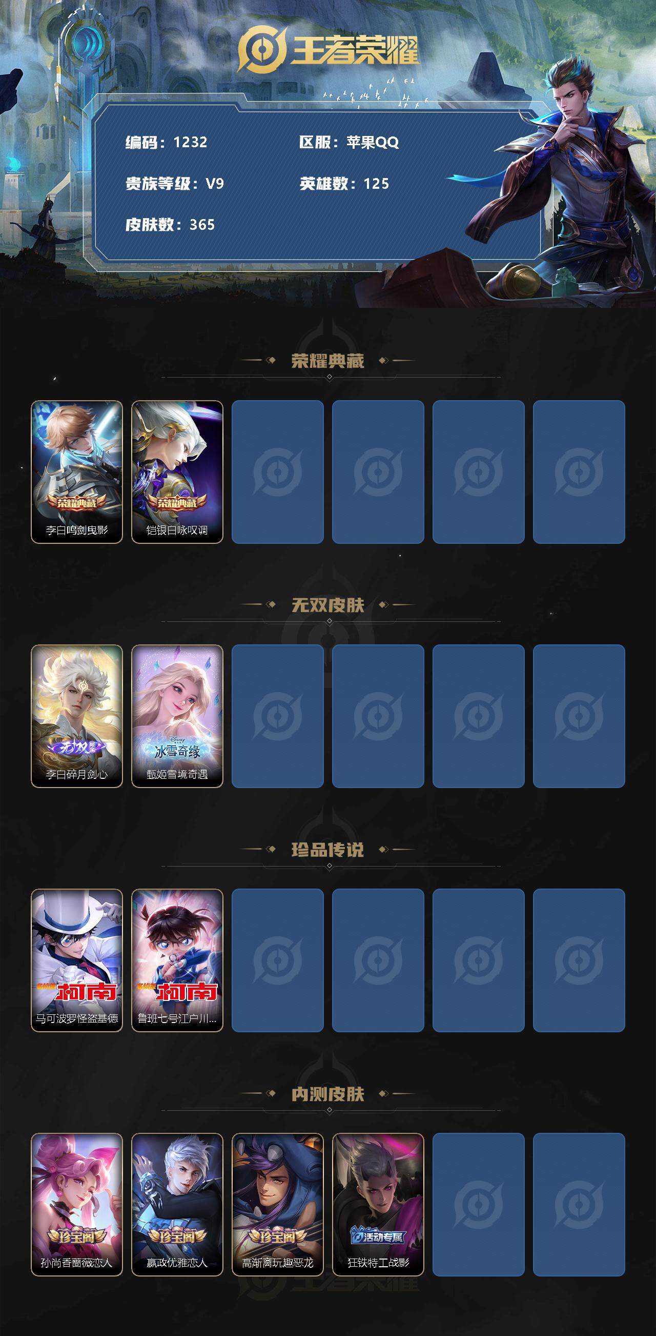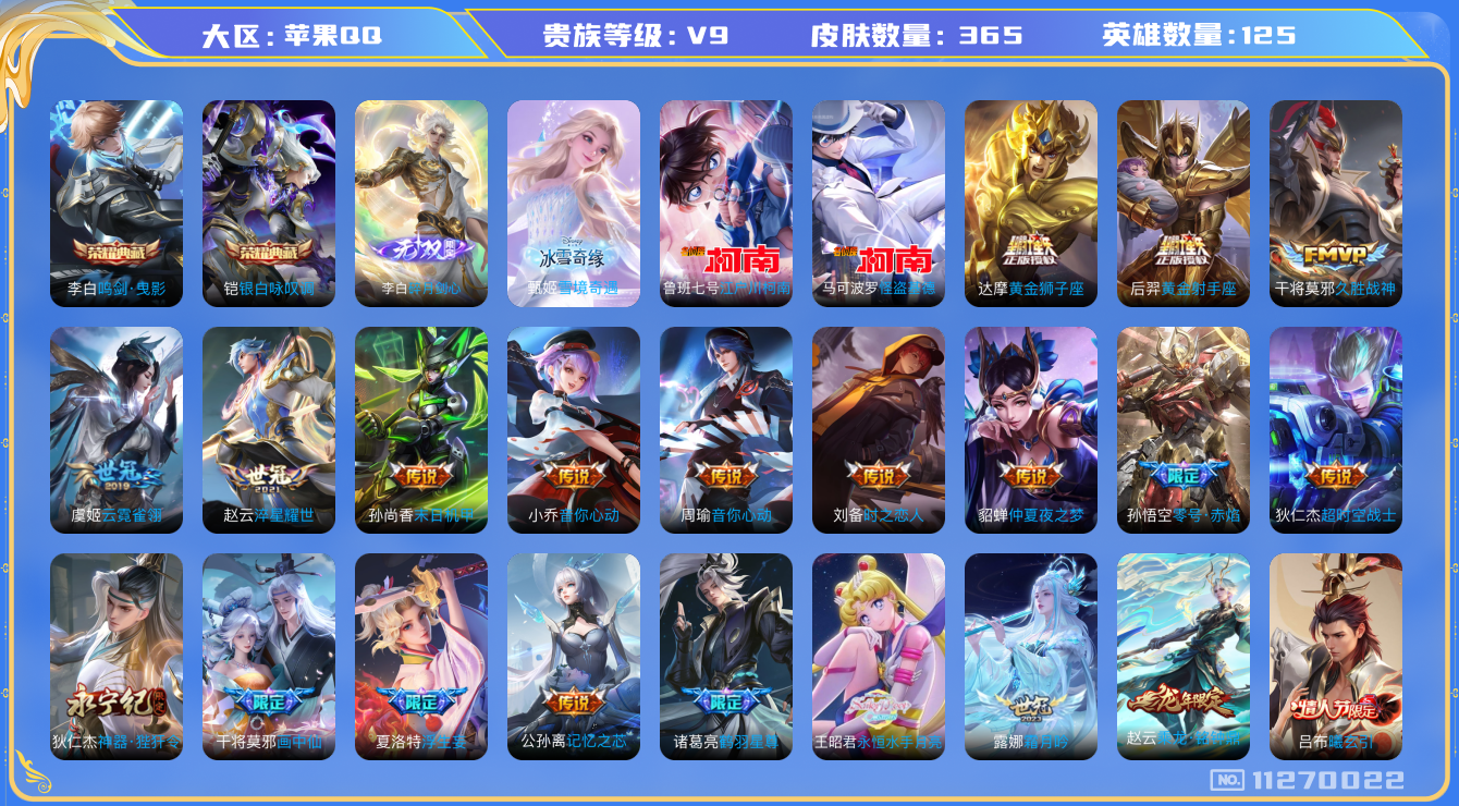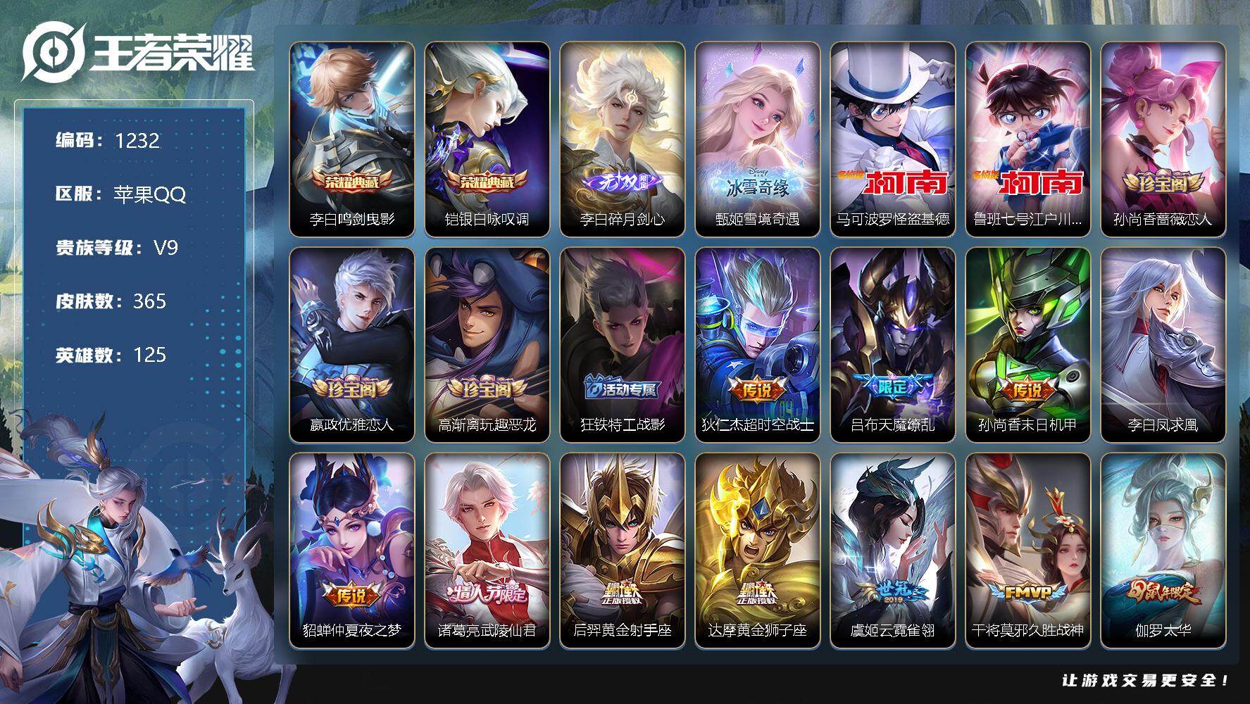 [11270022]【商品标题】:苹果Q-V9-最强王者段位-125英雄-365皮肤-2典藏-0珍品无双-2无双-2珍品传说-38传说-99史诗