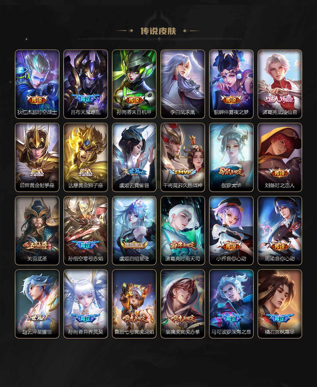 【传说皮肤】:狄仁杰超时空战士,吕布天魔缭乱,孙尚香末日机甲,李白凤求凰,貂蝉仲夏夜之梦,诸葛亮武陵仙君,后羿黄金射手座,达摩黄金狮子座,虞姬云霓雀翎,干将莫邪久胜战神,伽罗太华,刘备时之恋人,关羽武圣,孙悟空零号赤焰,虞姬启明星使,诸葛亮时雨天司,小乔音你心动,周瑜音你心动,赵云淬星耀世,孙尚香异界灵契,鲁班七号寅虎瑞焰,裴擒虎寅虎赤拳,马可波罗深海之息,橘右京枫霜尽,狄仁杰神器狴犴令,李白诗剑行,干将莫邪画中仙,夏洛特浮生妄,公孙离记忆之芯,诸葛亮鹤羽星尊,王昭君永恒水手月亮,露娜霜月吟,赵云乘龙铭钟鼎,吕布曦玄引,桑启鸣野蒿,王昭君映山客,嬴政玄雷天君,虞姬愿照岁时盈
