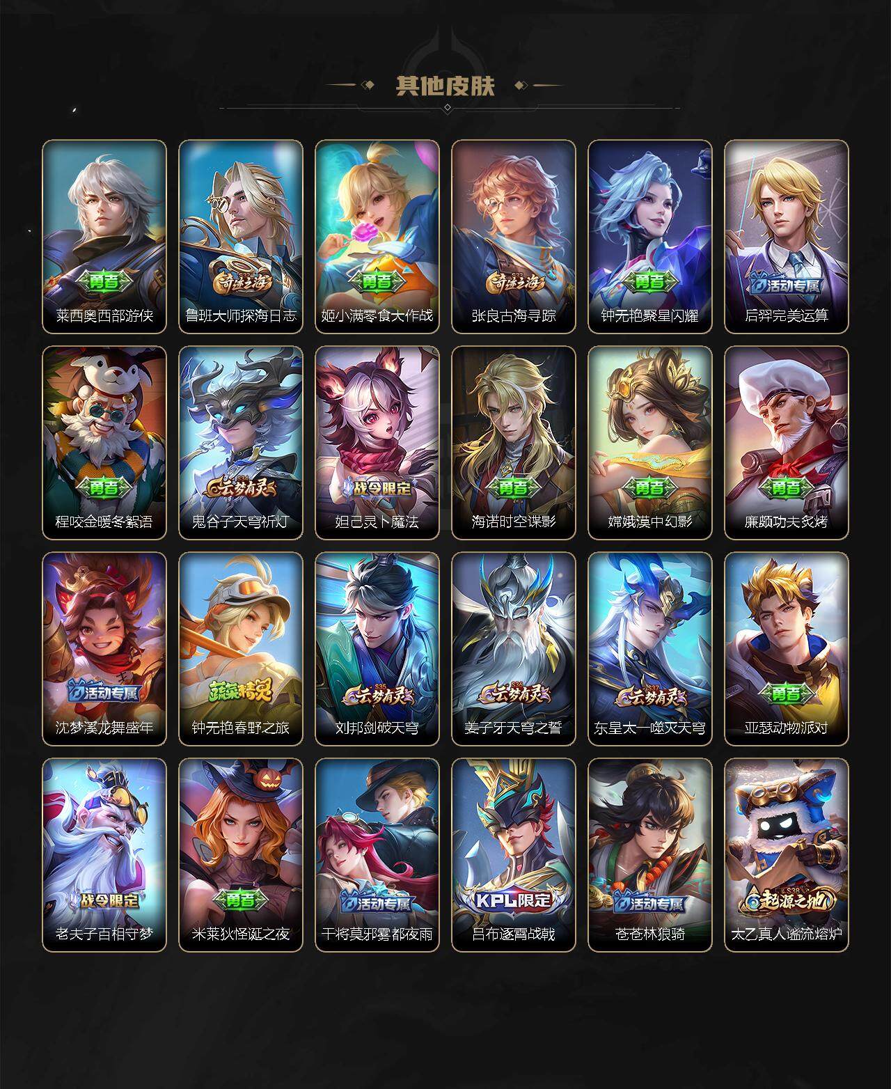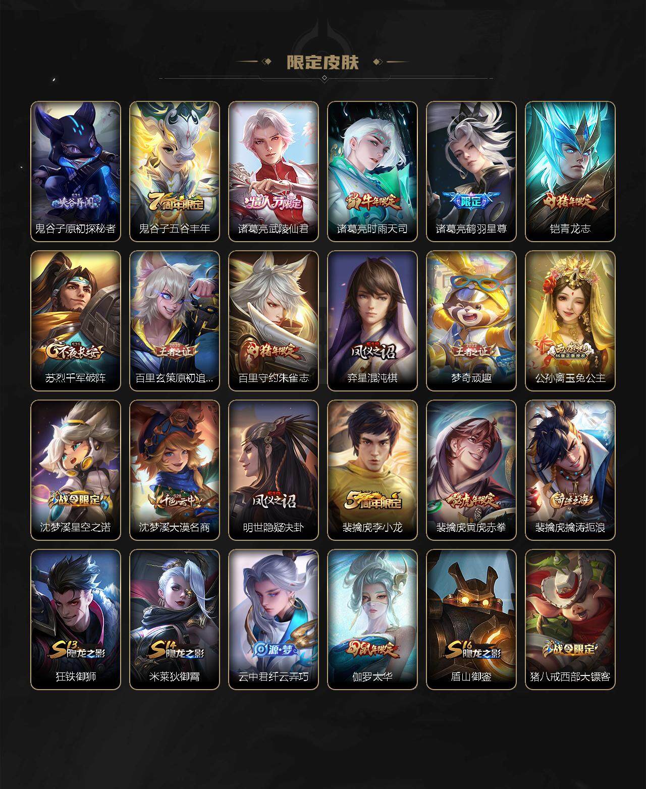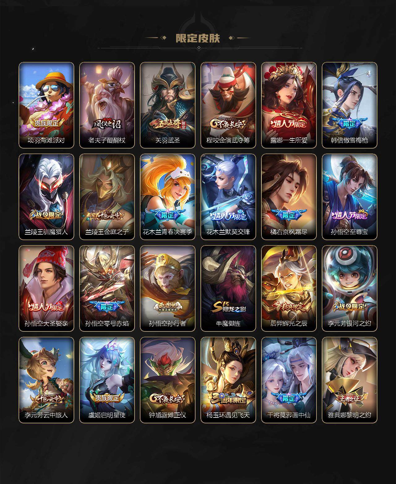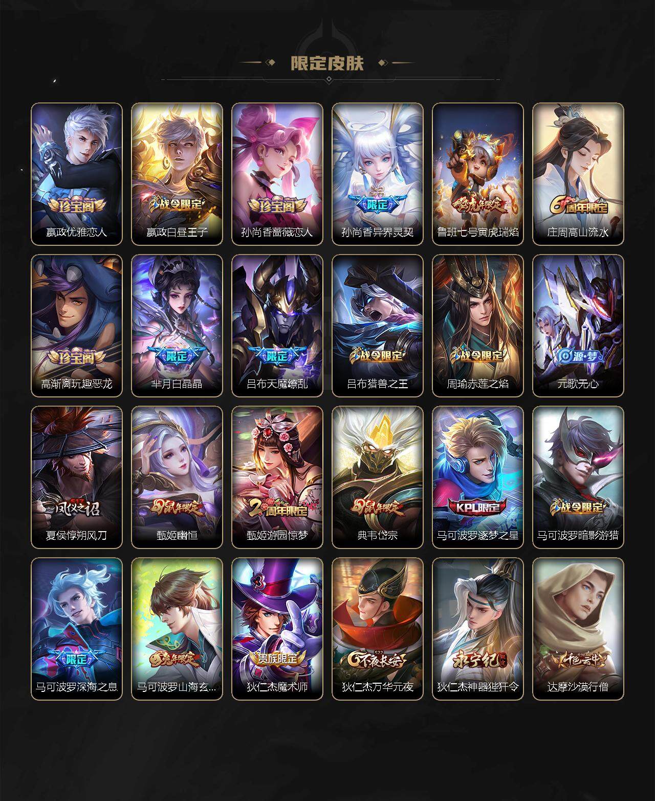【限定皮肤】:姜子牙天穹之誓,李白谪仙醉月,狄仁杰阴阳师,赵云皇家上将,赵云百木心枪,妲己时之奇旅,嬴政优雅恋人,嬴政白昼王子,孙尚香蔷薇恋人,孙尚香异界灵契,鲁班七号寅虎瑞焰,庄周高山流水,高渐离玩趣恶龙,芈月白晶晶,吕布天魔缭乱,吕布猎兽之王,周瑜赤莲之焰,元歌无心,夏侯惇朔风刀,甄姬幽恒,甄姬游园惊梦,典韦岱宗,马可波罗逐梦之星,马可波罗暗影游猎,马可波罗深海之息,马可波罗山海玄木吟,狄仁杰魔术师,狄仁杰万华元夜,狄仁杰神器狴犴令,达摩沙漠行僧,项羽海滩派对,老夫子醍醐杖,关羽武圣,程咬金演武夺筹,露娜一生所爱,韩信傲雪梅枪,兰陵王驯魔猎人,兰陵王金庭之子,花木兰青春决赛季,花木兰默契交锋,橘右京枫霜尽,孙悟空至尊宝,孙悟空大圣娶亲,孙悟空零号赤焰,孙悟空孙行者,牛魔御旌,后羿辉光之辰,李元芳银河之约,李元芳云中旅人,虞姬启明星使,钟馗驱傩正仪,杨玉环遇见飞天,干将莫邪画中仙,雅典娜黎明之约,鬼谷子原初探秘者,鬼谷子五谷丰年,诸葛亮武陵仙君,诸葛亮时雨天司,诸葛亮鹤羽星尊,铠青龙志,苏烈千军破阵,百里玄策原初追逐者,百里守约朱雀志,弈星混沌棋,梦奇顽趣,公孙离玉兔公主,沈梦溪星空之诺,沈梦溪大漠名商,明世隐疑决卦,裴擒虎李小龙,裴擒虎寅虎赤拳,裴擒虎擒涛扼浪