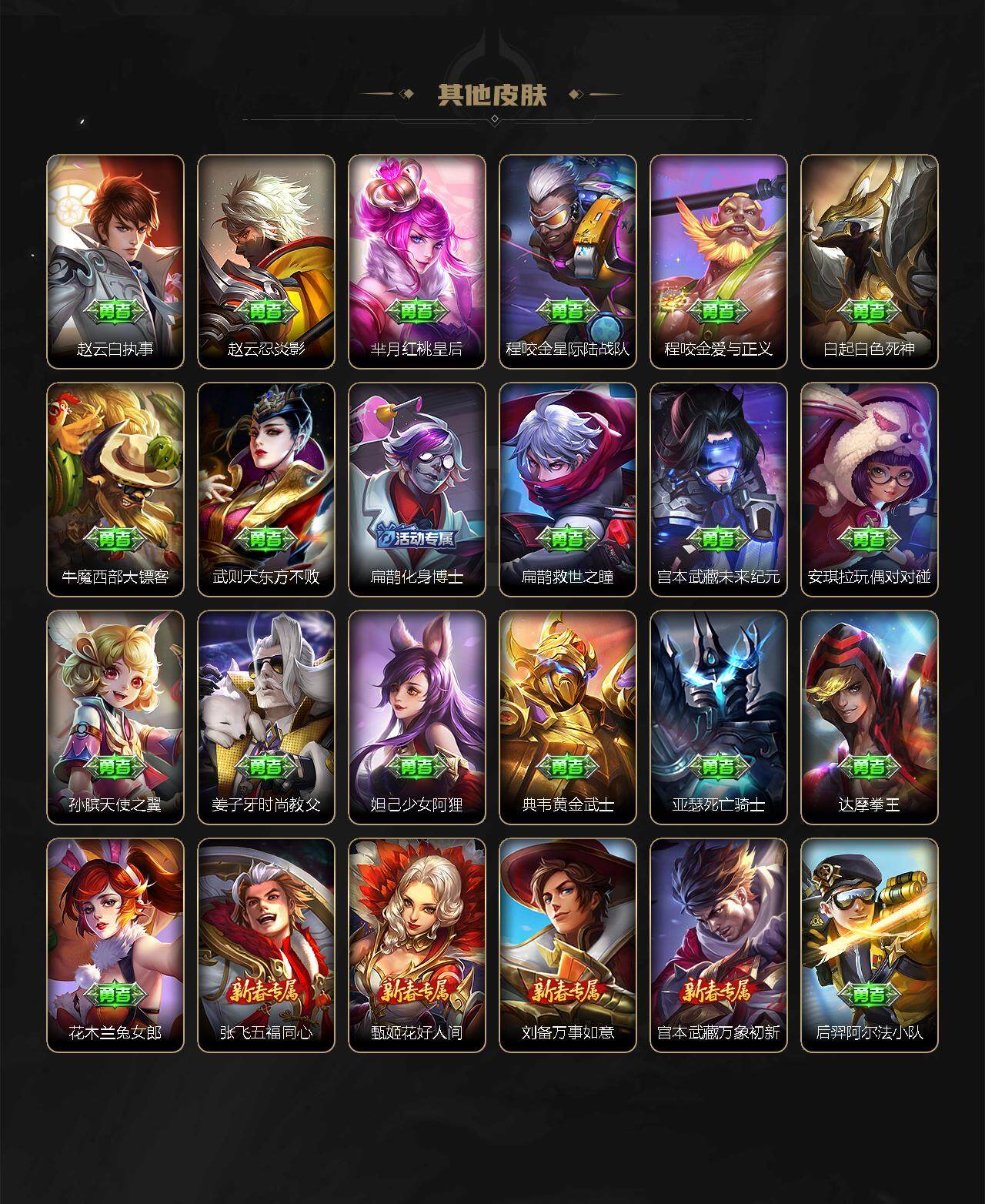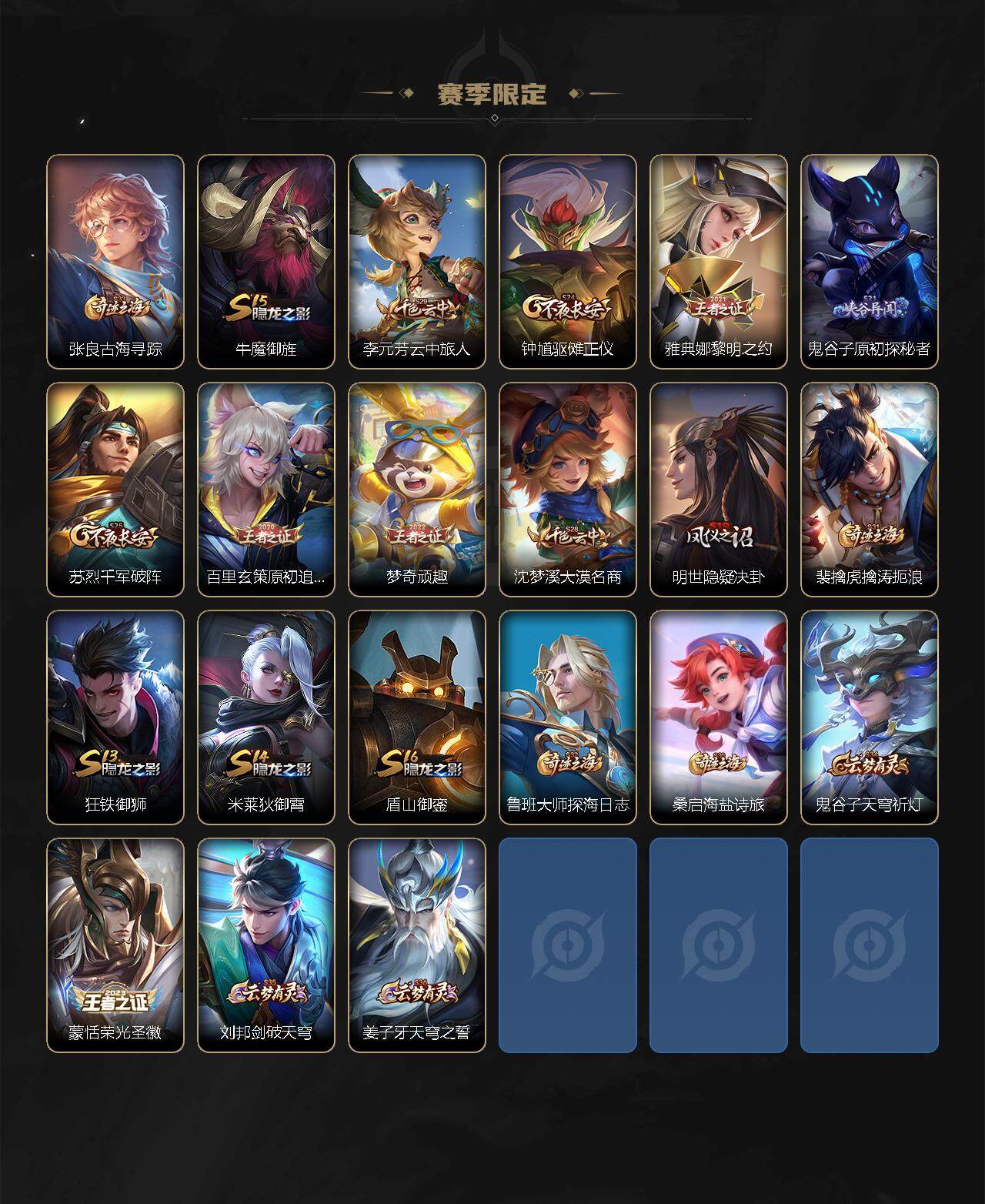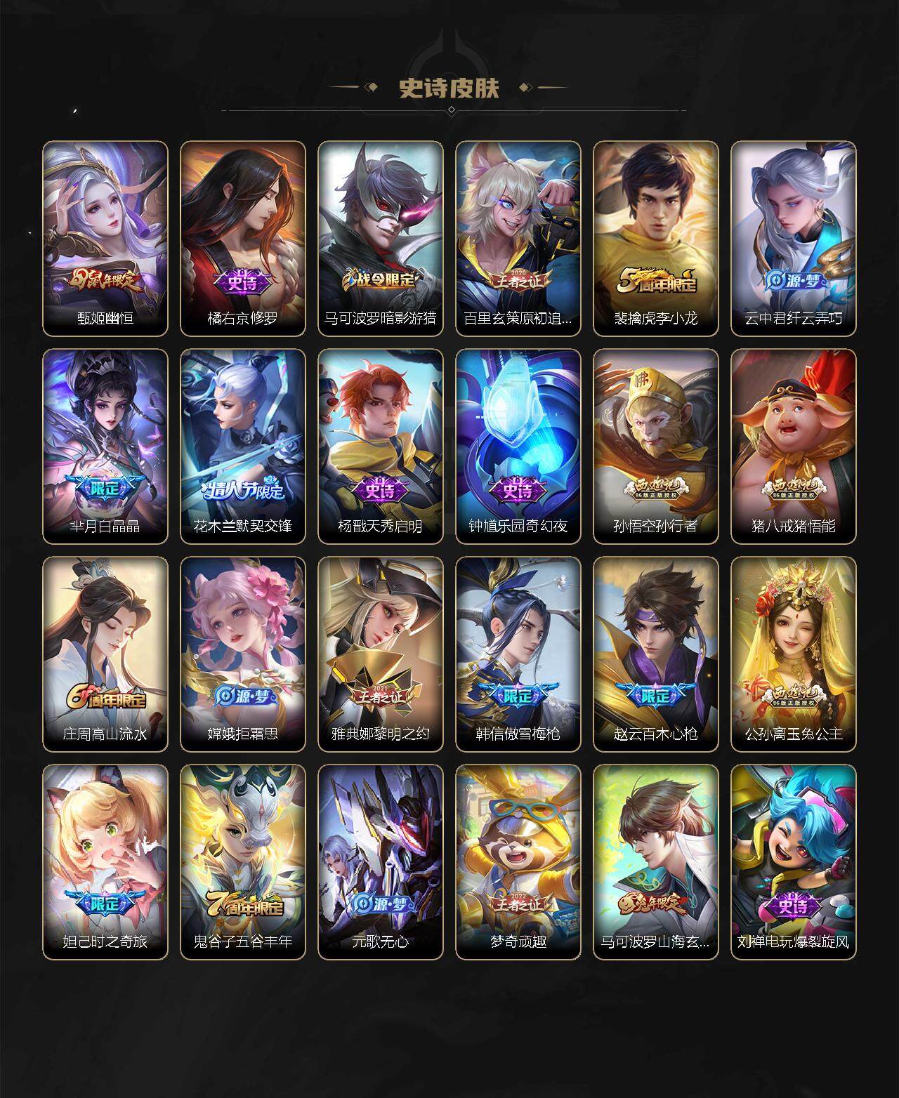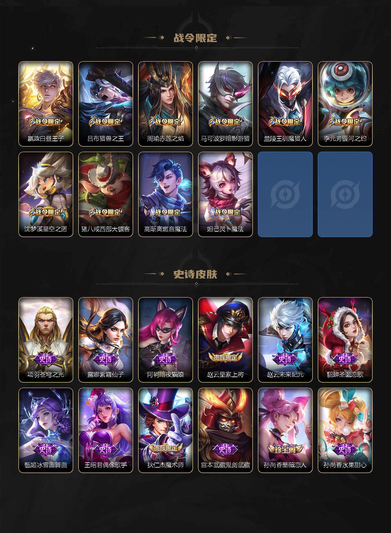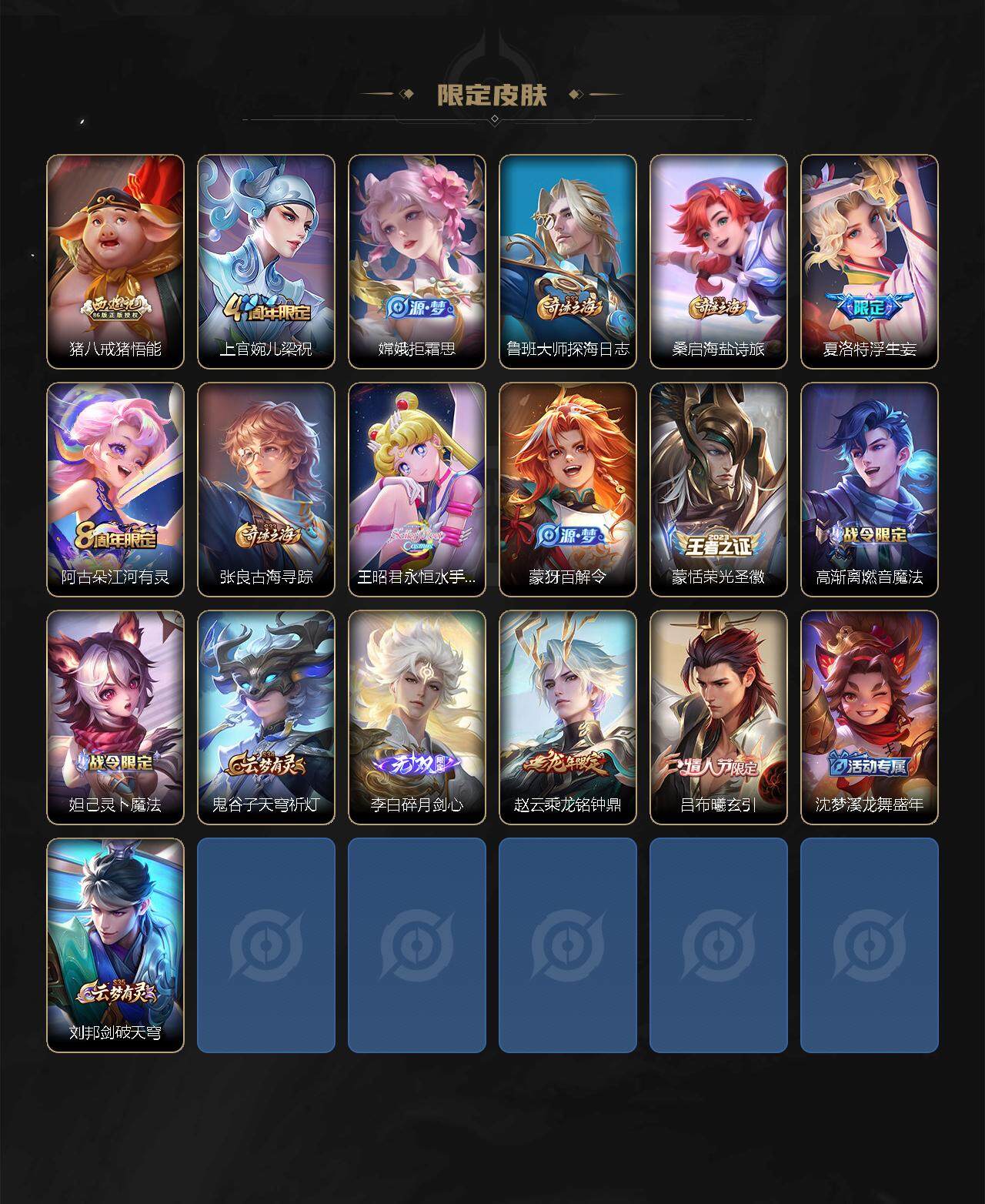 【限定皮肤】:姜子牙天穹之誓,李白谪仙醉月,狄仁杰阴阳师,赵云皇家上将,赵云百木心枪,妲己时之奇旅,嬴政优雅恋人,嬴政白昼王子,孙尚香蔷薇恋人,孙尚香异界灵契,鲁班七号寅虎瑞焰,庄周高山流水,高渐离玩趣恶龙,芈月白晶晶,吕布天魔缭乱,吕布猎兽之王,周瑜赤莲之焰,元歌无心,夏侯惇朔风刀,甄姬幽恒,甄姬游园惊梦,典韦岱宗,马可波罗逐梦之星,马可波罗暗影游猎,马可波罗深海之息,马可波罗山海玄木吟,狄仁杰魔术师,狄仁杰万华元夜,狄仁杰神器狴犴令,达摩沙漠行僧,项羽海滩派对,老夫子醍醐杖,关羽武圣,程咬金演武夺筹,露娜一生所爱,韩信傲雪梅枪,兰陵王驯魔猎人,兰陵王金庭之子,花木兰青春决赛季,花木兰默契交锋,橘右京枫霜尽,孙悟空至尊宝,孙悟空大圣娶亲,孙悟空零号赤焰,孙悟空孙行者,牛魔御旌,后羿辉光之辰,李元芳银河之约,李元芳云中旅人,虞姬启明星使,钟馗驱傩正仪,杨玉环遇见飞天,干将莫邪画中仙,雅典娜黎明之约,鬼谷子原初探秘者,鬼谷子五谷丰年,诸葛亮武陵仙君,诸葛亮时雨天司,诸葛亮鹤羽星尊,铠青龙志,苏烈千军破阵,百里玄策原初追逐者,百里守约朱雀志,弈星混沌棋,梦奇顽趣,公孙离玉兔公主,沈梦溪星空之诺,沈梦溪大漠名商,明世隐疑决卦,裴擒虎李小龙,裴擒虎寅虎赤拳,裴擒虎擒涛扼浪