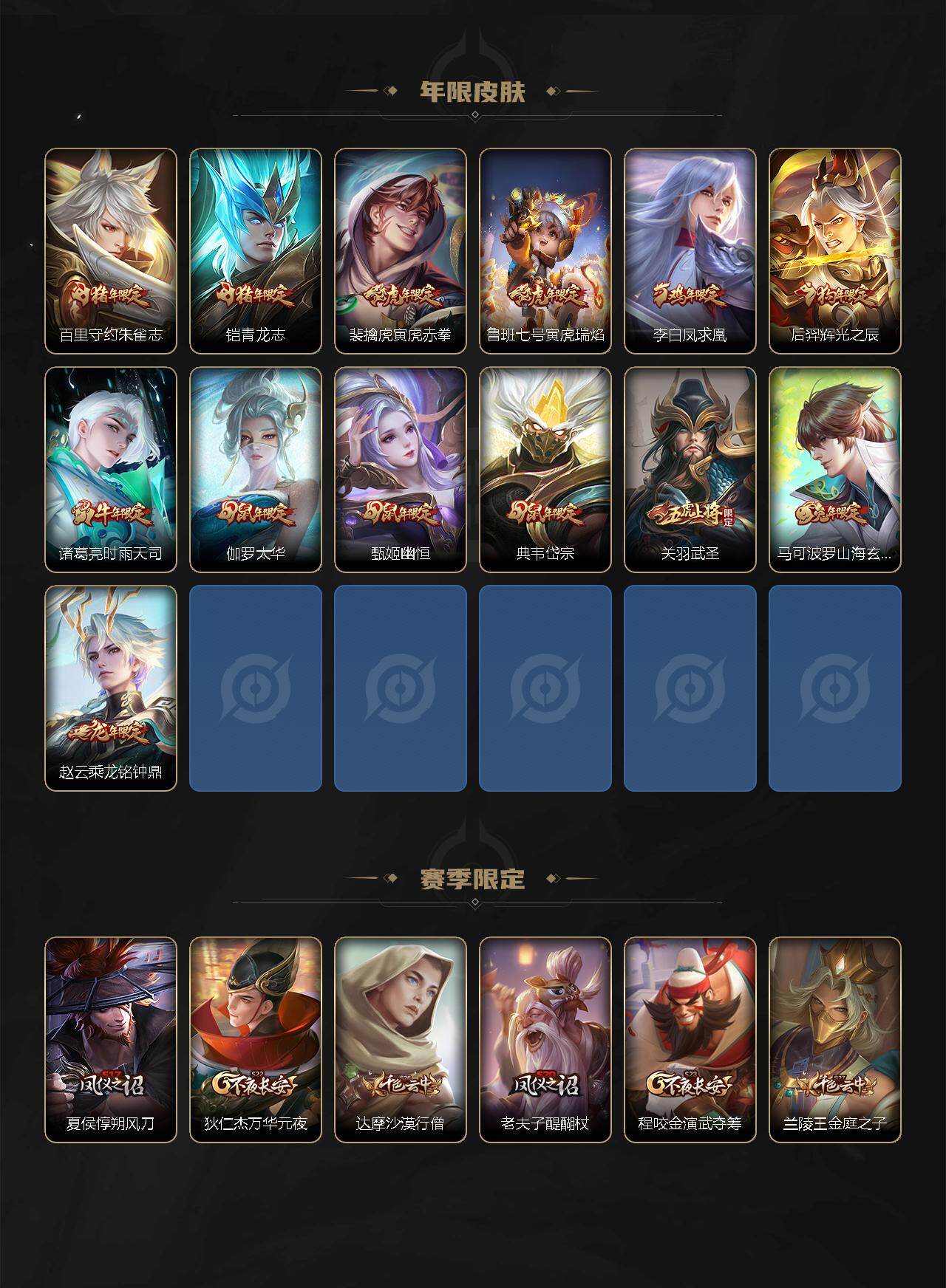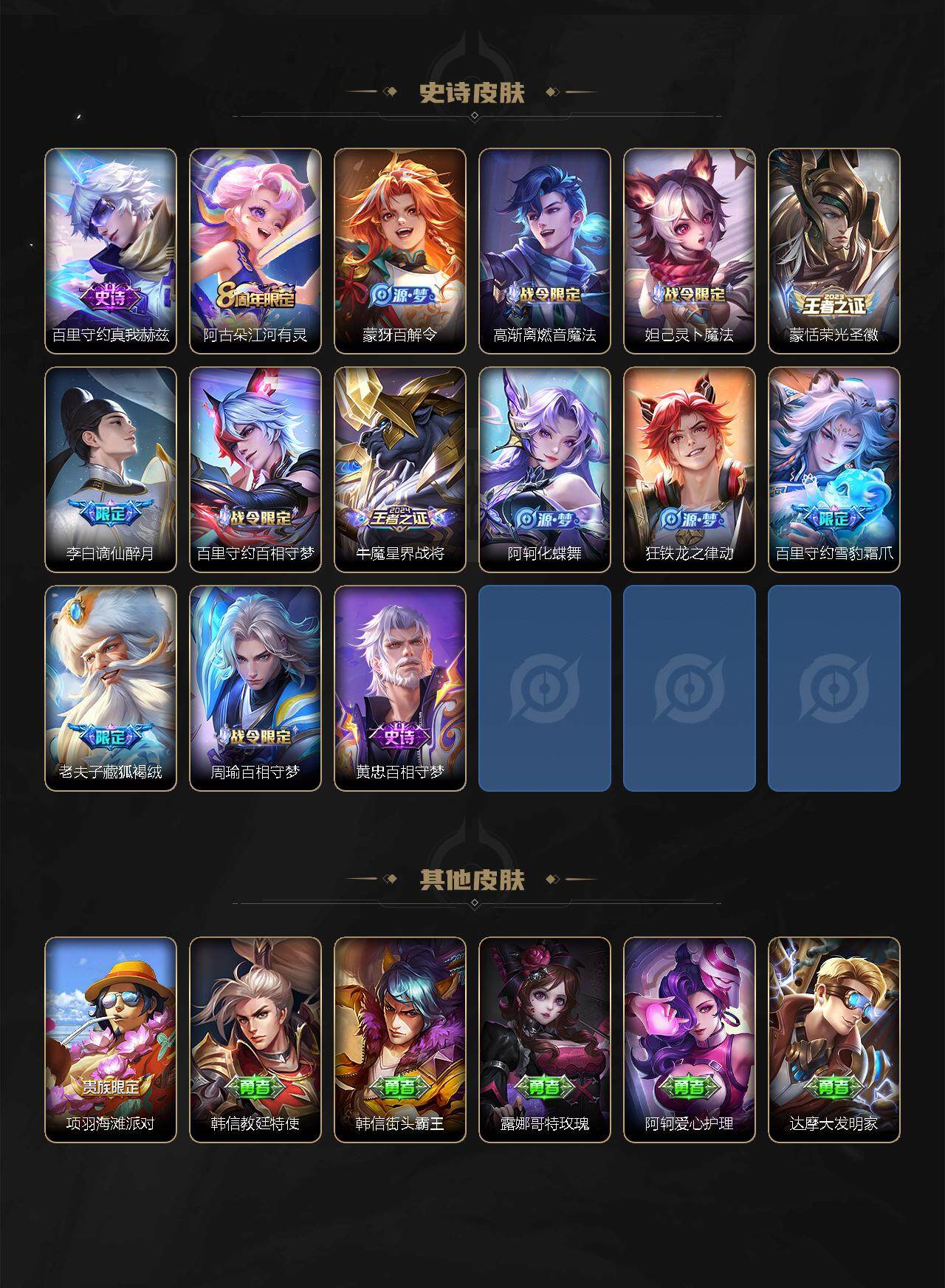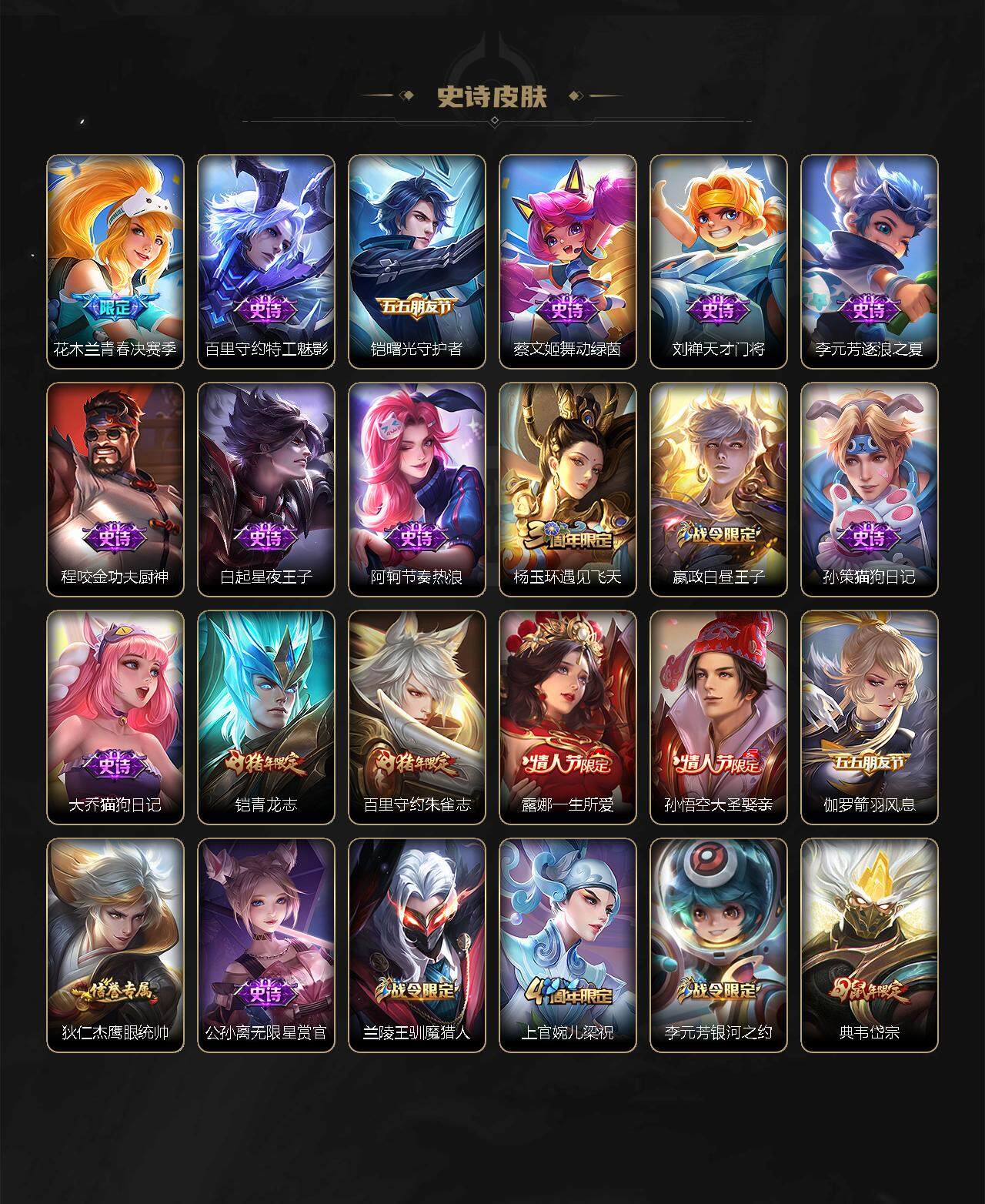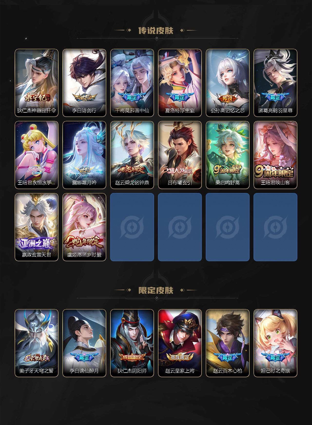 【限定皮肤】:姜子牙天穹之誓,李白谪仙醉月,狄仁杰阴阳师,赵云皇家上将,赵云百木心枪,妲己时之奇旅,嬴政优雅恋人,嬴政白昼王子,孙尚香蔷薇恋人,孙尚香异界灵契,鲁班七号寅虎瑞焰,庄周高山流水,高渐离玩趣恶龙,芈月白晶晶,吕布天魔缭乱,吕布猎兽之王,周瑜赤莲之焰,元歌无心,夏侯惇朔风刀,甄姬幽恒,甄姬游园惊梦,典韦岱宗,马可波罗逐梦之星,马可波罗暗影游猎,马可波罗深海之息,马可波罗山海玄木吟,狄仁杰魔术师,狄仁杰万华元夜,狄仁杰神器狴犴令,达摩沙漠行僧,项羽海滩派对,老夫子醍醐杖,关羽武圣,程咬金演武夺筹,露娜一生所爱,韩信傲雪梅枪,兰陵王驯魔猎人,兰陵王金庭之子,花木兰青春决赛季,花木兰默契交锋,橘右京枫霜尽,孙悟空至尊宝,孙悟空大圣娶亲,孙悟空零号赤焰,孙悟空孙行者,牛魔御旌,后羿辉光之辰,李元芳银河之约,李元芳云中旅人,虞姬启明星使,钟馗驱傩正仪,杨玉环遇见飞天,干将莫邪画中仙,雅典娜黎明之约,鬼谷子原初探秘者,鬼谷子五谷丰年,诸葛亮武陵仙君,诸葛亮时雨天司,诸葛亮鹤羽星尊,铠青龙志,苏烈千军破阵,百里玄策原初追逐者,百里守约朱雀志,弈星混沌棋,梦奇顽趣,公孙离玉兔公主,沈梦溪星空之诺,沈梦溪大漠名商,明世隐疑决卦,裴擒虎李小龙,裴擒虎寅虎赤拳,裴擒虎擒涛扼浪