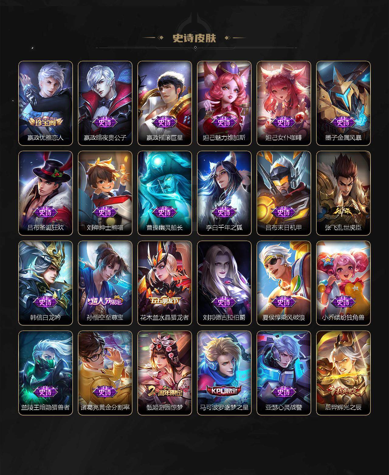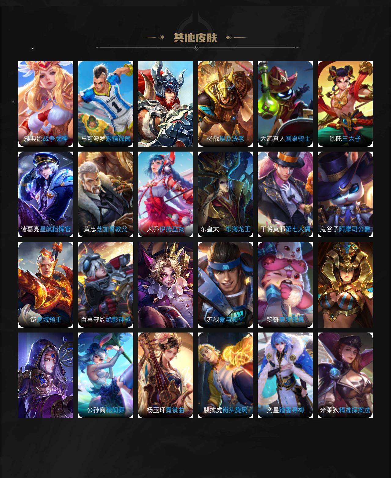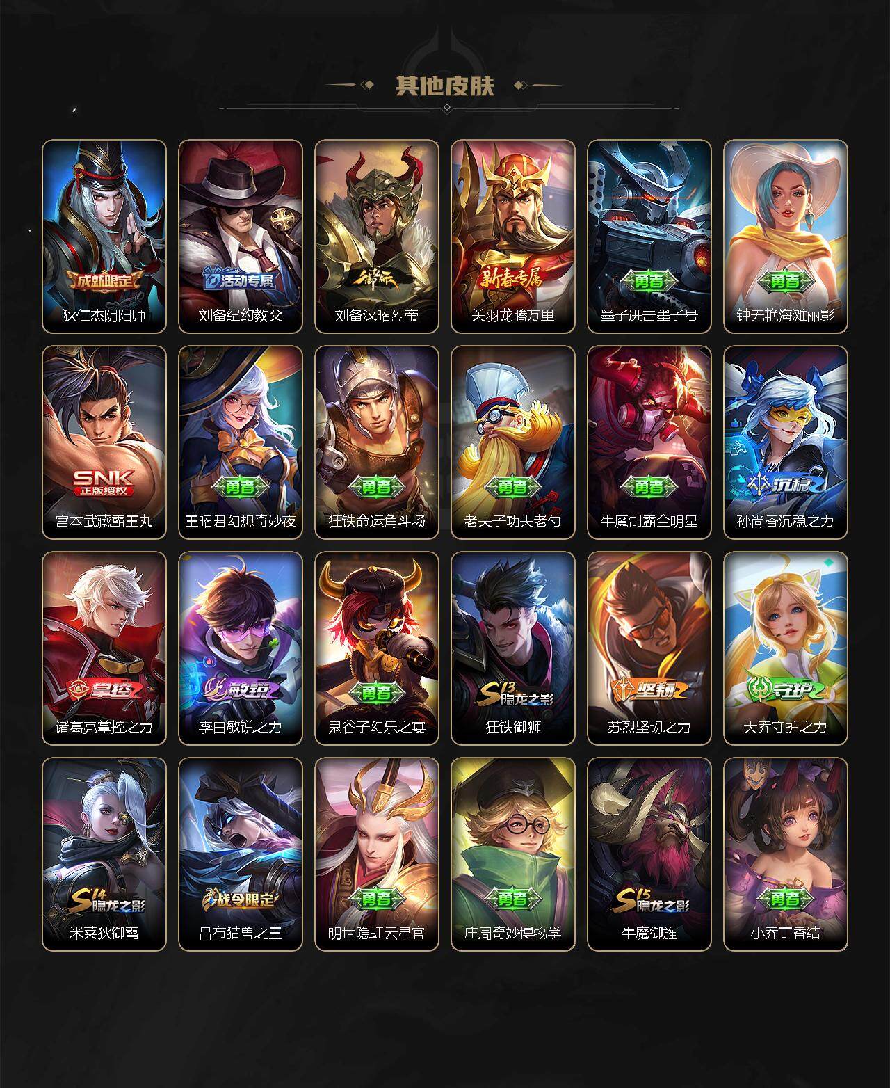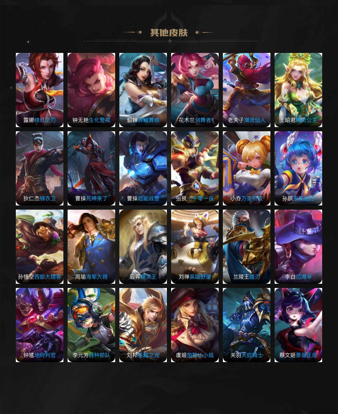 伽罗箭羽风息,李元芳逐浪之夏,公孙离无限星赏官,大乔猫狗日记,孙策猫狗日记,阿轲节奏热浪,露娜紫霞仙子,诸葛亮黄金分割率,王昭君偶像歌手,韩信白龙吟,项羽苍穹之光,阿轲暗夜猫娘,吕布末日机甲,橘右京修罗,嬴政摇滚巨星,刘禅绅士熊喵,刘禅天才门将,白起星夜王子,程咬金功夫厨神,刘邦德古拉伯爵,兰陵王暗隐猎兽者,曹操幽灵船长,宫本武藏鬼剑武藏,亚瑟心灵战警,钟馗乐园奇幻夜,杨戬天秀·启明,蔡文姬舞动绿茵,小乔缤纷独角兽,夏侯惇乘风破浪,花木兰水晶猎龙者,铠曙光守护者,墨子金属风暴,百里玄策原初追逐者,吕布圣诞狂欢,貂蝉圣诞恋歌,百里守约特工魅影,嬴政暗夜贵公子,嫦娥拒霜思,雅典娜黎明之约,李白千年之狐,刘禅电玩·爆裂旋风,百里守约真我赫兹,蒙犽百解令,高渐离燃音魔法,李白谪仙醉月