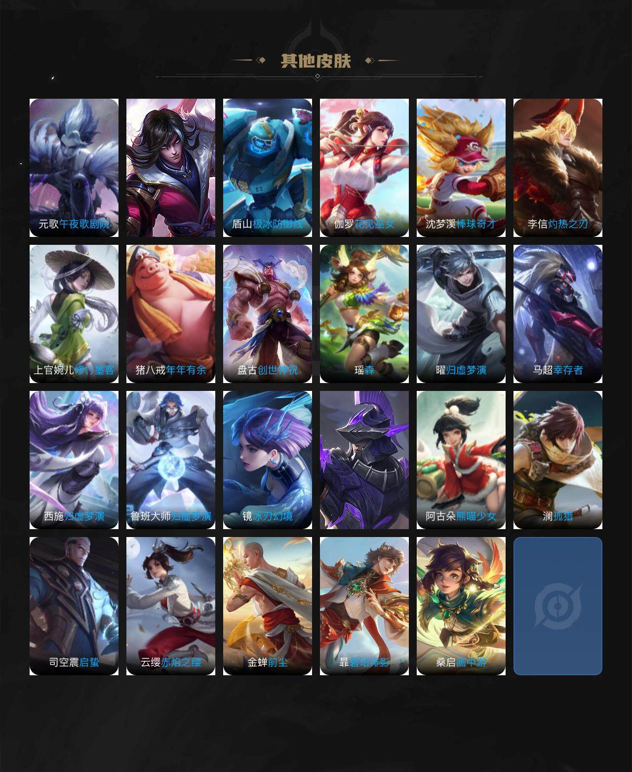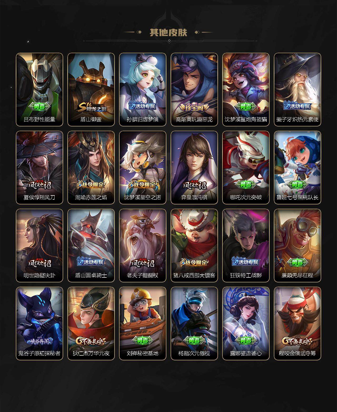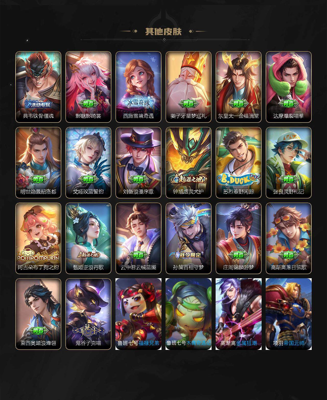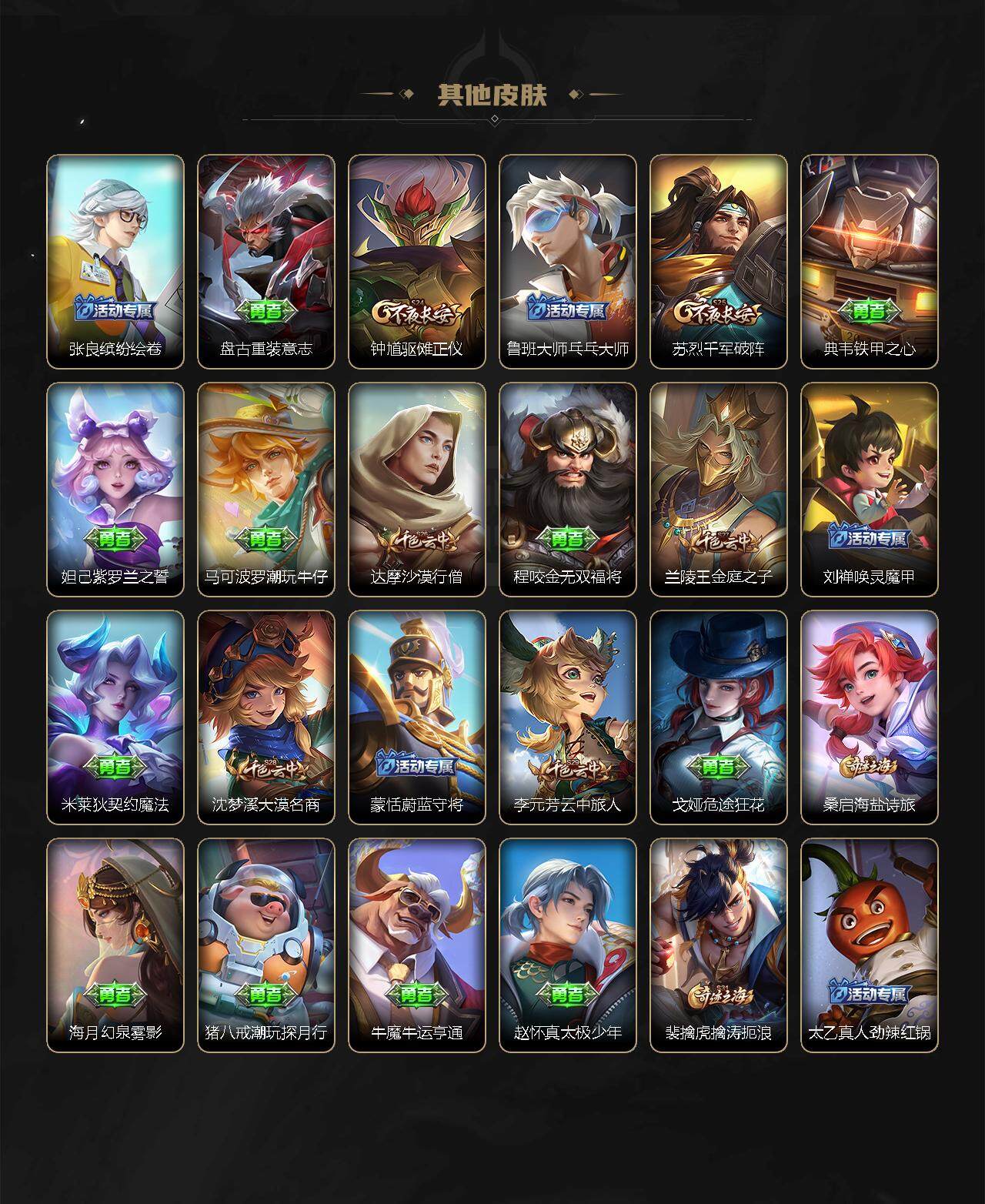 裴擒虎李小龙,上官婉儿梁祝,诸葛亮时雨天司,关羽武圣,后羿辉光之辰,典韦岱宗,甄姬幽恒,伽罗太华,马可波罗逐梦之星,铠青龙志,百里守约朱雀志,孙悟空大圣娶亲,露娜一生所爱,花木兰默契交锋,孙悟空至尊宝,花木兰青春决赛季,芈月白晶晶,猪八戒猪悟能,孙尚香异界灵契,孙悟空孙行者,韩信傲雪梅枪,鲁班七号寅虎·瑞焰,裴擒虎寅虎·赤拳,赵云百木心枪,公孙离玉兔公主,马可波罗深海之息,橘右京枫霜尽,妲己时之奇旅,李白诗剑行,马可波罗山海·玄木吟,桑启鸣野蒿,王昭君映山客,虞姬愿照·岁时盈