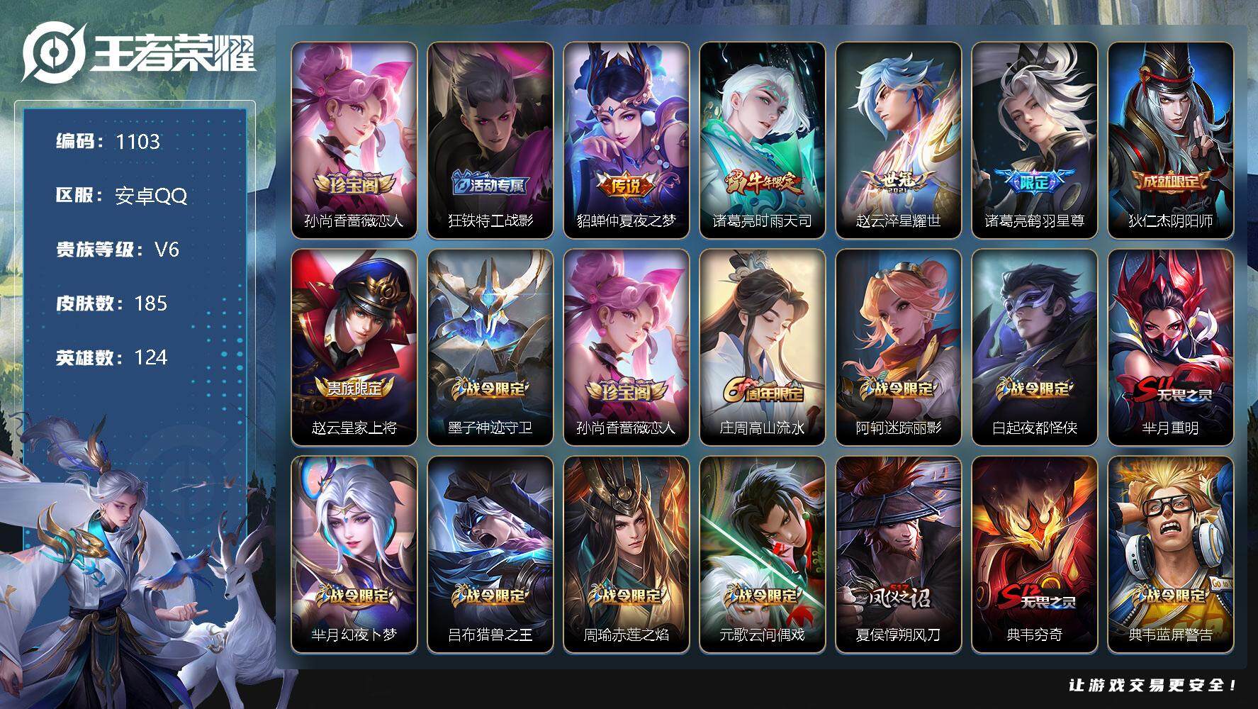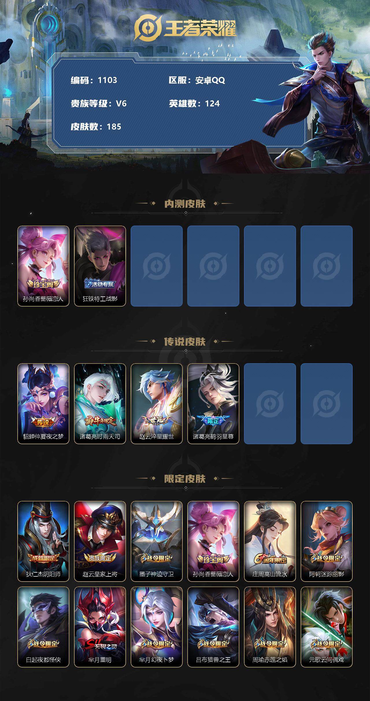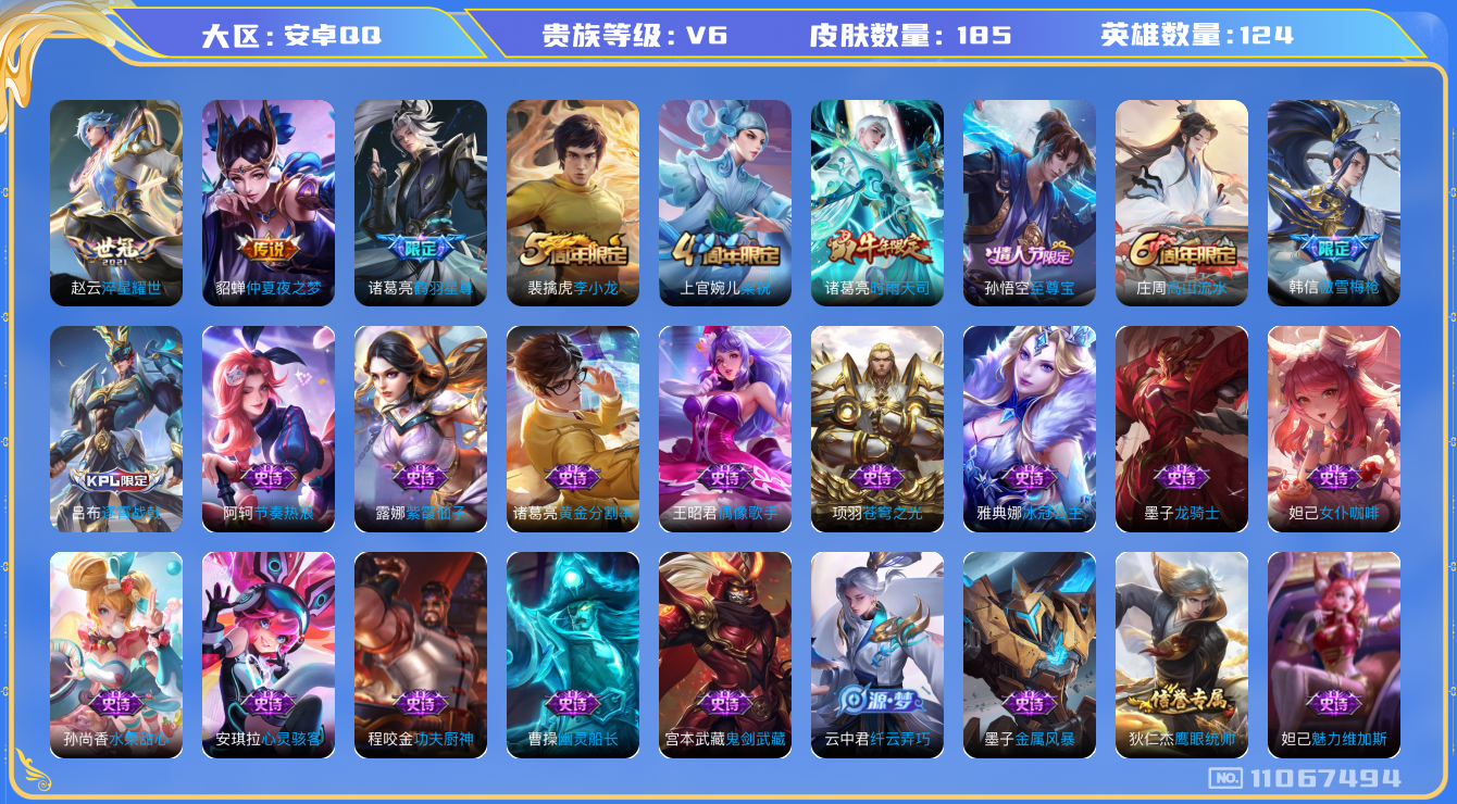 [11067494]【商品标题】:安卓Q-V6-永恒钻石III段位-124英雄-185皮肤-0典藏-0珍品无双-0无双-0珍品传说-4传说-41史诗