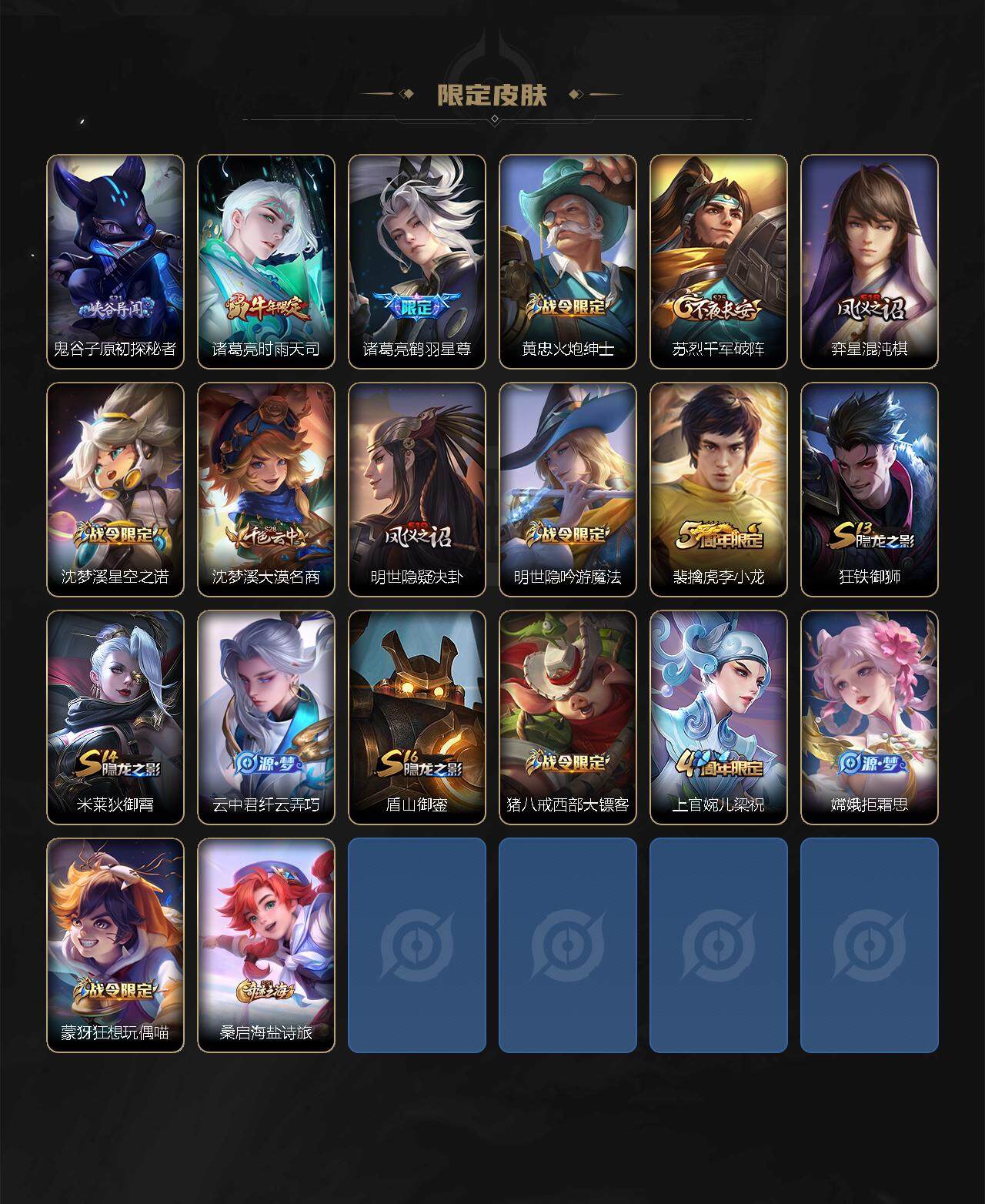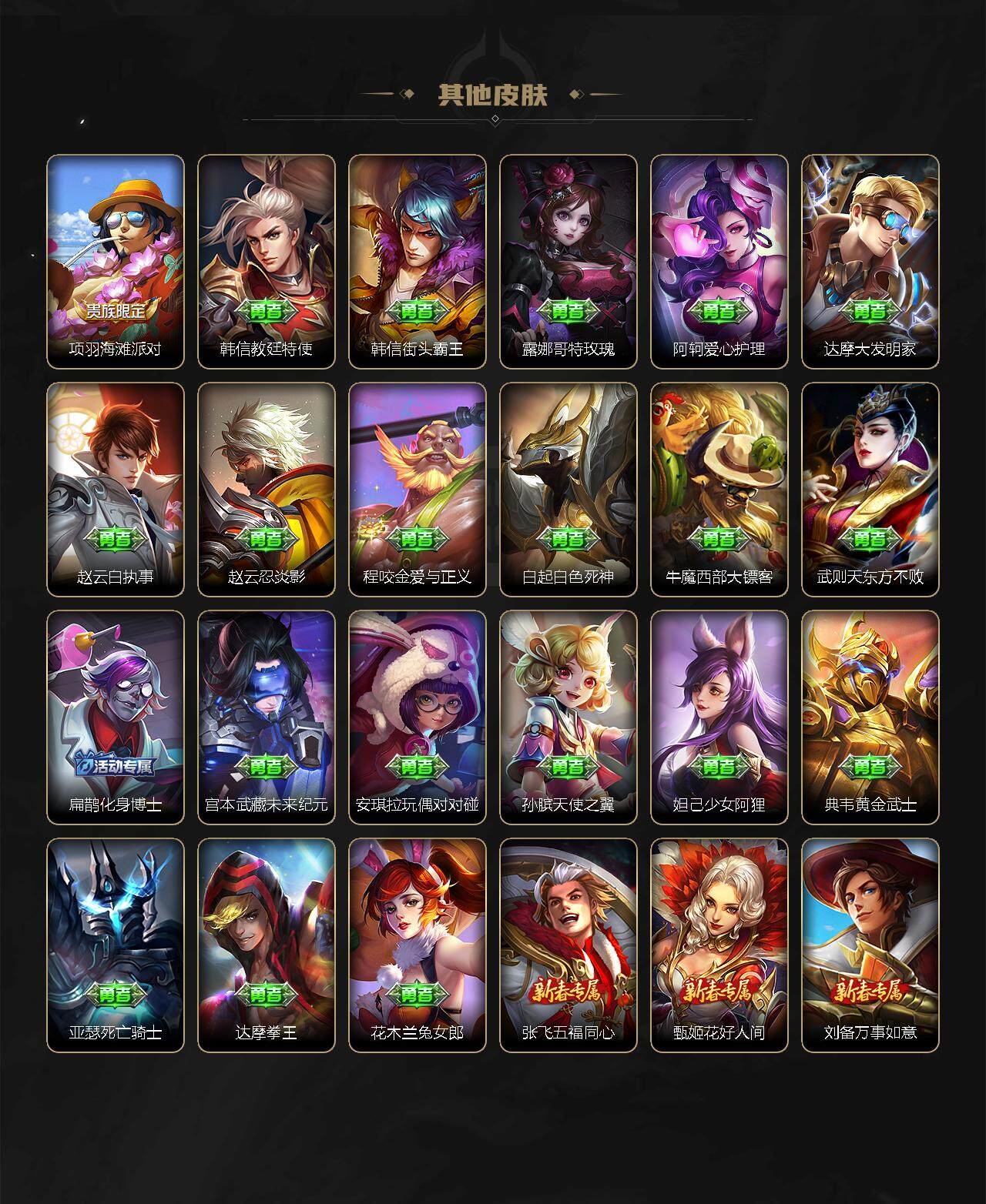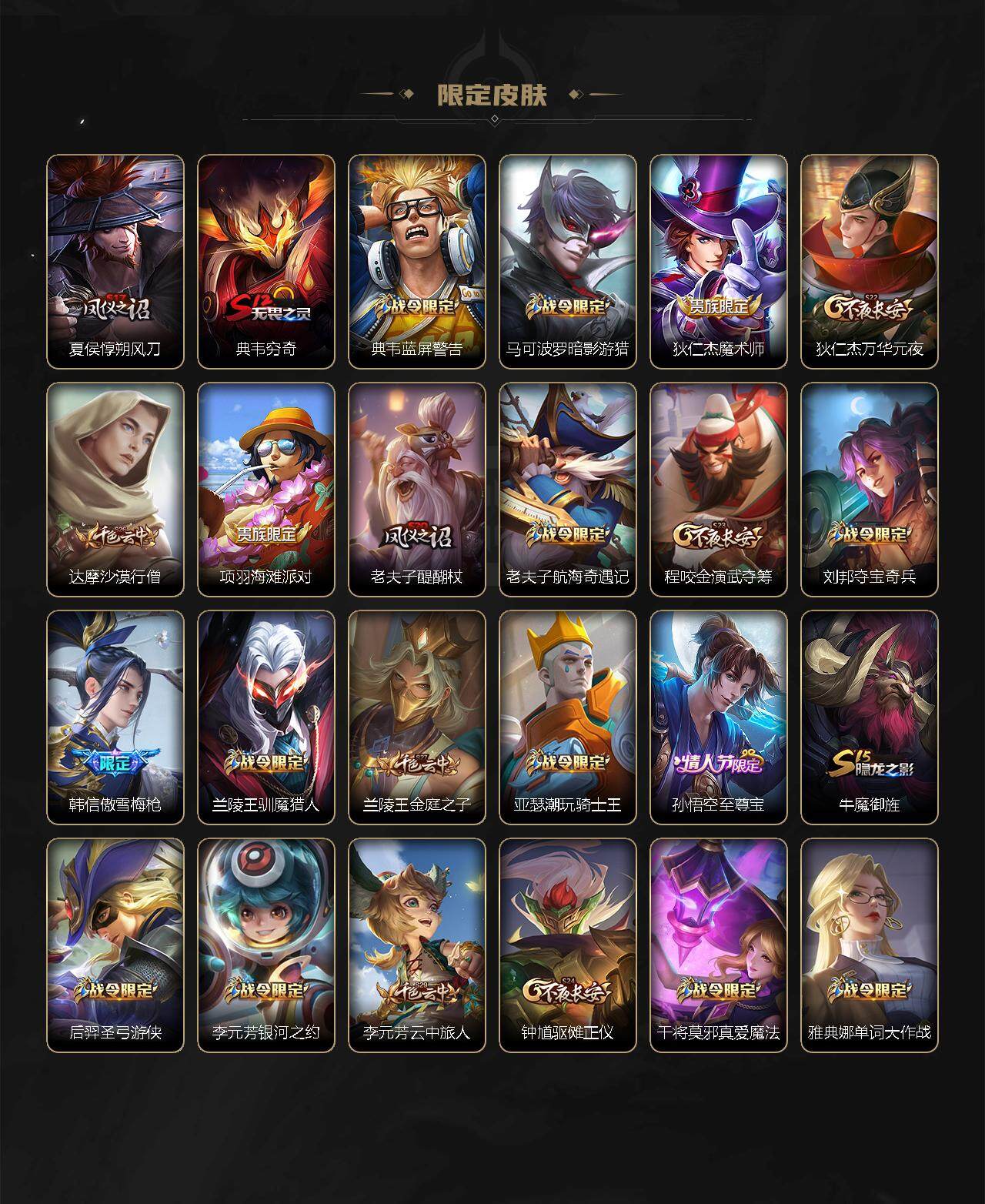 【限定皮肤】:狄仁杰阴阳师,赵云皇家上将,墨子神迹守卫,孙尚香蔷薇恋人,庄周高山流水,阿轲迷踪丽影,白起夜都怪侠,芈月重明,芈月幻夜卜梦,吕布猎兽之王,周瑜赤莲之焰,元歌云间偶戏,夏侯惇朔风刀,典韦穷奇,典韦蓝屏警告,马可波罗暗影游猎,狄仁杰魔术师,狄仁杰万华元夜,达摩沙漠行僧,项羽海滩派对,老夫子醍醐杖,老夫子航海奇遇记,程咬金演武夺筹,刘邦夺宝奇兵,韩信傲雪梅枪,兰陵王驯魔猎人,兰陵王金庭之子,亚瑟潮玩骑士王,孙悟空至尊宝,牛魔御旌,后羿圣弓游侠,李元芳银河之约,李元芳云中旅人,钟馗驱傩正仪,干将莫邪真爱魔法,雅典娜单词大作战,鬼谷子原初探秘者,诸葛亮时雨天司,诸葛亮鹤羽星尊,黄忠火炮绅士,苏烈千军破阵,弈星混沌棋,沈梦溪星空之诺,沈梦溪大漠名商,明世隐疑决卦,明世隐吟游魔法,裴擒虎李小龙,狂铁御狮,米莱狄御霄,云中君纤云弄巧,盾山御銮,猪八戒西部大镖客,上官婉儿梁祝,嫦娥拒霜思,蒙犽狂想玩偶喵,桑启海盐诗旅