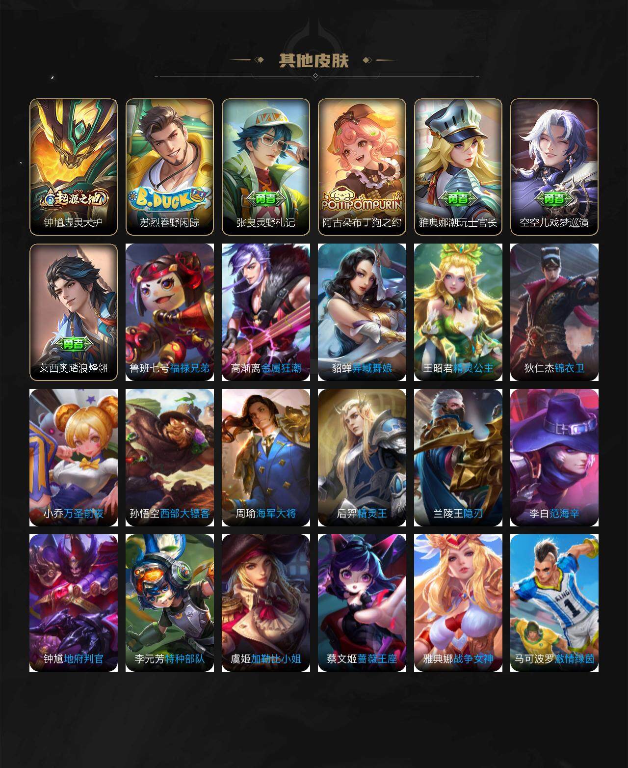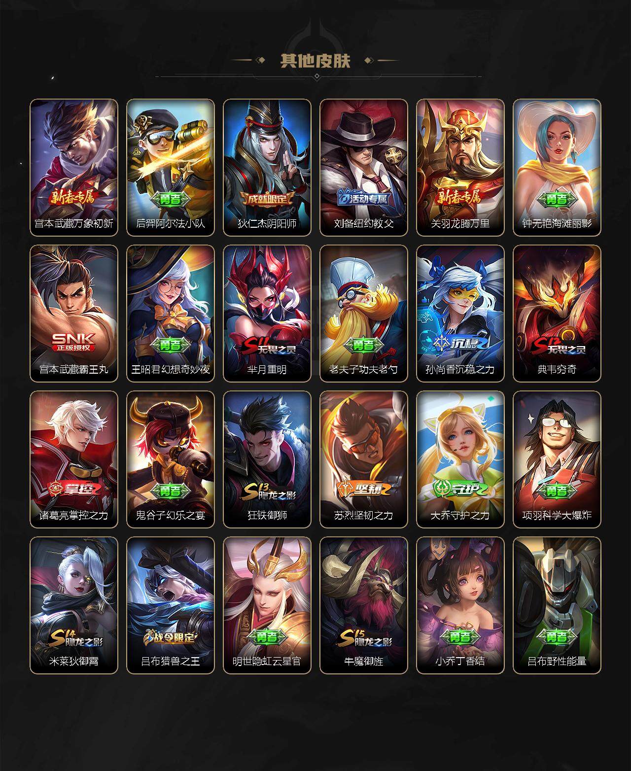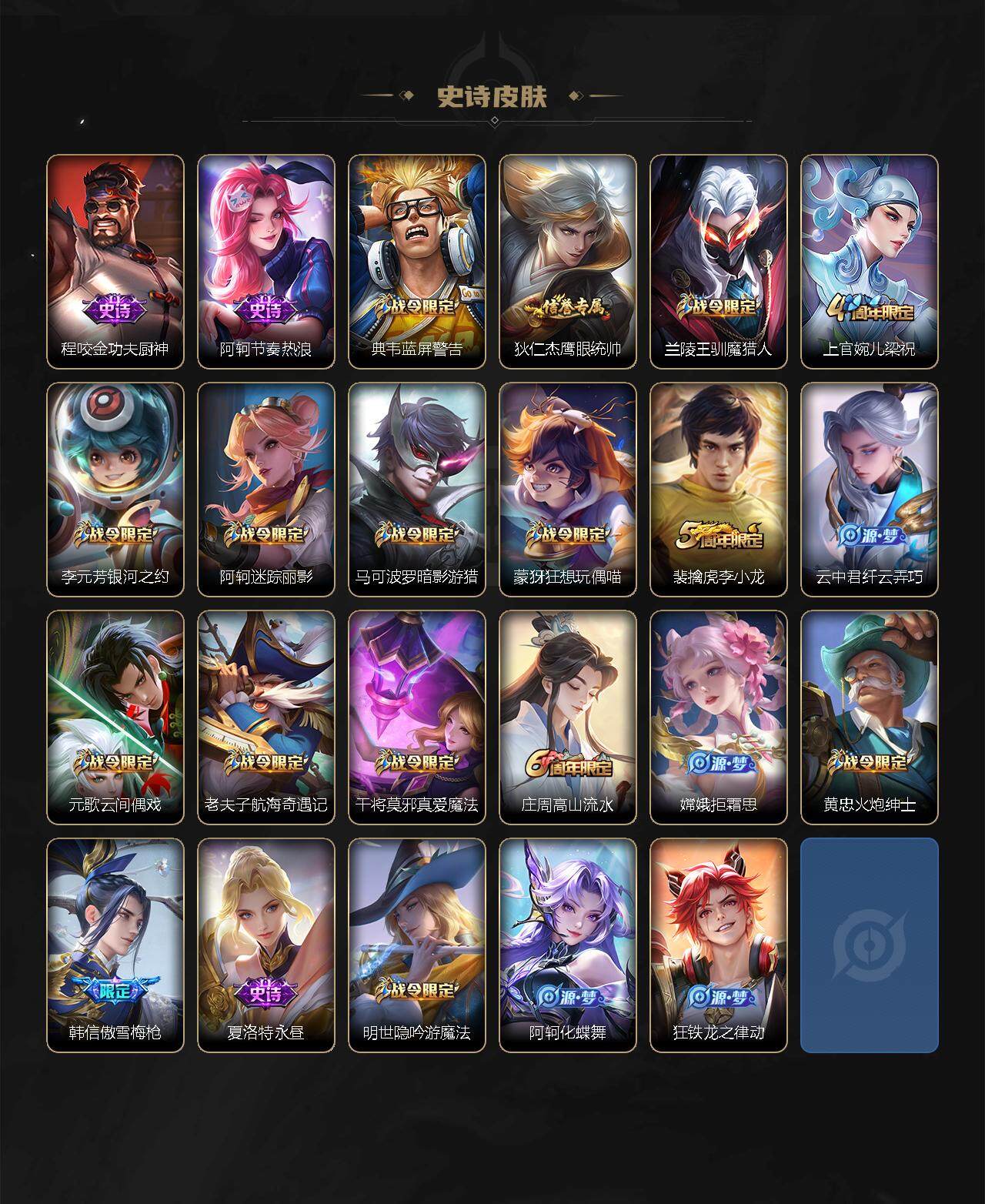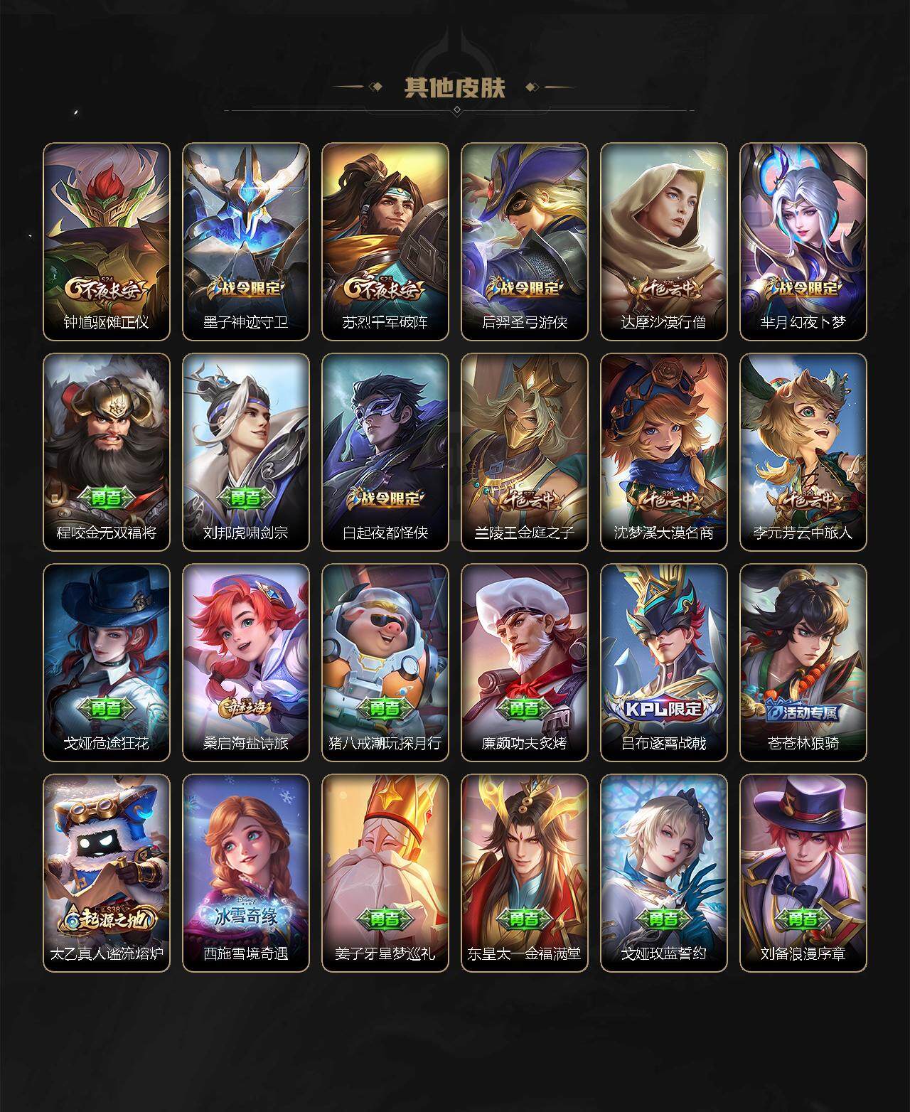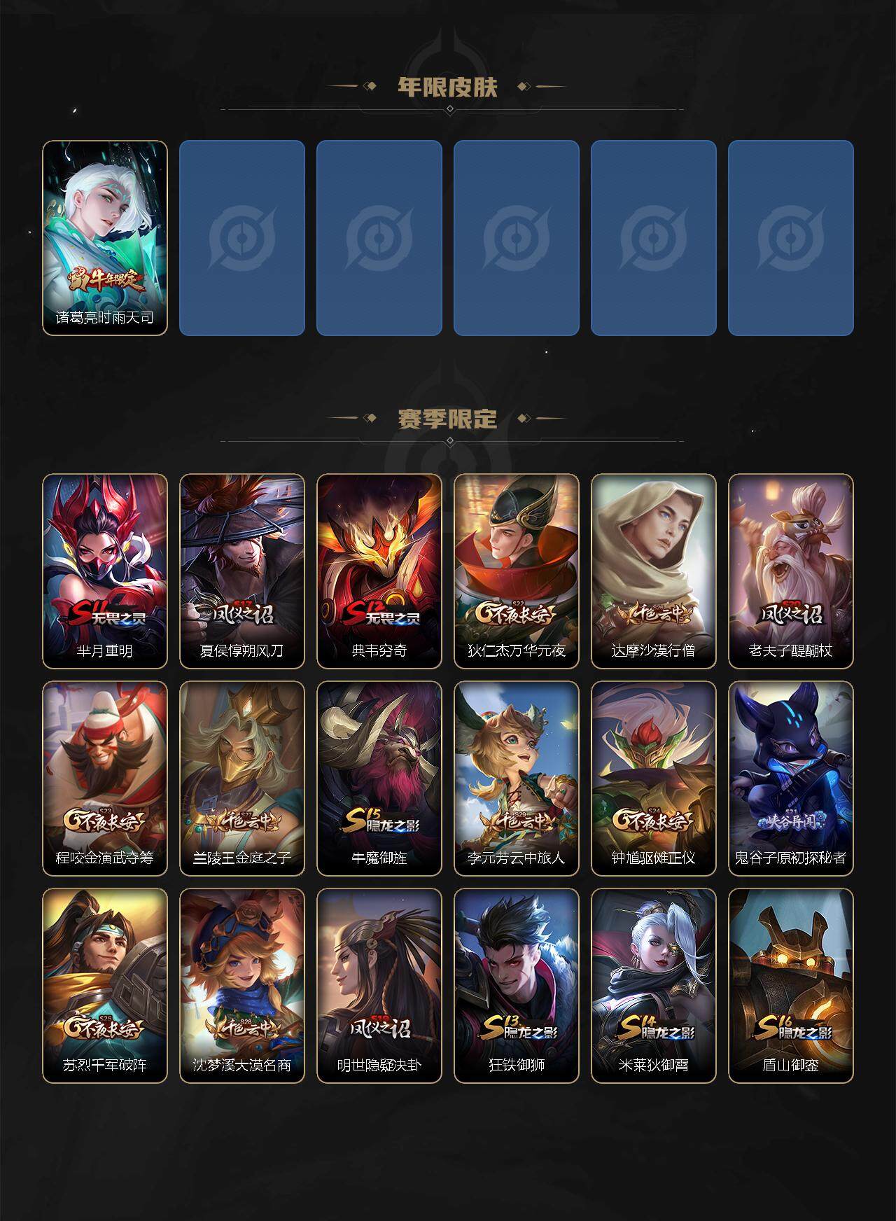 【赛季限定】:芈月重明,夏侯惇朔风刀,典韦穷奇,狄仁杰万华元夜,达摩沙漠行僧,老夫子醍醐杖,程咬金演武夺筹,兰陵王金庭之子,牛魔御旌,李元芳云中旅人,钟馗驱傩正仪,鬼谷子原初探秘者,苏烈千军破阵,弈星混沌棋,沈梦溪大漠名商,明世隐疑决卦,狂铁御狮,米莱狄御霄,盾山御銮,桑启海盐诗旅