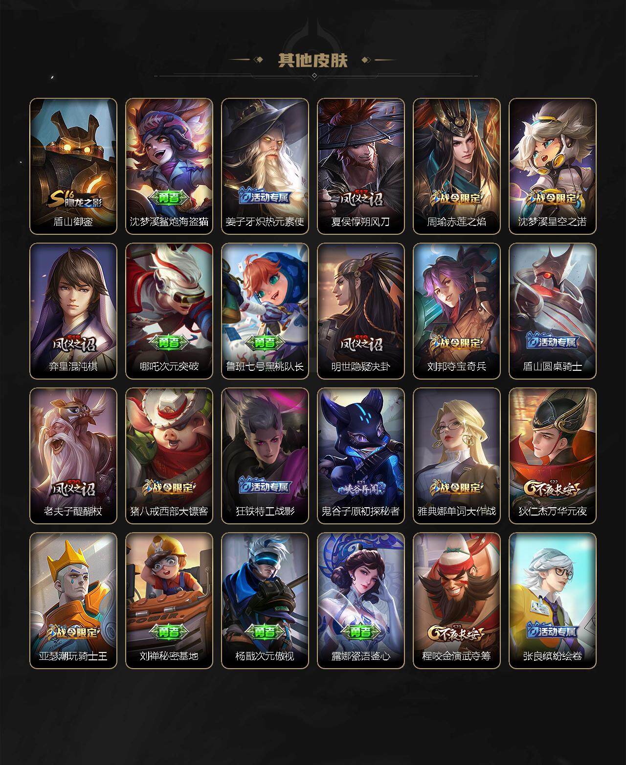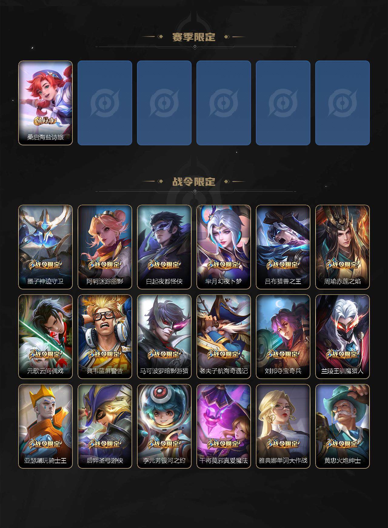 【战令限定】:墨子神迹守卫,阿轲迷踪丽影,白起夜都怪侠,芈月幻夜卜梦,吕布猎兽之王,周瑜赤莲之焰,元歌云间偶戏,典韦蓝屏警告,马可波罗暗影游猎,老夫子航海奇遇记,刘邦夺宝奇兵,兰陵王驯魔猎人,亚瑟潮玩骑士王,后羿圣弓游侠,李元芳银河之约,干将莫邪真爱魔法,雅典娜单词大作战,黄忠火炮绅士,沈梦溪星空之诺,明世隐吟游魔法,猪八戒西部大镖客,蒙犽狂想玩偶喵