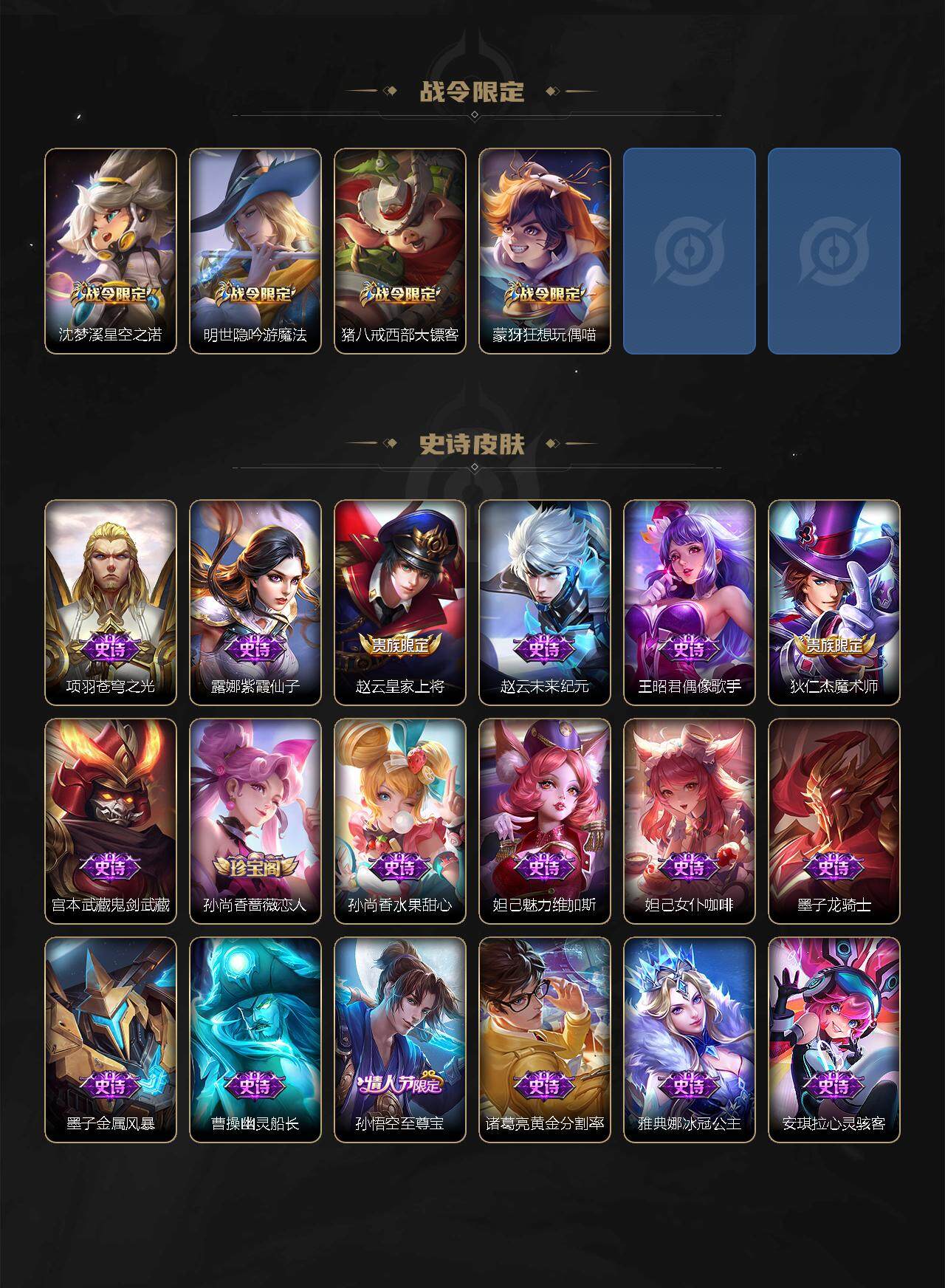 【史诗皮肤】:项羽苍穹之光,露娜紫霞仙子,赵云皇家上将,赵云未来纪元,王昭君偶像歌手,狄仁杰魔术师,宫本武藏鬼剑武藏,孙尚香蔷薇恋人,孙尚香水果甜心,妲己魅力维加斯,妲己女仆咖啡,墨子龙骑士,墨子金属风暴,曹操幽灵船长,孙悟空至尊宝,诸葛亮黄金分割率,雅