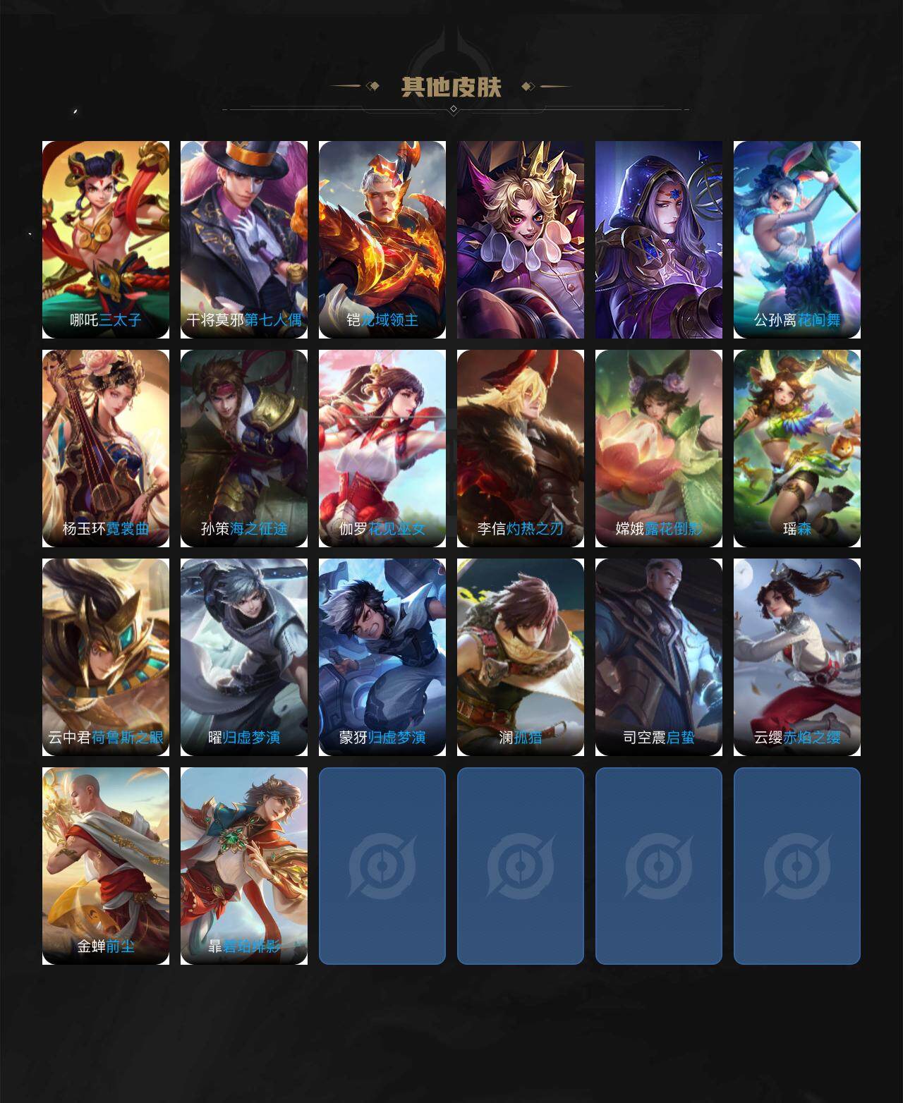芈月重明,典韦穷奇,狂铁御狮,米莱狄御霄,牛魔御旌,盾山御銮,夏侯惇朔风刀,明世隐疑决卦,老夫子醍醐杖,鬼谷子原初探秘者,狄仁杰万华元夜,程咬金演武夺筹,钟馗驱傩正仪,苏烈千军破阵,吕布猎兽之王,典韦蓝屏警告,沈梦溪星空之诺,李元芳银河之约,刘邦夺宝奇兵,马可波罗暗影游猎,蒙犽狂想玩偶喵,元歌云间偶戏,弈星混沌棋,达摩沙漠行僧,兰陵王金庭之子,沈梦溪大漠名商,李元芳云中旅人,桑启海盐诗旅