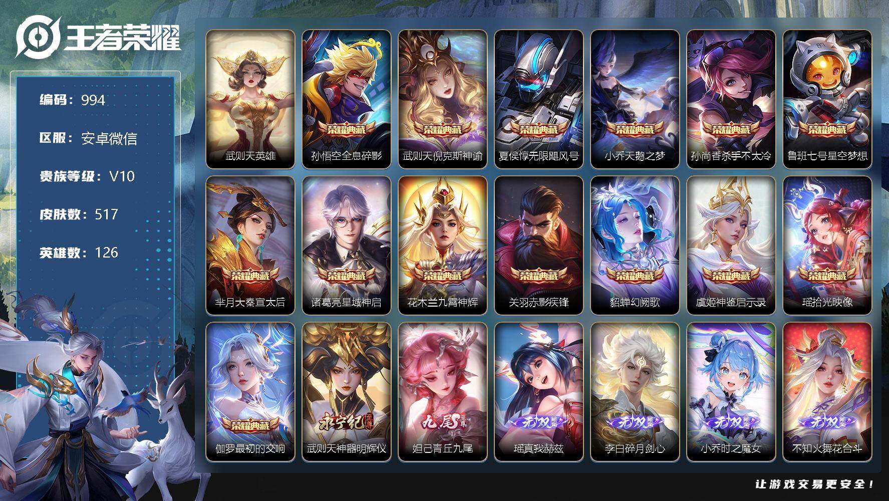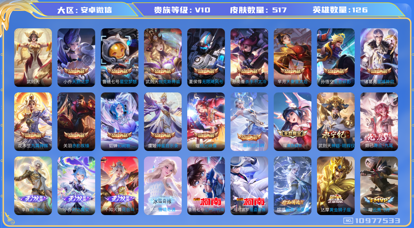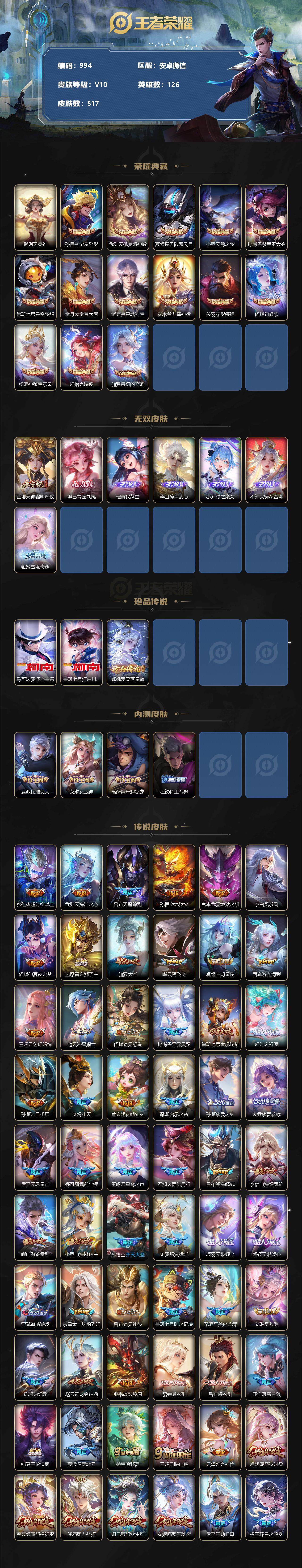 [10977533]【商品标题】:安卓WX-V10-最强王者段位-126英雄-517皮肤-14典藏-0珍品无双-7无双-3珍品传说-60传说-160史诗