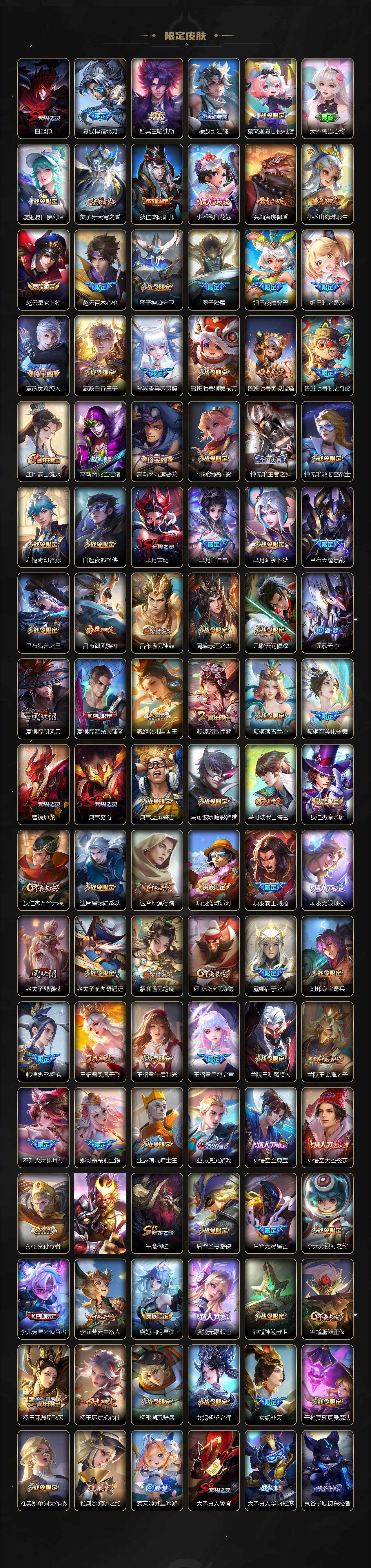 【限定皮肤】:白起狰,夏侯惇霜北刀,铠冥王哈迪斯,蒙犽顽岩魄,蔡文姬夏日便利店,大乔绒语心约,虞姬夏日便利店,姜子牙天穹之誓,狄仁杰阴阳师,小乔纯白花嫁,廉颇寅虎御盾,小乔山海琳琅生,赵云皇家上将,赵云百木心枪,墨子神迹守卫,墨子降魔,妲己热情桑巴,妲己时之奇旅,嬴政优雅恋人,嬴政白昼王子,孙尚香异界灵契,鲁班七号狮舞东方,鲁班七号寅虎瑞焰,鲁班七号时之奇旅,庄周高山流水,高渐离死亡摇滚,高渐离玩趣恶龙,阿轲迷踪丽影,钟无艳王者之锤,钟无艳超时空战士,扁鹊奇幻香踪,白起