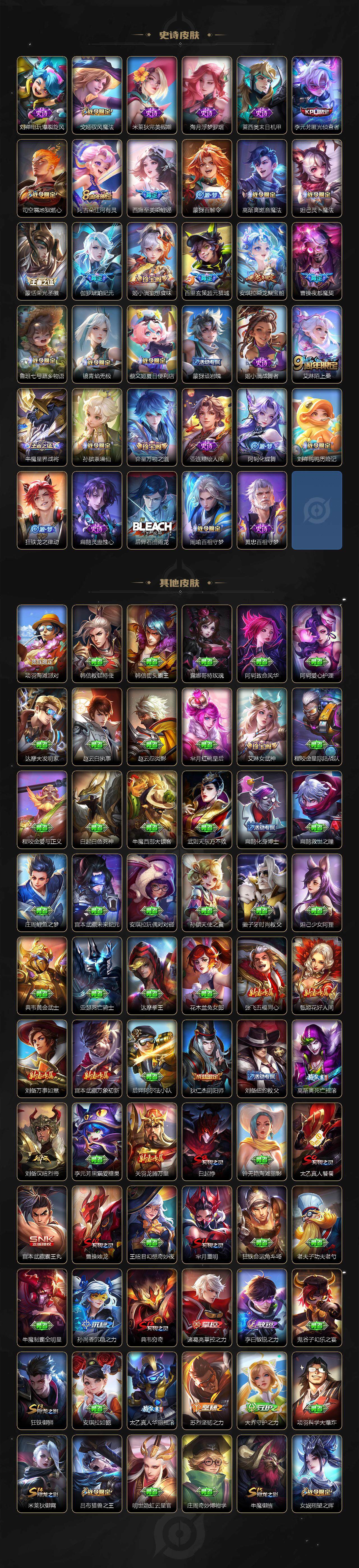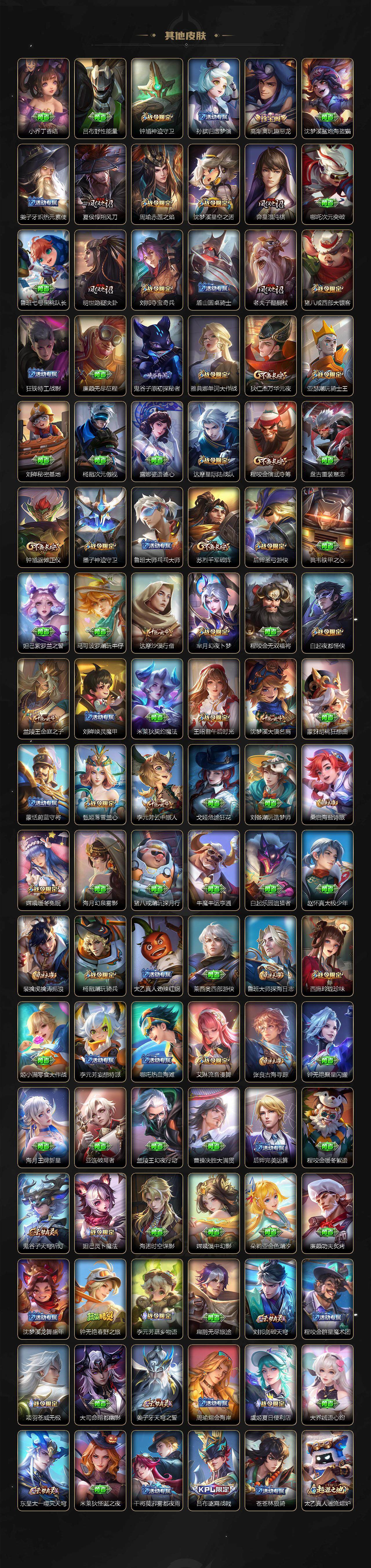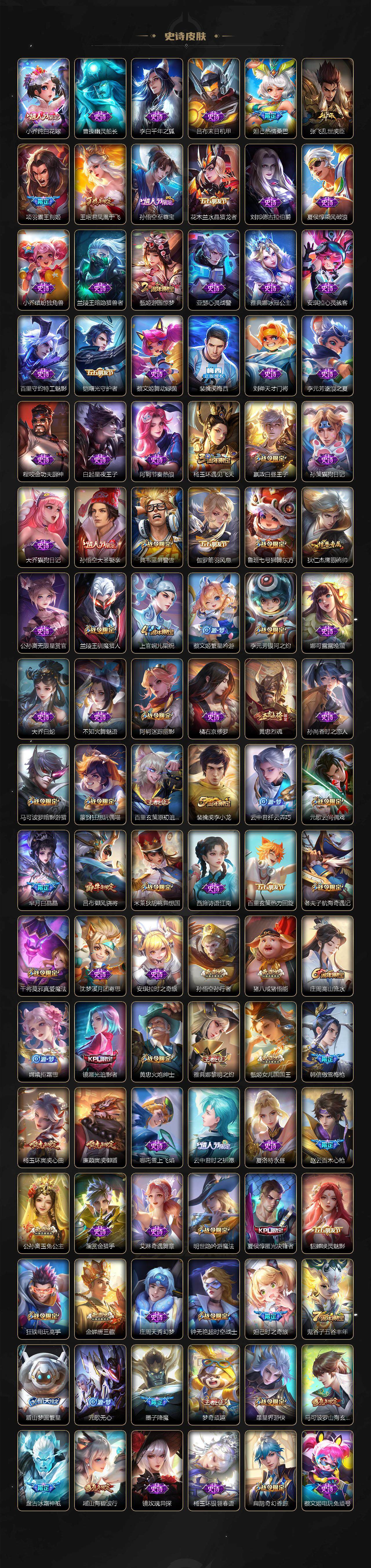 裴擒虎李小龙,上官婉儿梁祝,吕布御风骁将,黄忠烈魂,伽罗太华,王昭君凤凰于飞,项羽霸王别姬,小乔纯白花嫁,孙悟空大圣娶亲,孙悟空至尊宝,裴擒虎梅西,妲己热情桑巴,芈月白晶晶,猪八戒猪悟能,廉颇寅虎·御盾,孙尚香异界灵契,孙悟空孙行者,甄姬女儿国国王,镜匿光追影者,韩信傲雪梅枪,鲁班七号寅虎·瑞焰,杨玉环寅虎·心曲,云中君时之祈愿,瑶时之祈愿,女娲补天,赵云百木心枪,公孙离玉兔公主,露娜启示之音,夏侯惇匿光决锋者,后羿无尽星芒,金蝉唐三藏,娜可露露前尘镜,妲己时之奇旅,王昭君星穹之声,不知火舞绯月行,盾山梦圆繁星,墨子降魔,马可波罗山海·玄木吟,盘古冰霜神祇,瑶山海·碧波行,西施至美·乘鲤谣,甄姬至美·化雀舞,夏侯惇霜北刀,桑启鸣野蒿,艾琳陌上桑,王昭君映山客,澜愿照·九州拓,蔡文姬愿照·福禄聚,虞姬愿照·岁时盈,妲己愿照·众生和,女娲愿照·千秋盛