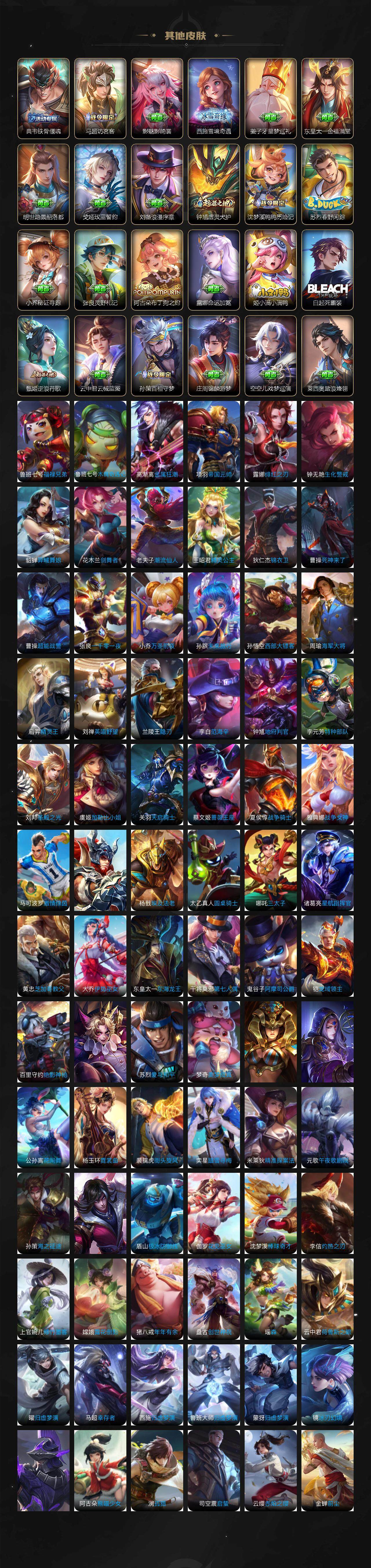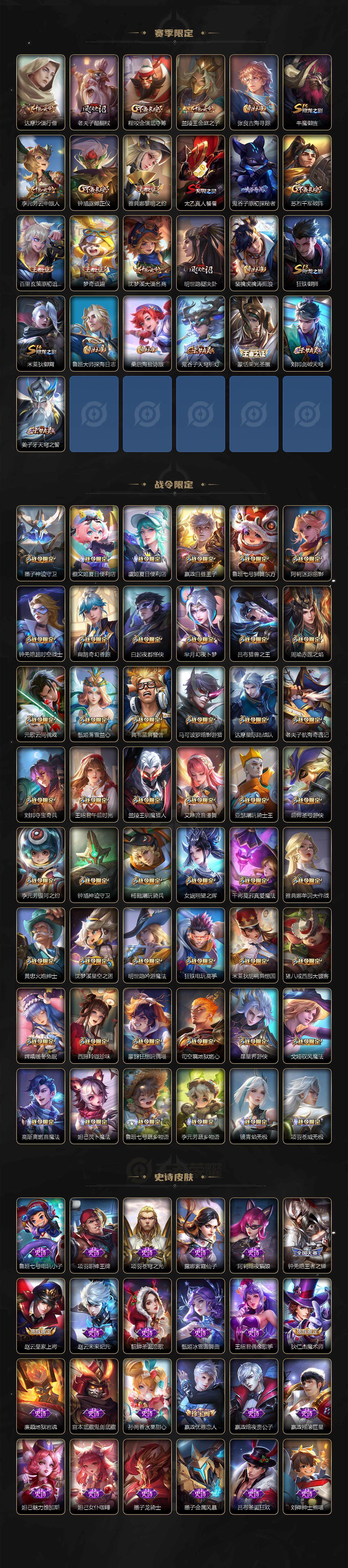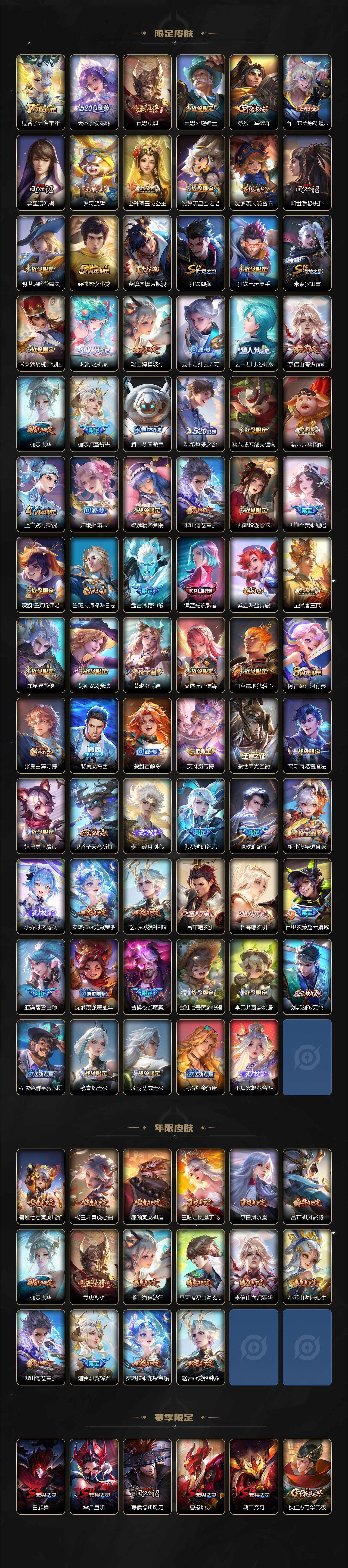 裴擒虎李小龙,上官婉儿梁祝,吕布御风骁将,黄忠烈魂,伽罗太华,王昭君凤凰于飞,项羽霸王别姬,小乔纯白花嫁,孙悟空大圣娶亲,孙悟空至尊宝,裴擒虎梅西,妲己热情桑巴,芈月白晶晶,猪八戒猪悟能,廉颇寅虎·御盾,孙尚香异界灵契,孙悟空孙行者,甄姬女儿国国王,镜匿光追影者,韩信傲雪梅枪,鲁班七号寅虎·瑞焰,杨玉环寅虎·心曲,云中君时之祈愿,瑶时之祈愿,女娲补天,赵云百木心枪,公孙离玉兔公主,露娜启示之音,夏侯惇匿光决锋者,后羿无尽星芒,金蝉唐三藏,娜可露露前尘镜,妲己时之奇旅,王昭君星穹之声,不知火舞绯月行,盾山梦圆繁星,墨子降魔,马可波罗山海·玄木吟,盘古冰霜神祇,瑶山海·碧波行,西施至美·乘鲤谣,甄姬至美·化雀舞,夏侯惇霜北刀,桑启鸣野蒿,艾琳陌上桑,王昭君映山客,澜愿照·九州拓,蔡文姬愿照·福禄聚,虞姬愿照·岁时盈,妲己愿照·众生和,女娲愿照·千秋盛