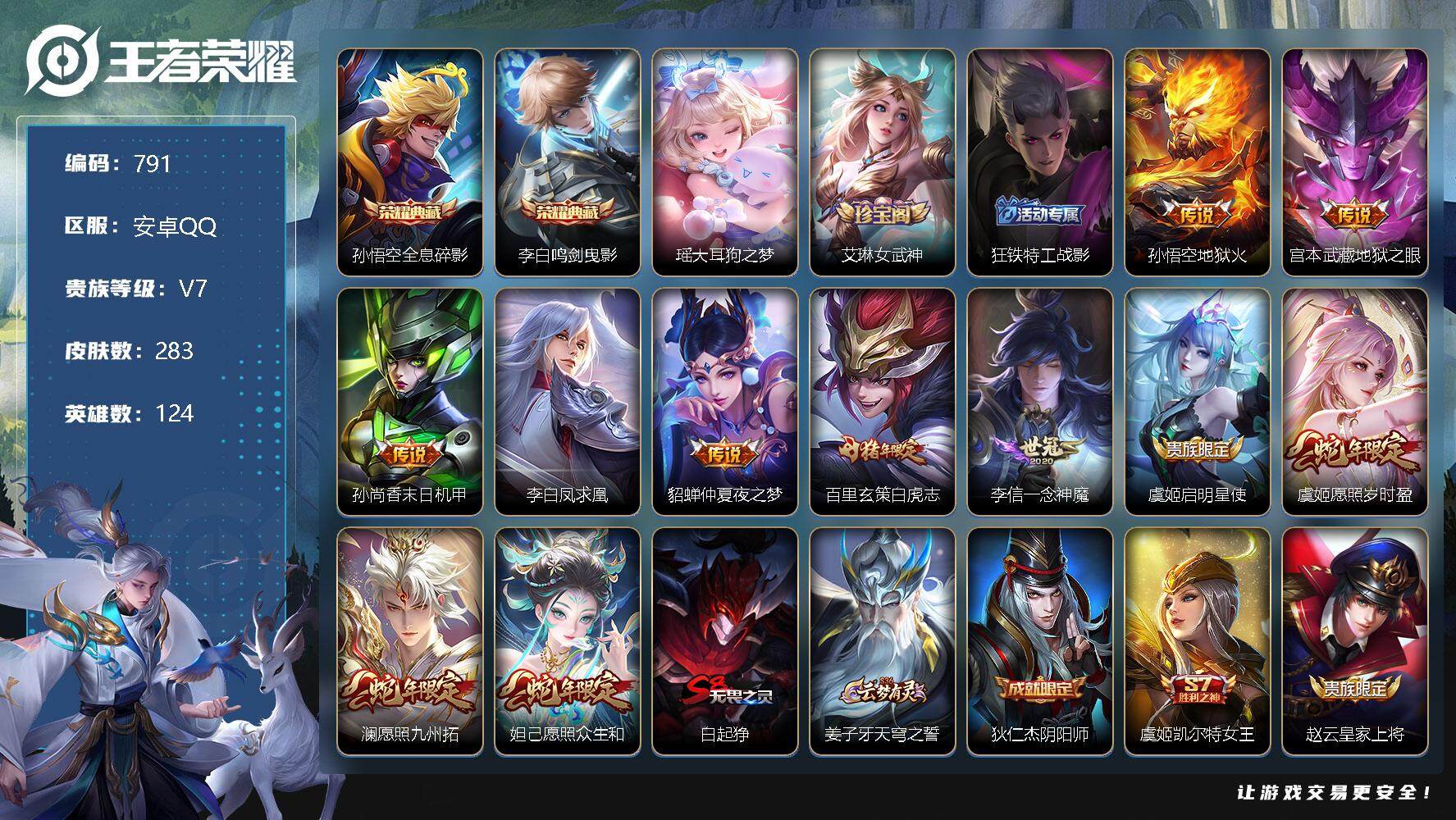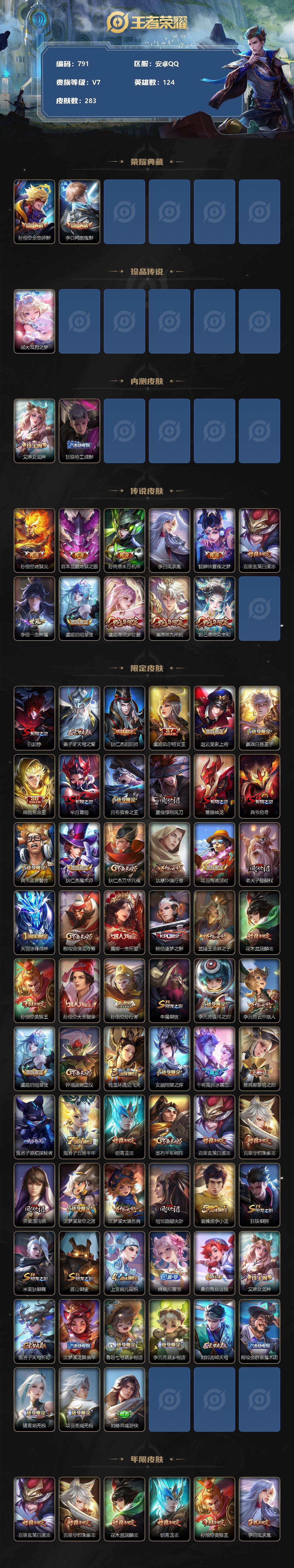 [11131674]【商品标题】:安卓Q-V7-最强王者段位-124英雄-283皮肤-2典藏-0珍品无双-0无双-1珍品传说-11传说-68史诗