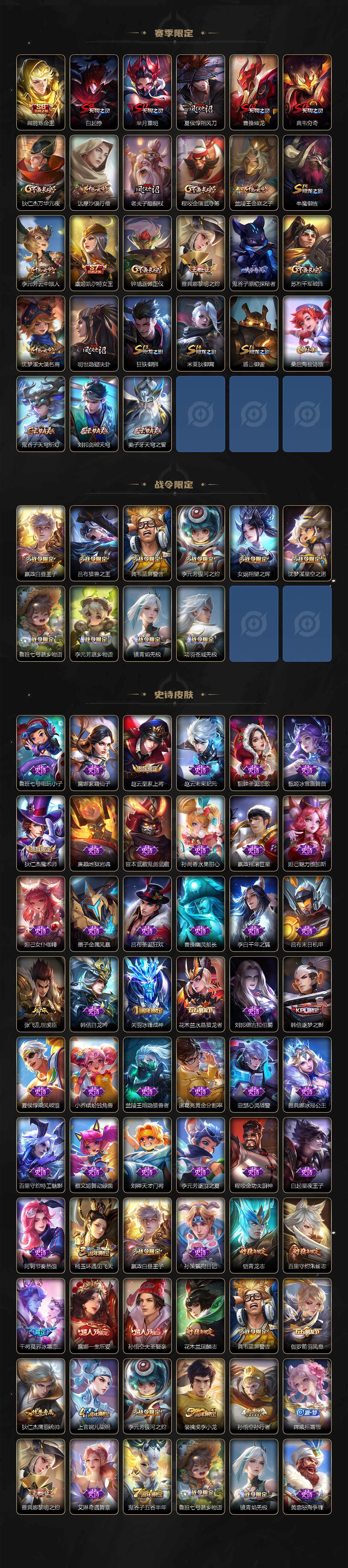 【赛季限定】:扁鹊炼金王,白起狰,芈月重明,夏侯惇朔风刀,曹操烛龙,典韦穷奇,狄仁杰万华元夜,达摩沙漠行僧,老夫子醍醐杖,程咬金演武夺筹,兰陵王金庭之子,牛魔御旌,李元芳云中旅人,虞姬凯尔特女王,钟馗驱傩正仪,雅典娜黎明之约,鬼谷子原初探秘者,苏烈千军破阵,弈星混沌棋,沈梦溪大漠名商,明世隐疑决卦,狂铁御狮,米莱狄御霄,盾山御銮,桑启海盐诗旅,鬼谷子天穹祈灯,刘邦剑破天穹,姜子牙天穹之誓