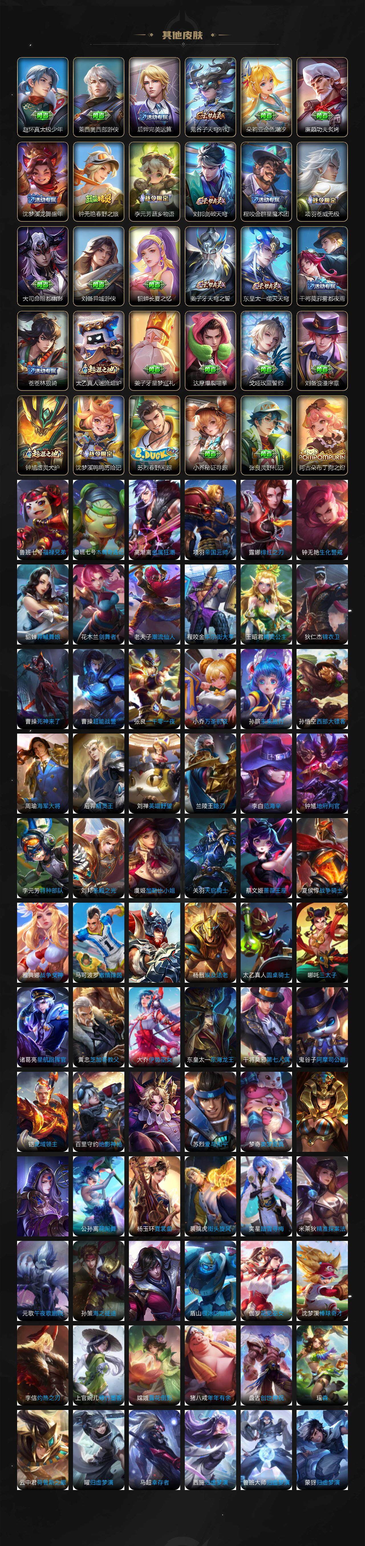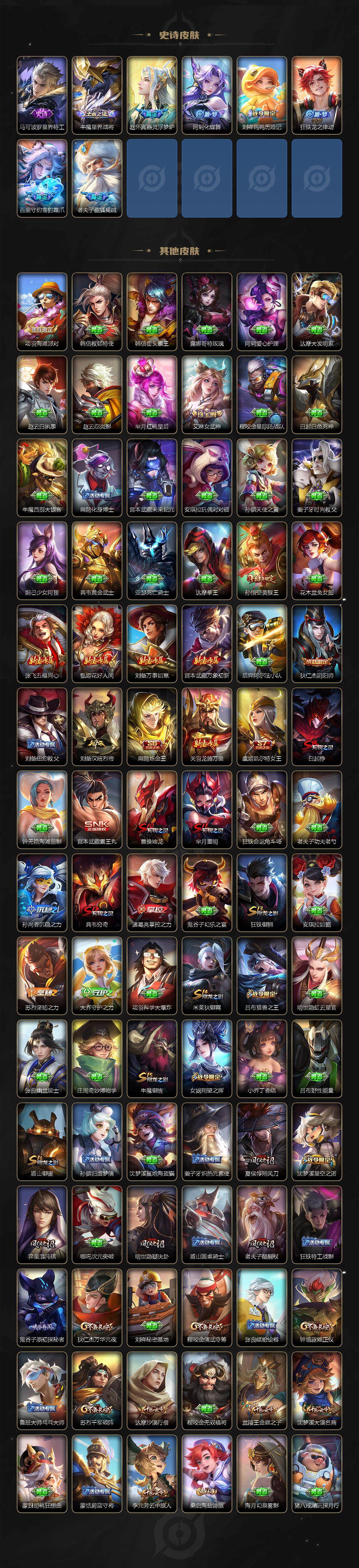 【限定皮肤】:白起狰,姜子牙天穹之誓,狄仁杰阴阳师,虞姬凯尔特女王,赵云皇家上将,嬴政白昼王子,扁鹊炼金王,芈月重明,吕布猎兽之王,夏侯惇朔风刀,曹操烛龙,典韦穷奇,典韦蓝屏警告,狄仁杰魔术师,狄仁杰万华元夜,达摩沙漠行僧,项羽海滩派对,老夫子醍醐杖,关羽冰锋战神,程咬金演武夺筹,露娜一生所爱,韩信逐梦之影,兰陵王金庭之子,花木兰瑞麟志,孙悟空美猴王,孙悟空大圣娶亲,孙悟空孙行者,牛魔御旌,李元芳银河之约,李元芳云中旅人,虞姬启明星使,钟馗驱傩正仪,杨玉环遇见飞天,女娲朔望之晖,干将莫邪冰霜恋舞曲,雅典娜黎明之约,鬼谷子原初探秘者,鬼谷子五谷丰年,铠青龙志,苏烈千军破阵,百里玄策白虎志,百里守约朱雀志,弈星混沌棋,沈梦溪星空之诺,沈梦溪大漠名商,明世隐疑决卦,裴擒虎李小龙,狂铁御狮,米莱狄御霄,盾山御銮,上官婉儿梁祝,嫦娥拒霜思,桑启海盐诗旅,艾琳女武神,鬼谷子天穹祈灯,沈梦溪龙舞盛年,鲁班七号蔬乡物语,李元芳蔬乡物语,刘邦剑破天穹,程咬金群星魔术团,镜青焰无极,项羽苍威无极,刘备异域游侠